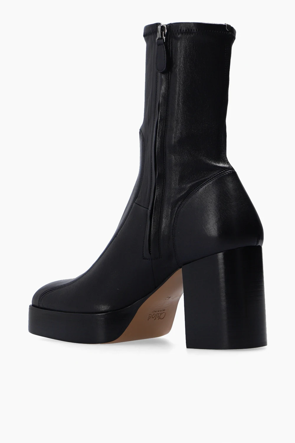 Czarne botki na platformie, model ‘Izzie’ Chloé. Wykonane ze skóry. Zapinane z boku na zamek. Beżowa, skórzana podeszwa.