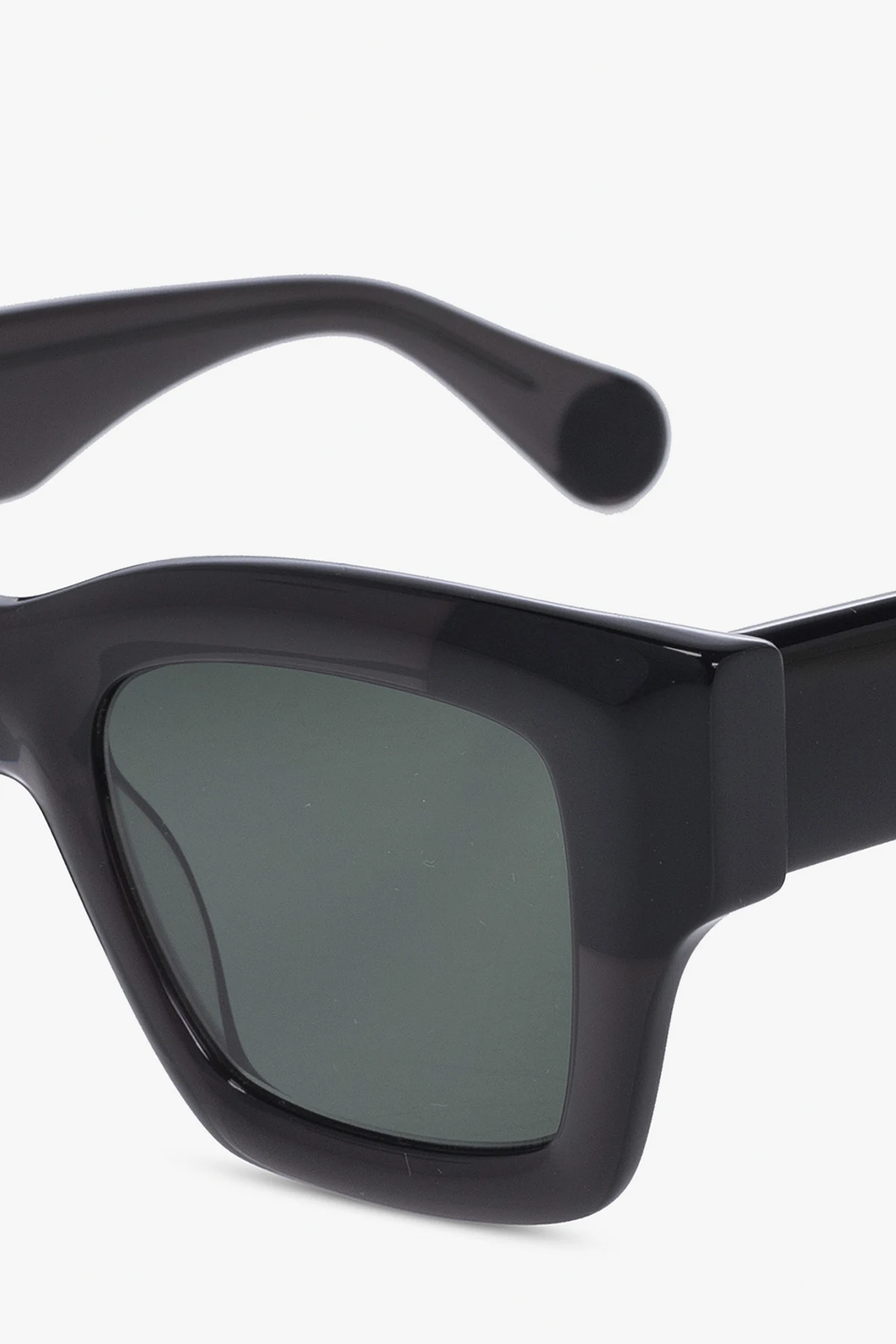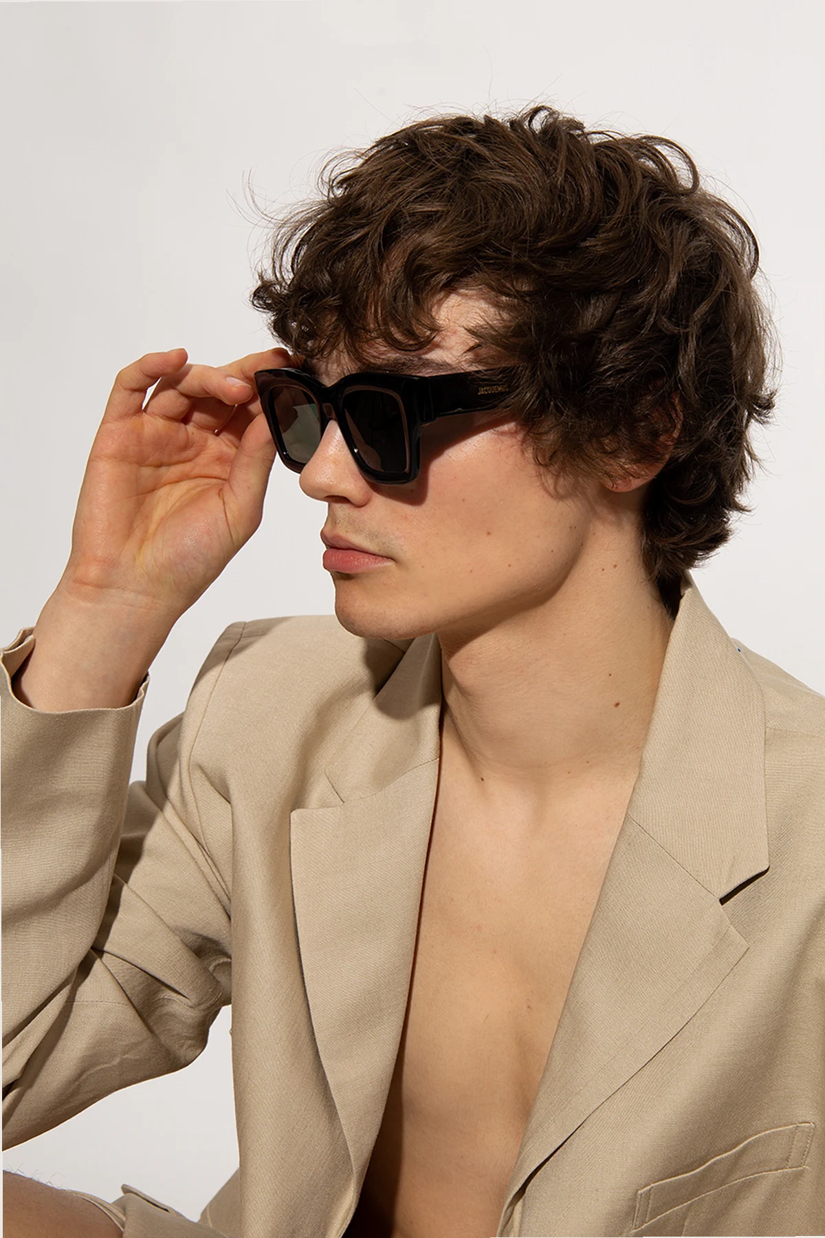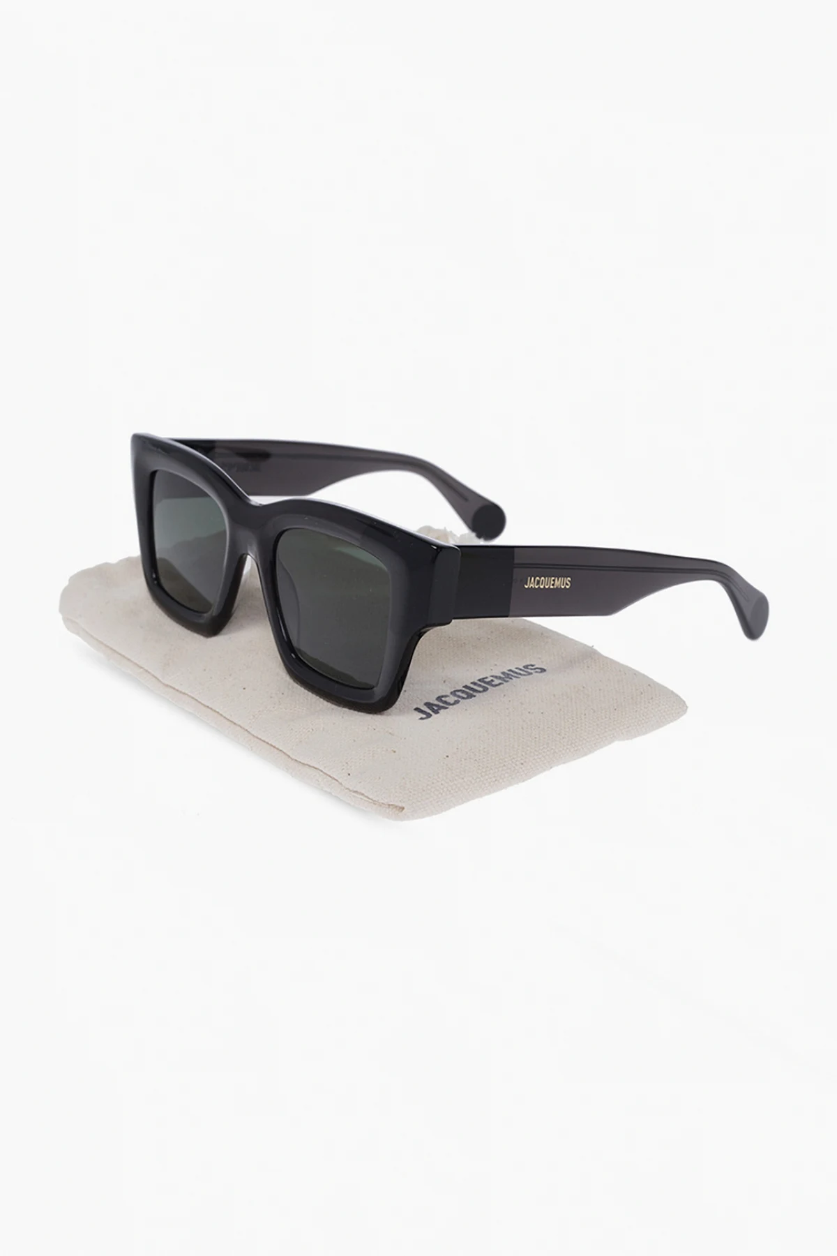 Czarne okulary przeciwsłoneczne, model ‘Baci’ Jacquemus. Po bokach ozdobione logo w kolorze srebrnym. Zielone, certyfikowane soczewki 100% UVA/UVB. Dołączone etui.