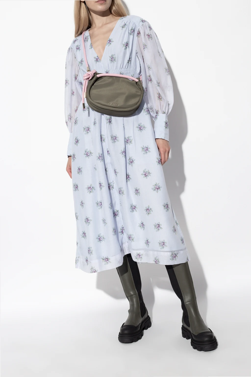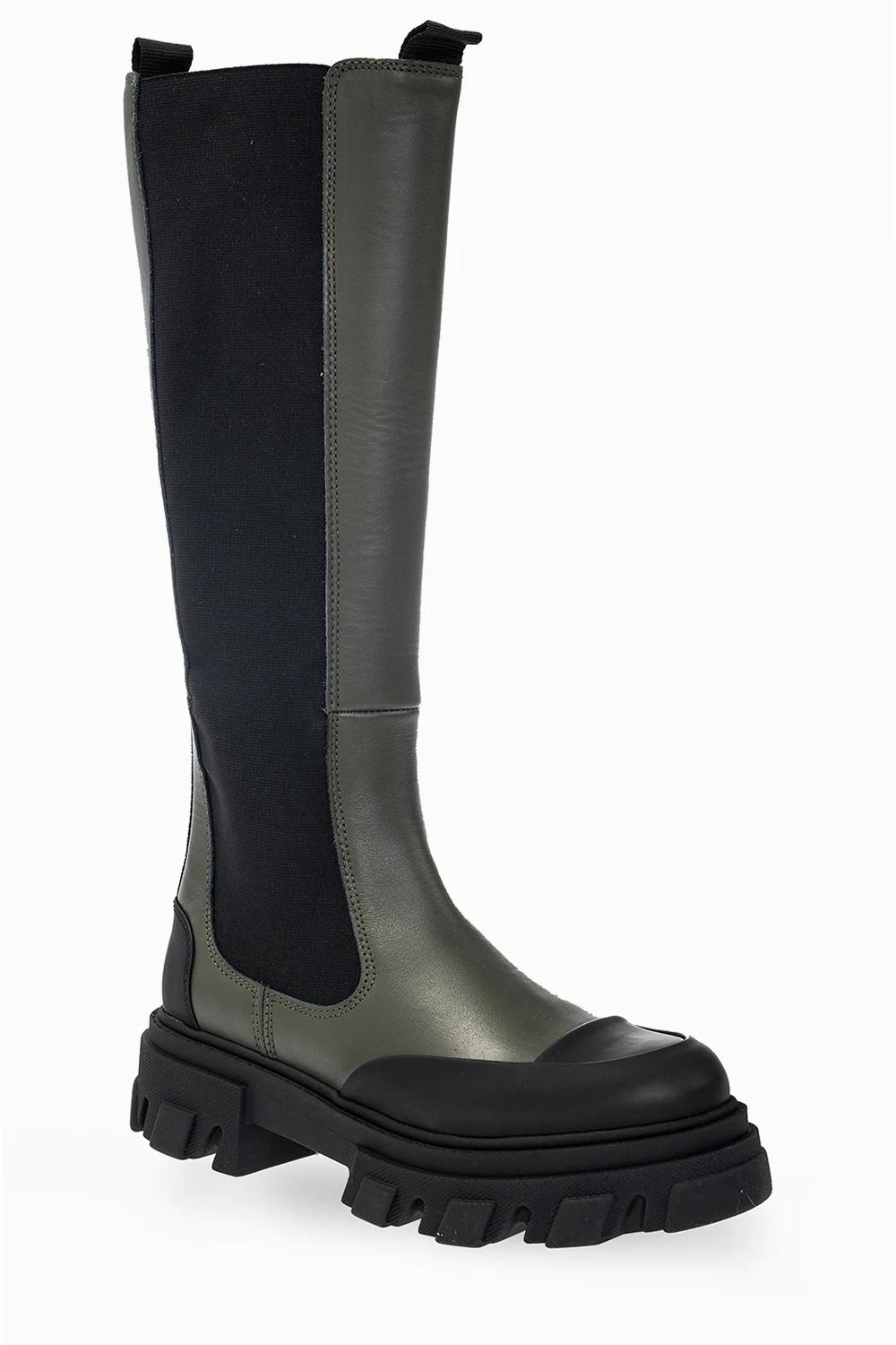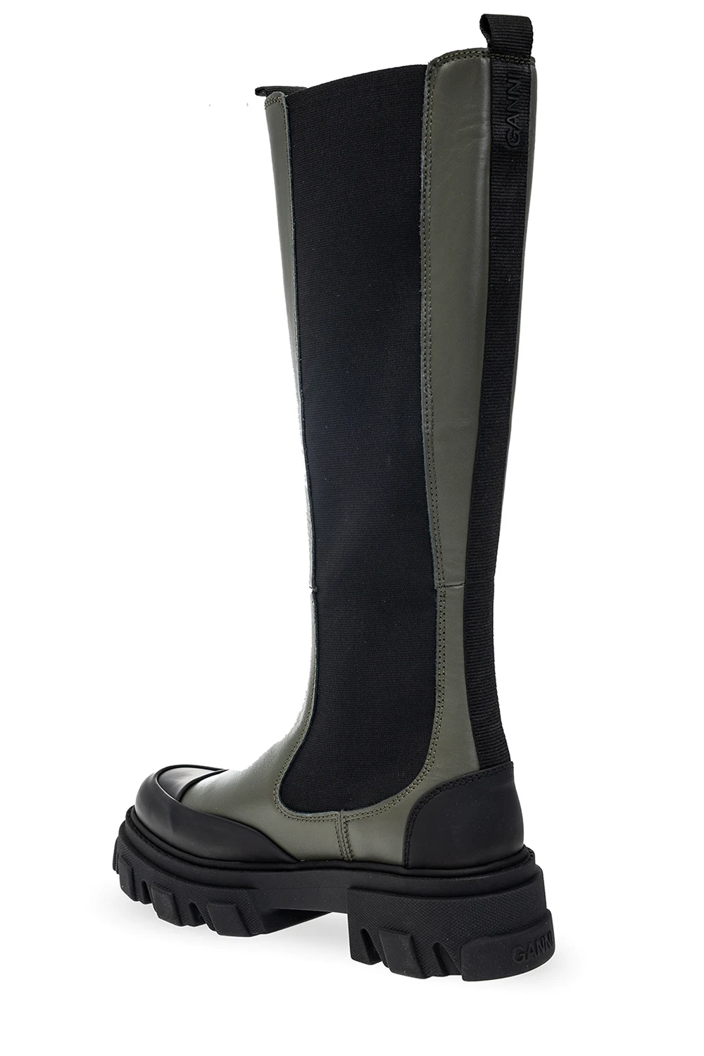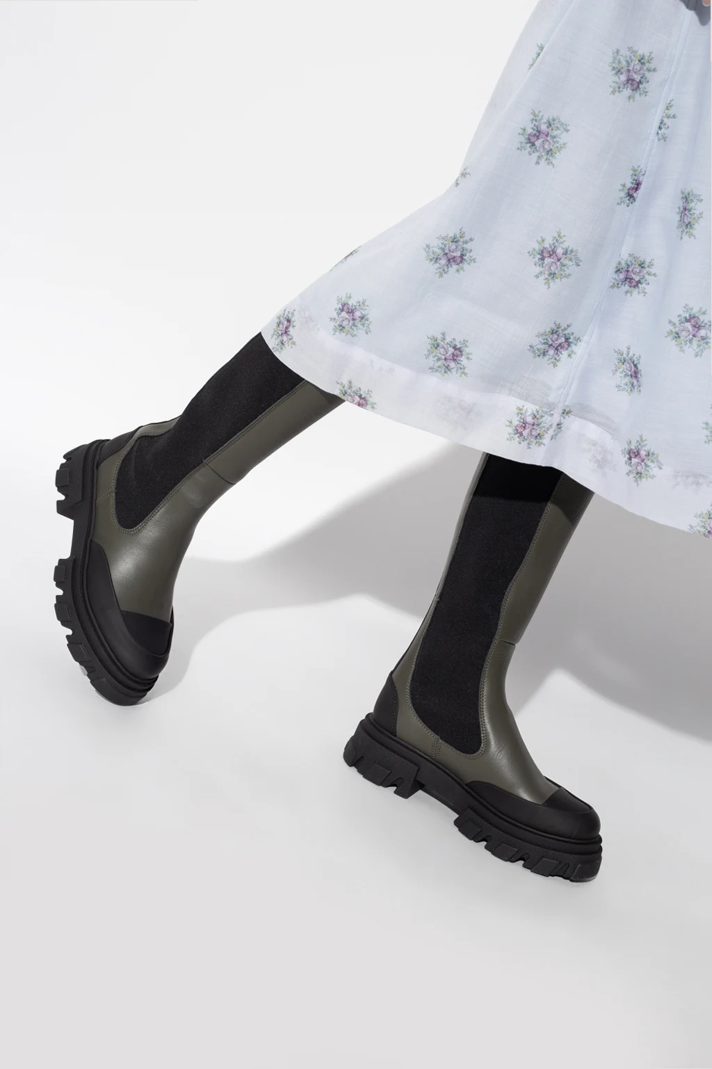 Zielono-czarne, sznurowane buty pod kolano Ganni. Wykonane ze skóry i materiału. Z tyłu czarne logo. Czarna, gumowa podeszwa.