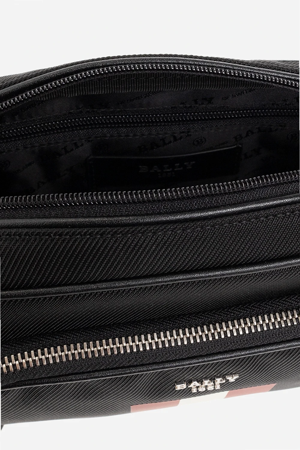 Czarna torba na pas, model ‘Zughorn’ Bally. Zamykana na dwubiegunowy zamek. Z przodu kieszeń zamykana na zamek. Ozdobiona nadrukowanym, charakterystycznym paskiem w kolorze czerwono-biało-czerwonym i metalową aplikacją. Z tyłu wsuwana kieszeń. Pas na pas z możliwością regulacji długości. Wewnątrz komora, wsuwana kieszeń i zamykana na zamek. Metalowe elementy w kolorze srebrnym.