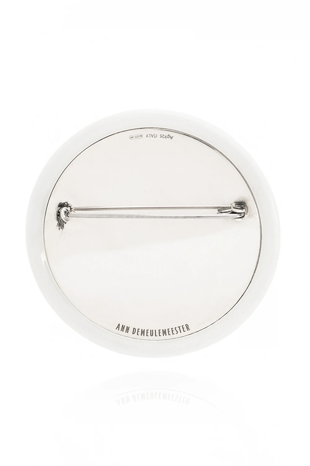Biała przypinka Ann Demeulemeester. Wykonana z emalii oraz srebra o próbie 925. Ozdobiona czarnym logo.