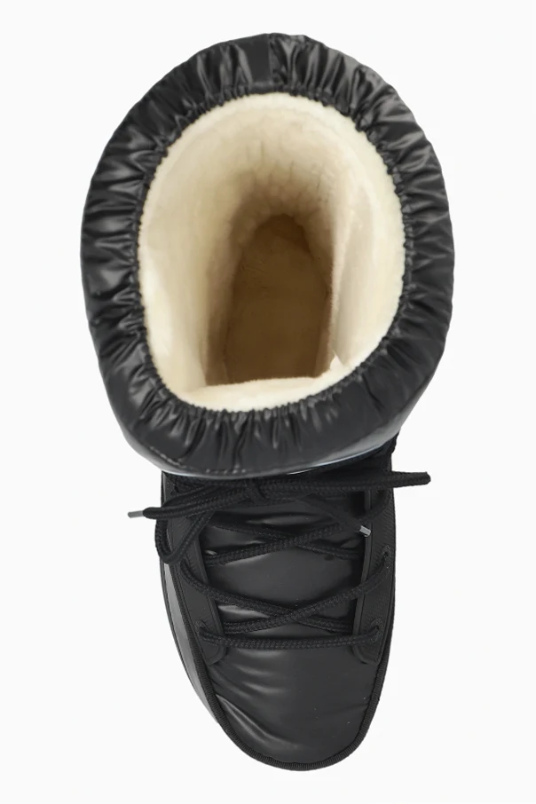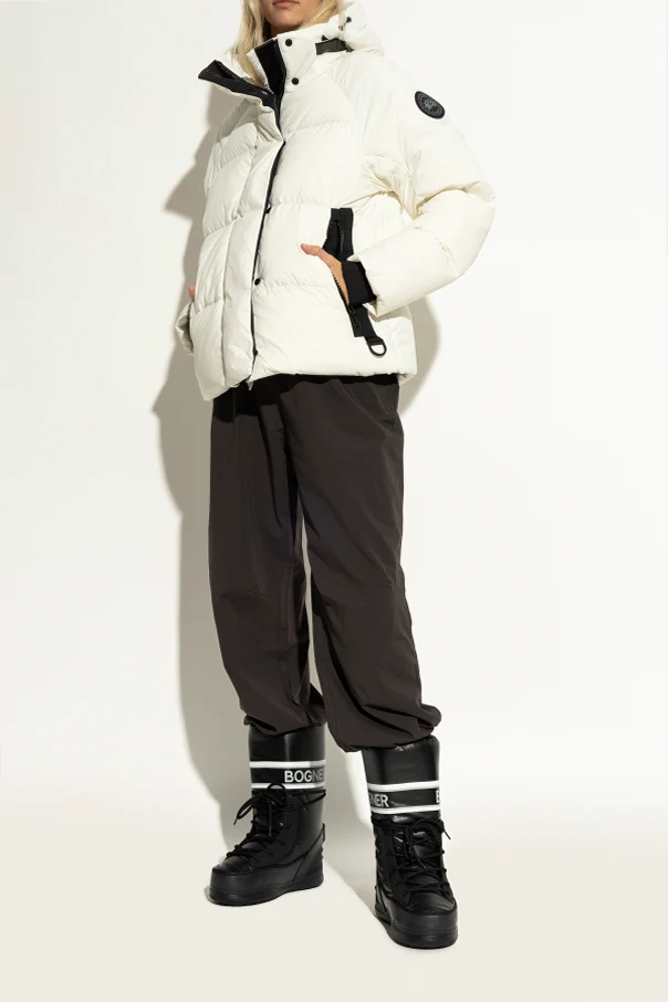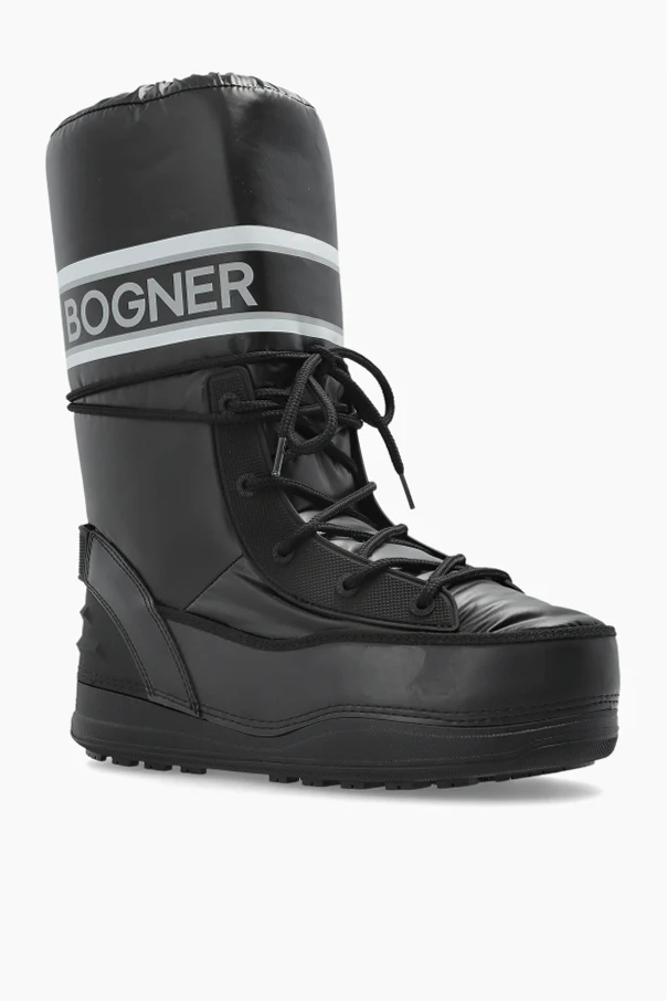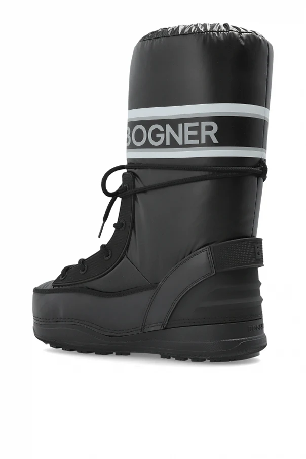Śniegowce z logo BOGNER to kunsztowna propozycja dla wymagających. Wyróżniają się wysoką, cylindryczną cholewką sięgającą do połowy łydki, podkreśloną szerokim otworem na górze. Subtelny połysk syntetycznego wierzchu doskonale współgra z dominującą czernią, którą elegancko przełamuje poziomy, biały pas z wyrazistym logo projektanta.