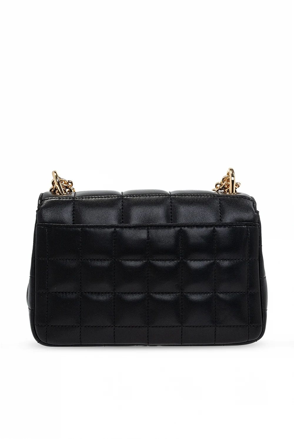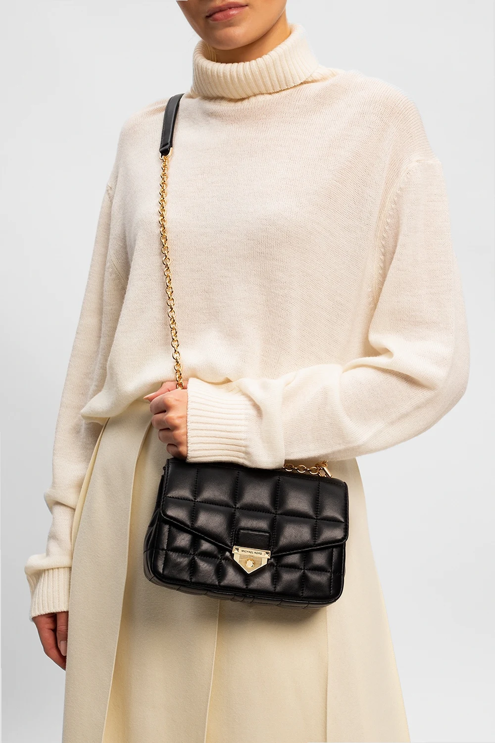Czarna, pikowana torba na ramię, model ‘Soho’ Michael Michael Kors, rozmiar 'small'. Wykonana ze skóry jagnięcej. Zamykana na dekoracyjne zapięcie. Ozdobiona przeszyciami oraz wygrawerowanym logo. Z tyłu kieszeń zamykana na zatrzask. Łańcuch na ramię. Wewnątrz komora z dwiema przegrodami, wsuwana kieszeń i dwie kieszenie zamykane na zamek. Metalowe elementy w kolorze złotym.
