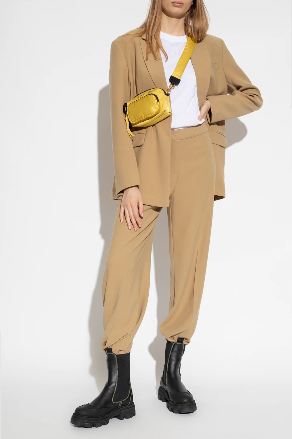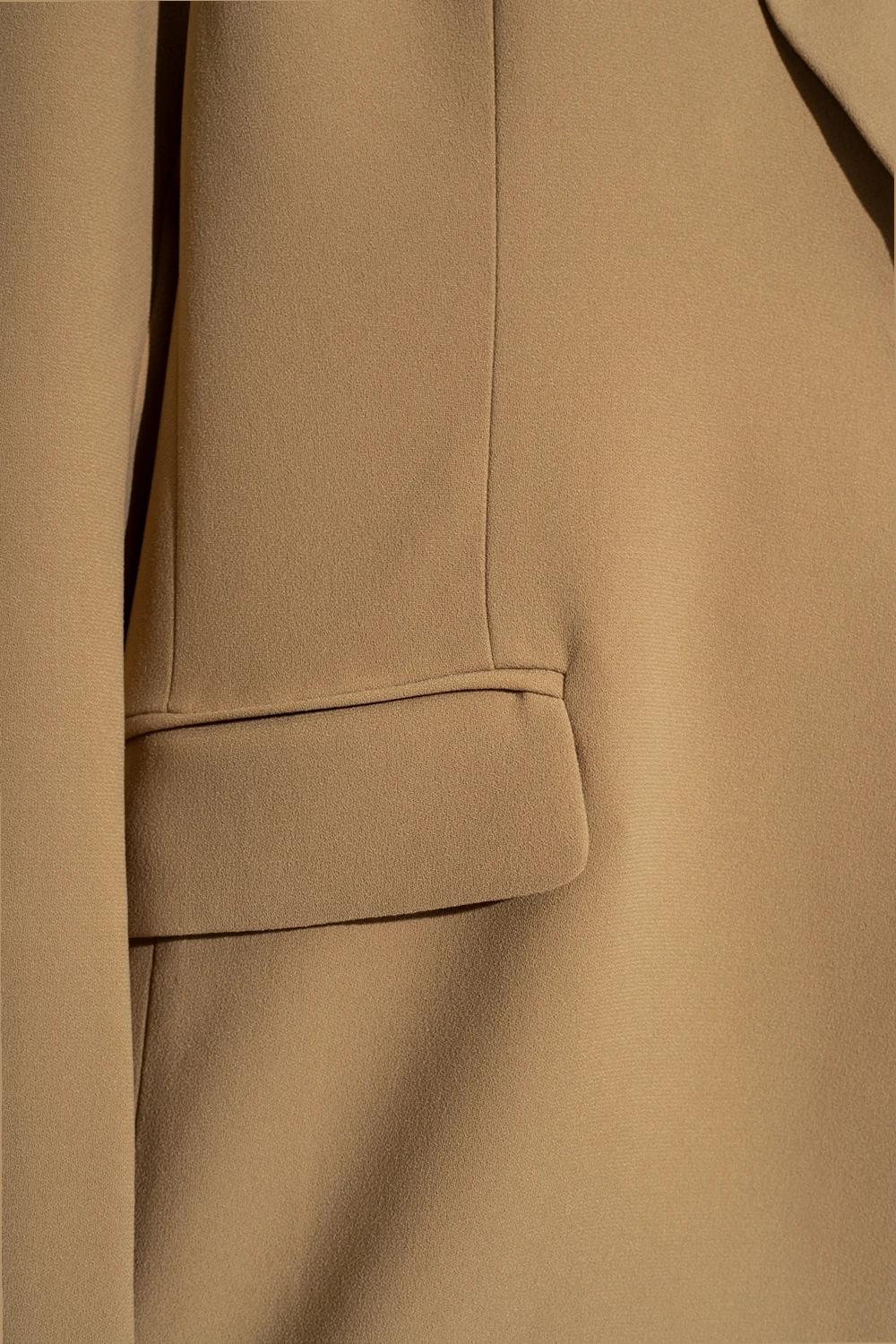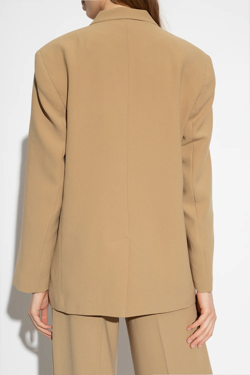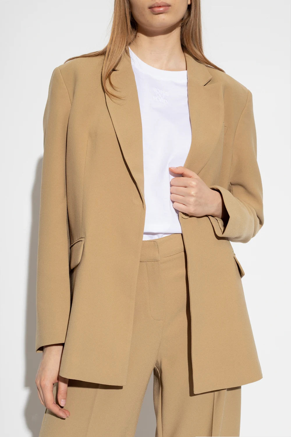 Beżowa marynarka typu ‘oversize’ z otwartymi klapami, model 'Oliana’ Notes Du Nord. Zapinana na zatrzask. Z przodu trzy kieszenie, dwie z patką. Długie rękawy. Z tyłu pojedyncze rozcięcie.