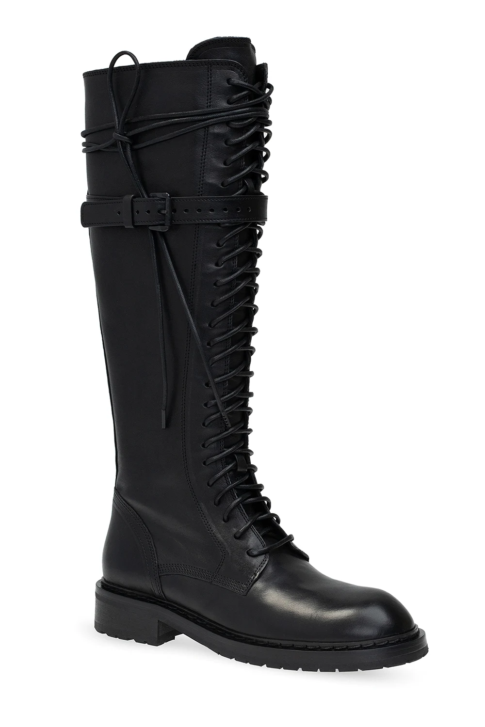 Czarne, sznurowane kozaki Ann Demeulemeester. Wykonane ze skóry. Z boku zapinane na zamek i pasek z klamrą. Czarna podeszwa wykonana ze skóry i gumy.