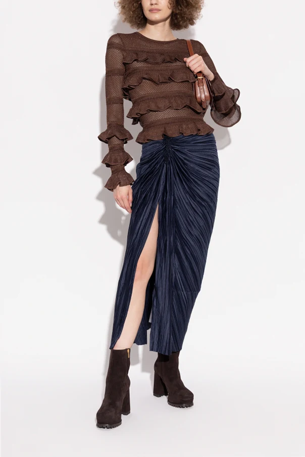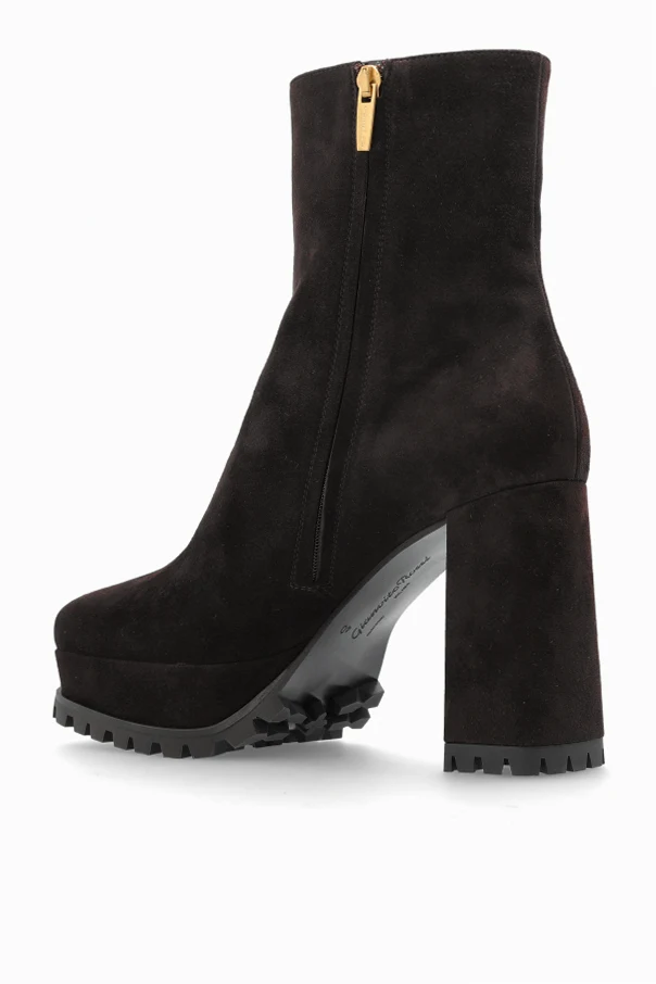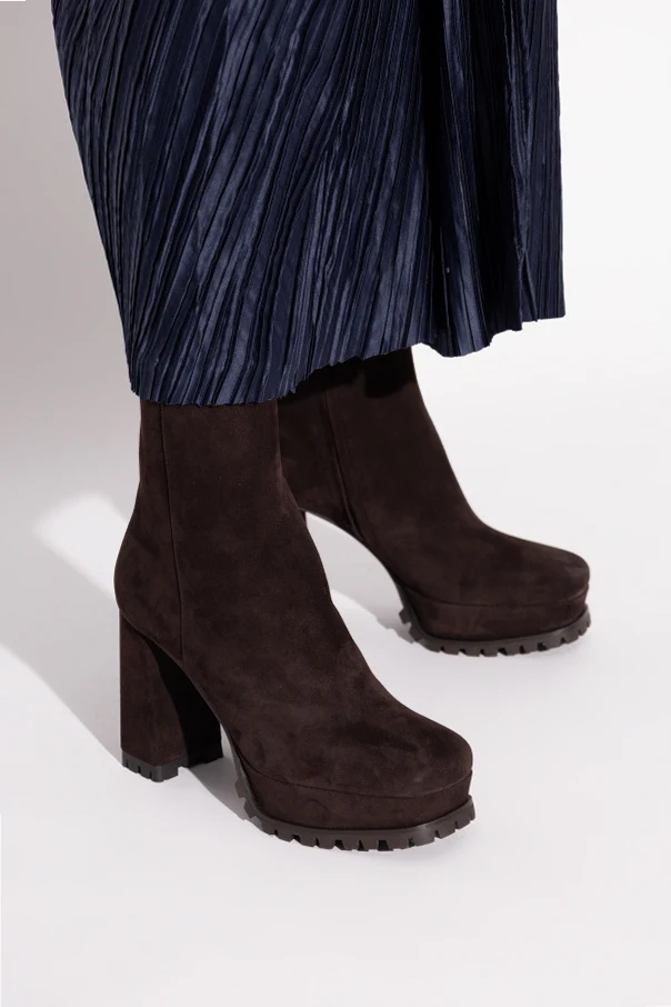 Obuwie wykonane z mięsistego, brązowego zamszu o ekskluzywnej fakturze. Stabilny, masywny obcas oraz platforma akcentowane są przez grubą, gumowaną podeszwę z wyrazistym bieżnikiem, co znacząco wydłuża sylwetkę oraz nadaje pewność kroku. Wnętrze wyściełane jest wysokogatunkową skórą , a subtelne, złote logo projektanta inkrustowane na cholewce dodaje całości szlachetności.