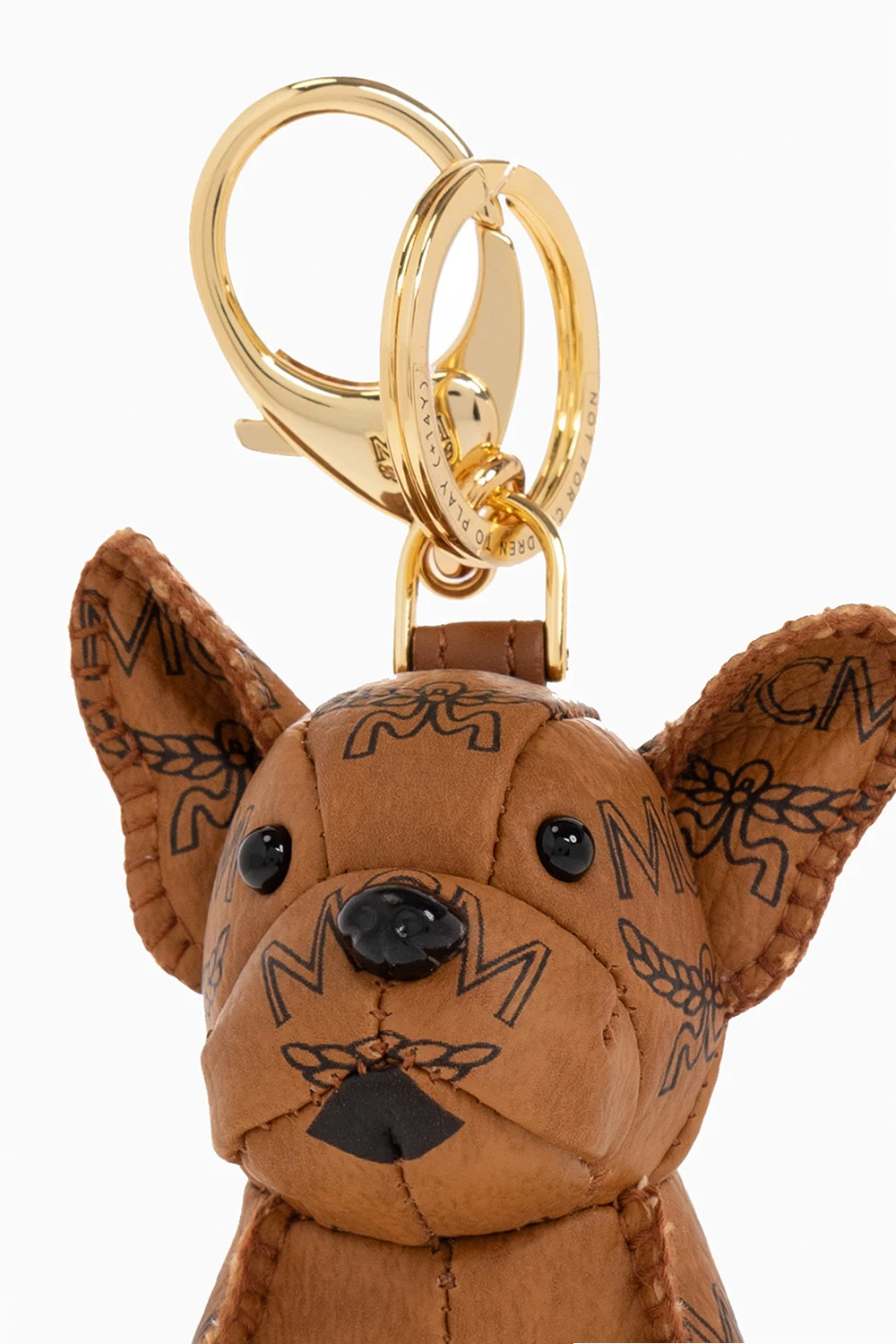 Brązowy brelok, model ‘M Pup’ MCM. Wykonany z imitacji skóry. Zawieszka w kształcie charakterystycznego dla marki buldoga francuskiego, ozdobionego czarnym wzorem z logo ‘Visetos’. Metalowe, pozłacane elementy w kolorze złotym. Wykończony karabińczykiem.