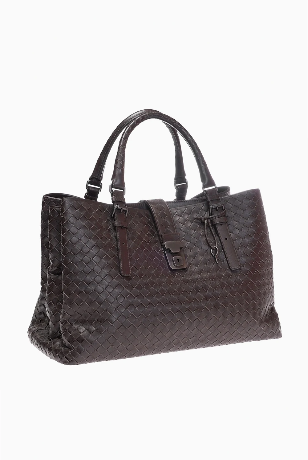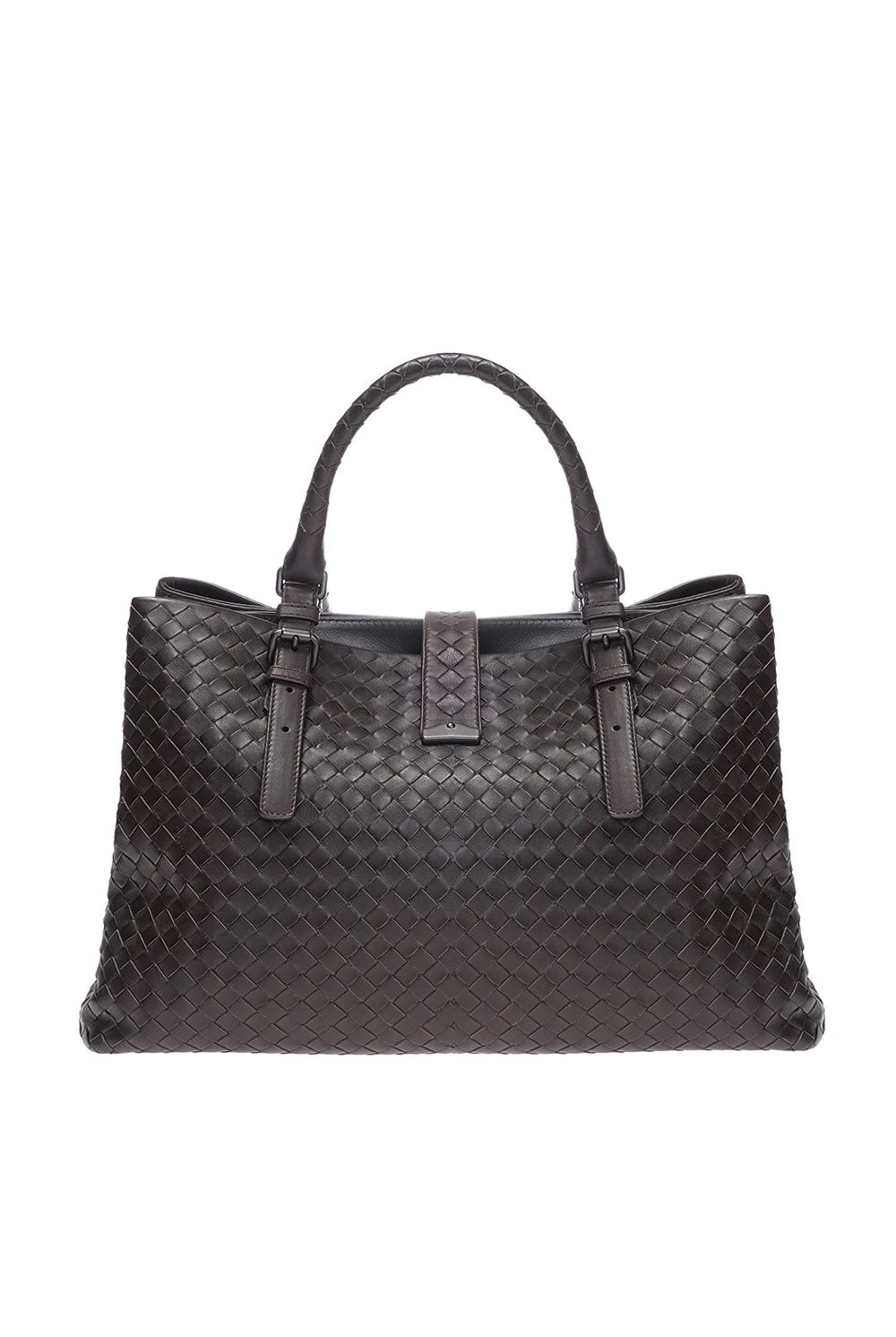 Torba 'Roma' Bottega Veneta w dużym rozmiarze, w kolorze brązowym. Wykonana ze skóry cielęcej, w środku wykończona zamszem. Posiada trzy komory, zapinane na zamek z kluczykiem, dodatkowo przegródka w środku zapinana na jest na zatrzask. Mieści format A4. W środku boczna kieszonka zapinana na zamek, przegródka na telefon. Posiada dwie regulowane rączki.