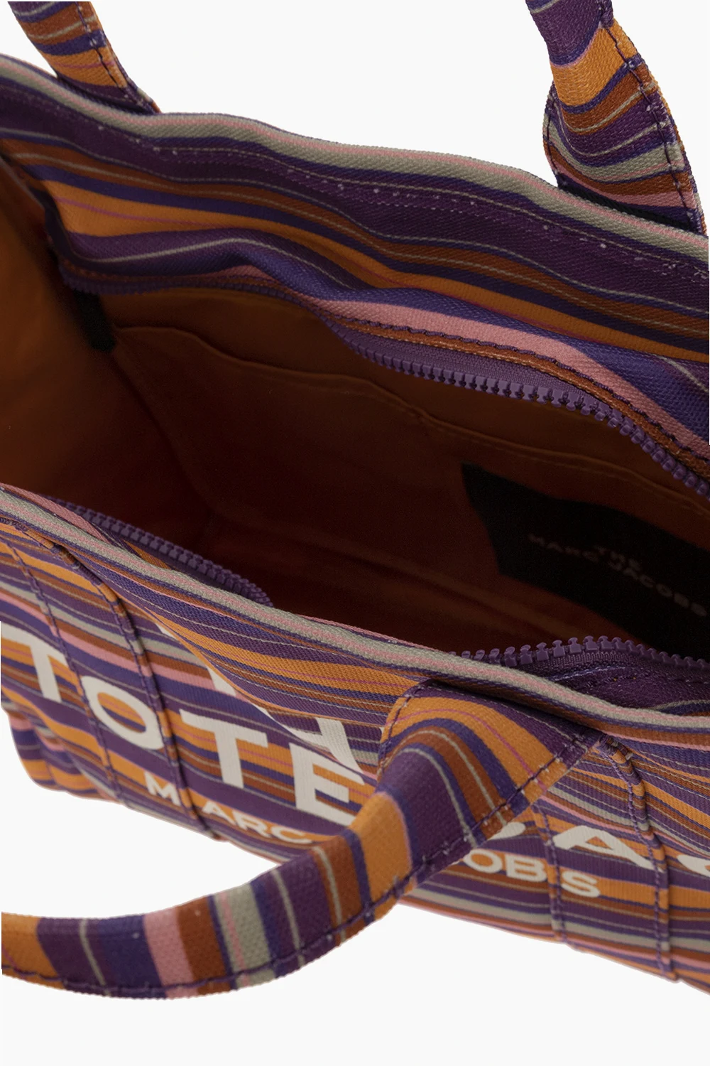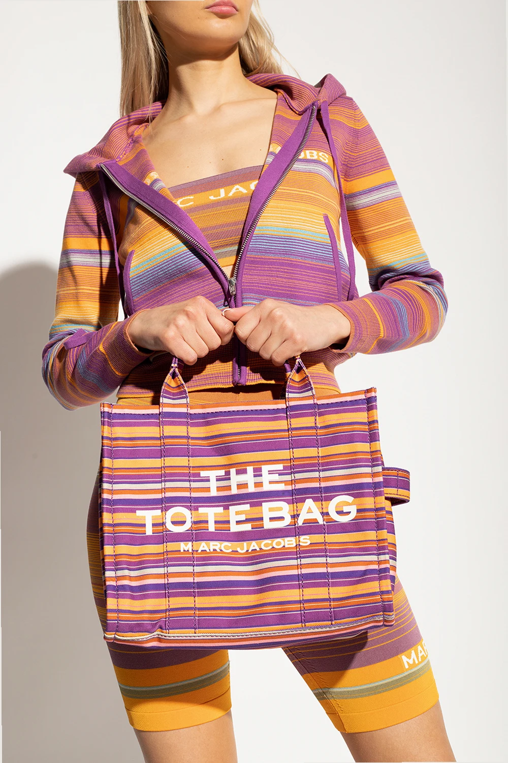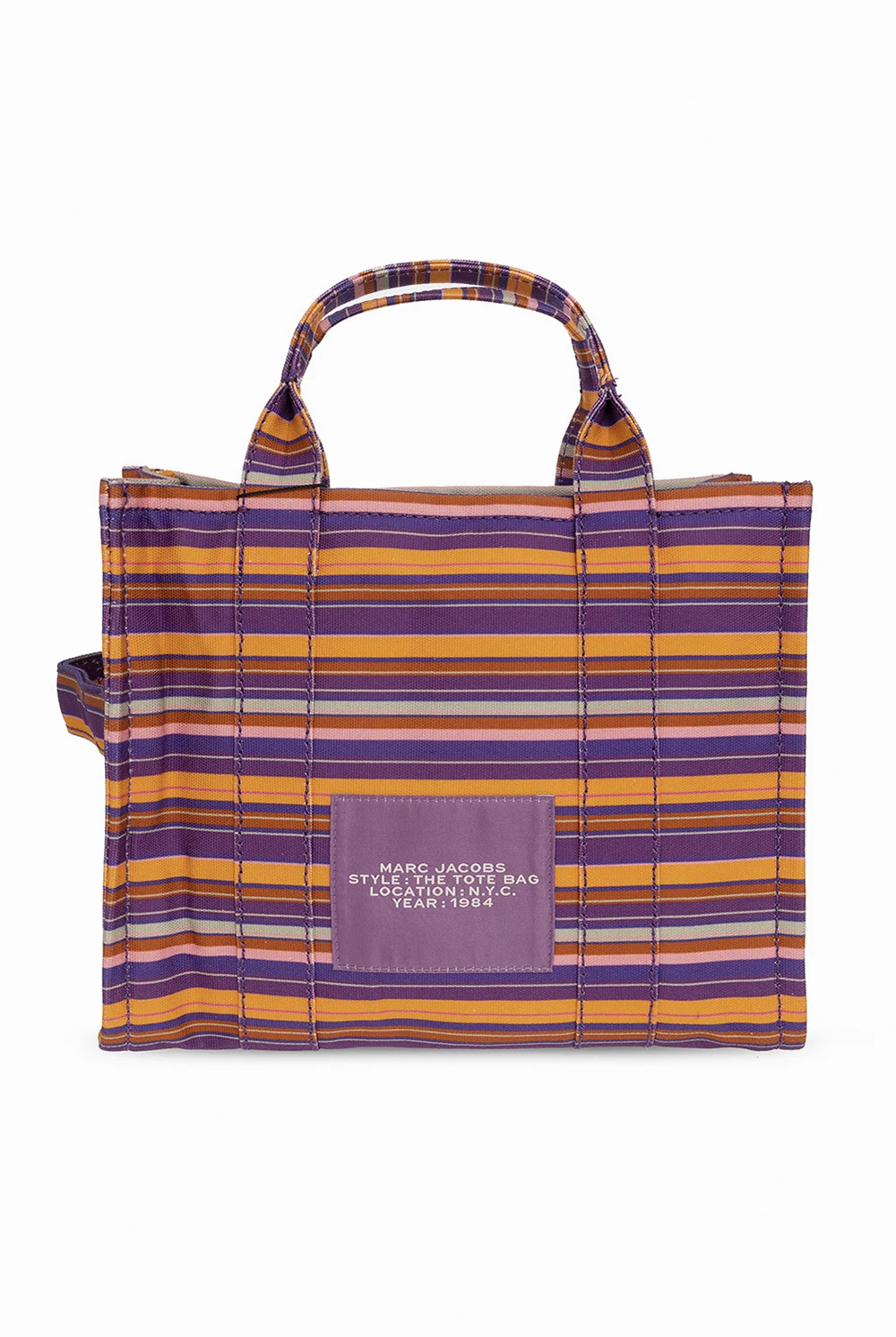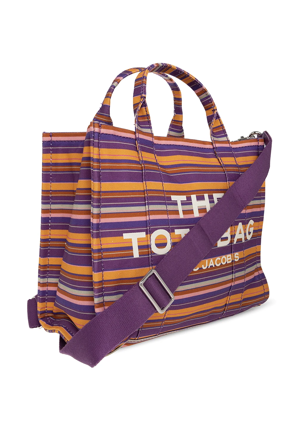 Kolorowa torba na ramię 'The Medium Tote' Marc Jacobs. Wykonana z bawełny. Zamykana na zamek. Ozdobiona wzorem w pasy. Z przodu nadrukowane logo. Z tyłu naszywka z logo. Dwie półokrągłe rączki. Odpinany, regulowany pasek. Wewnątrz komora.