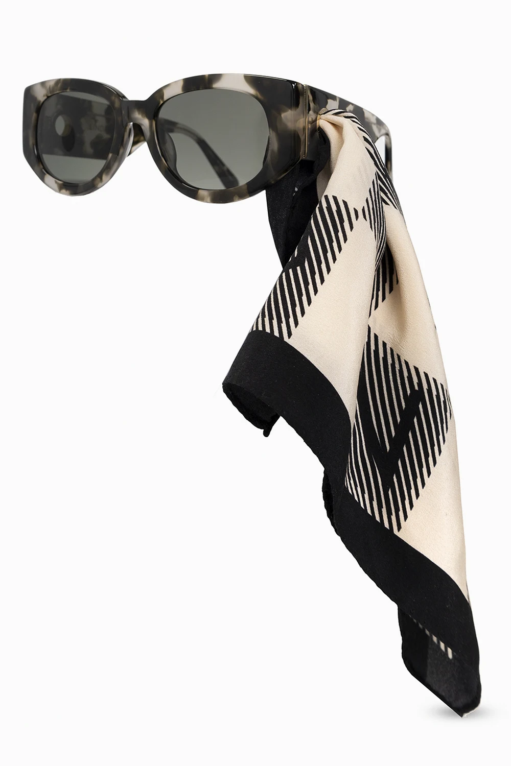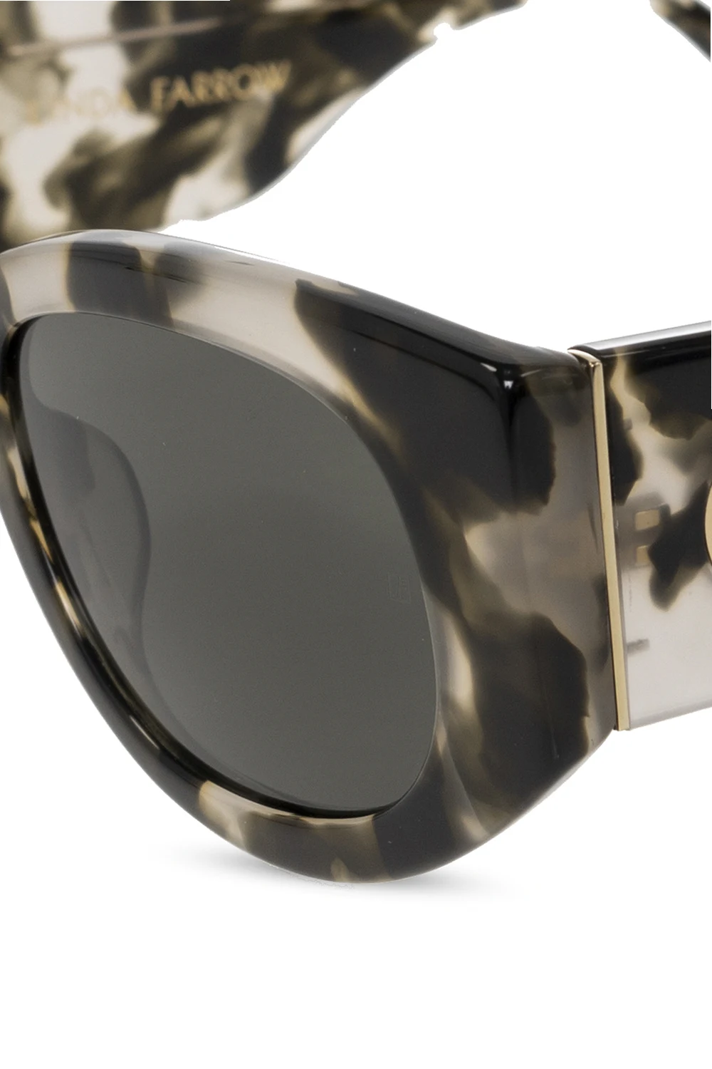 Czarno-szare okulary przeciwsłoneczne, model ‘Debbie’ Linda Farrow. Zaokrąglona oprawka w kształcie litery D. Pozłacane tytanowe oczko osadzone w zauszniku z monogramem „London 1970”. Szare soczewki w technologii ZEISS z ochroną przed odblaskami i 100% ochroną przed promieniowaniem UV. Dołączone etui. Wykonane ręcznie w Japonii.