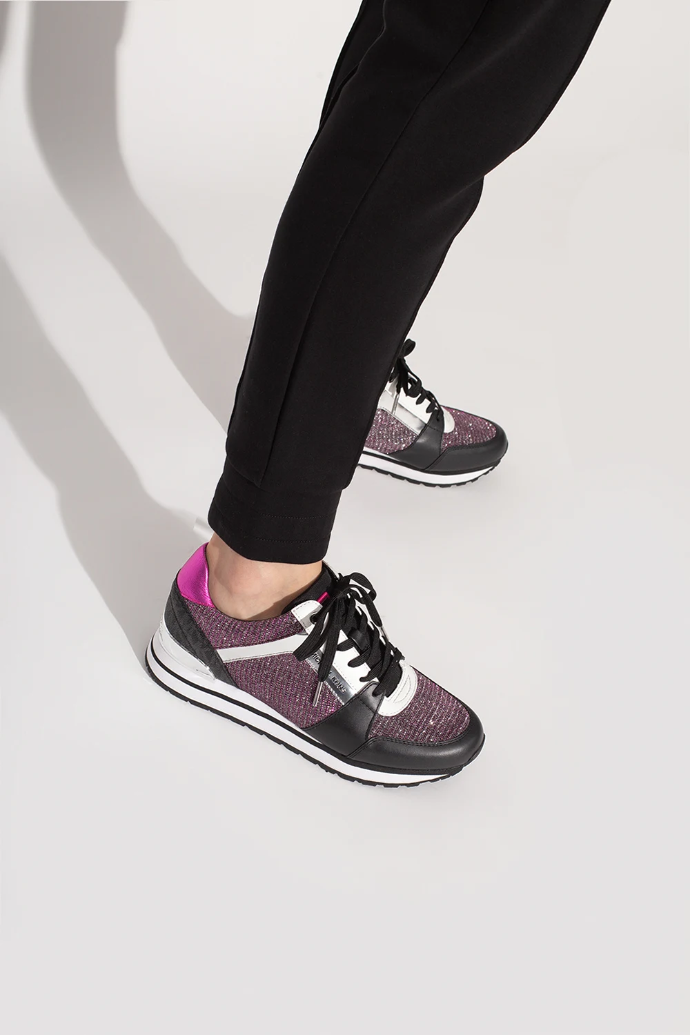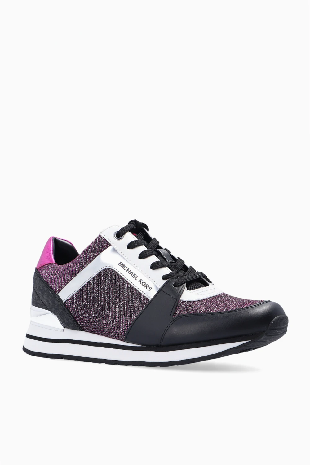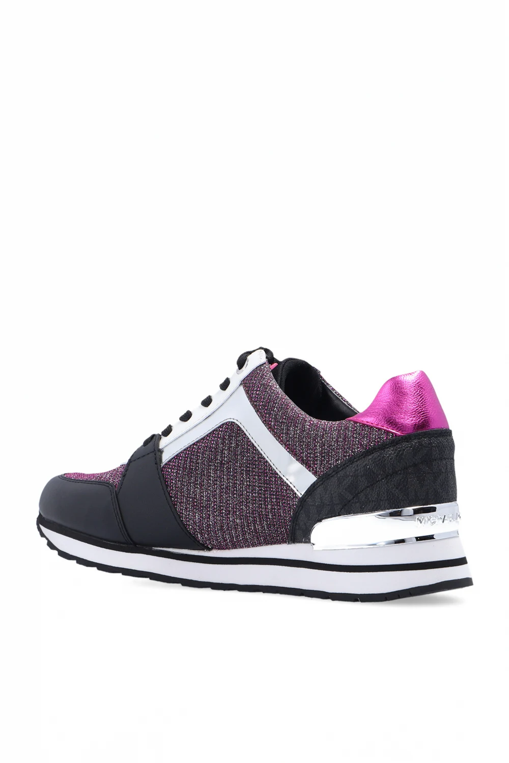Czarno-różowo-białe, sznurowane buty sportowe, model ‘Billie’ Michael Michael Kors. Wykończone skórą w kolorze czarnym oraz metaliczną siateczką w kolorze różowo-srebrnym. Z boku oraz z tyłu logo. Zapiętek ozdobiony wzorem z monogramem 'MK'. Biało-czarna, gumowa podeszwa.