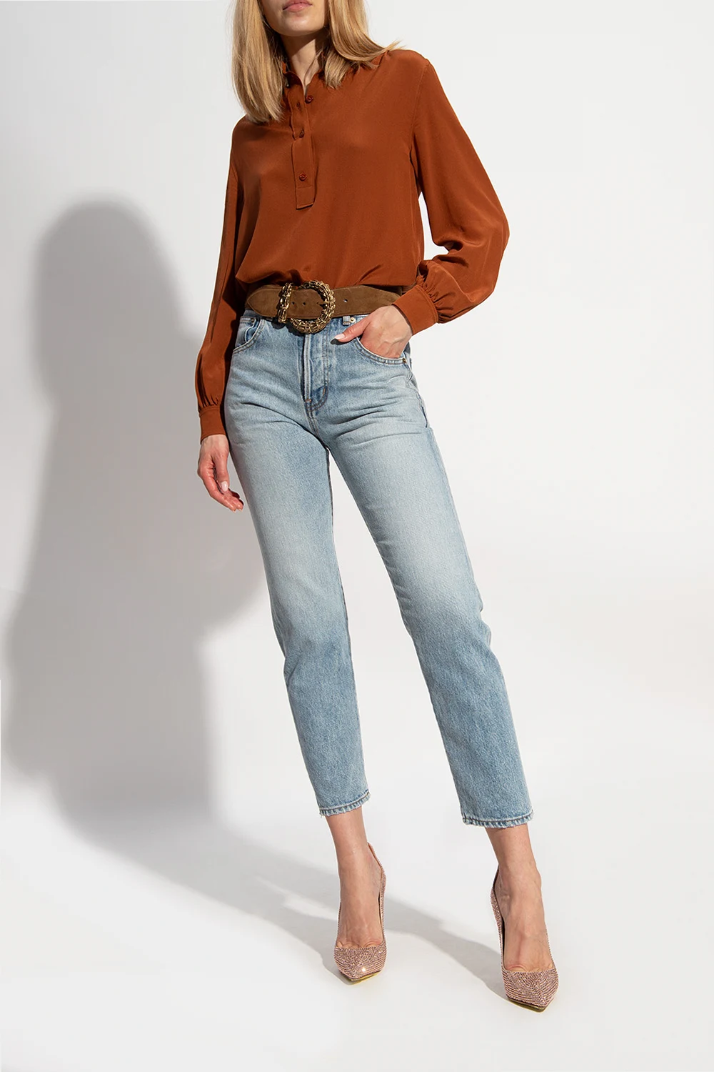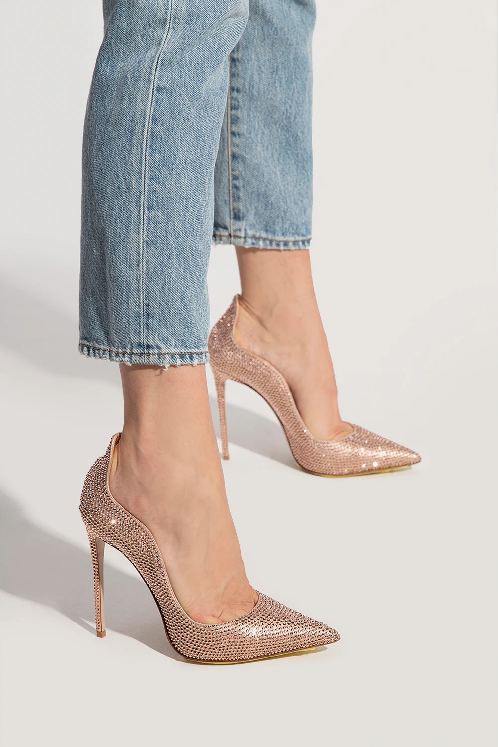 Różowe buty na obcasie, model ‘Ivy’ Le Silla. Wykonane ze skóry. Wykończone kryształami. Nosek w szpic. Beżowa podeszwa wykonana ze skóry i gumy.