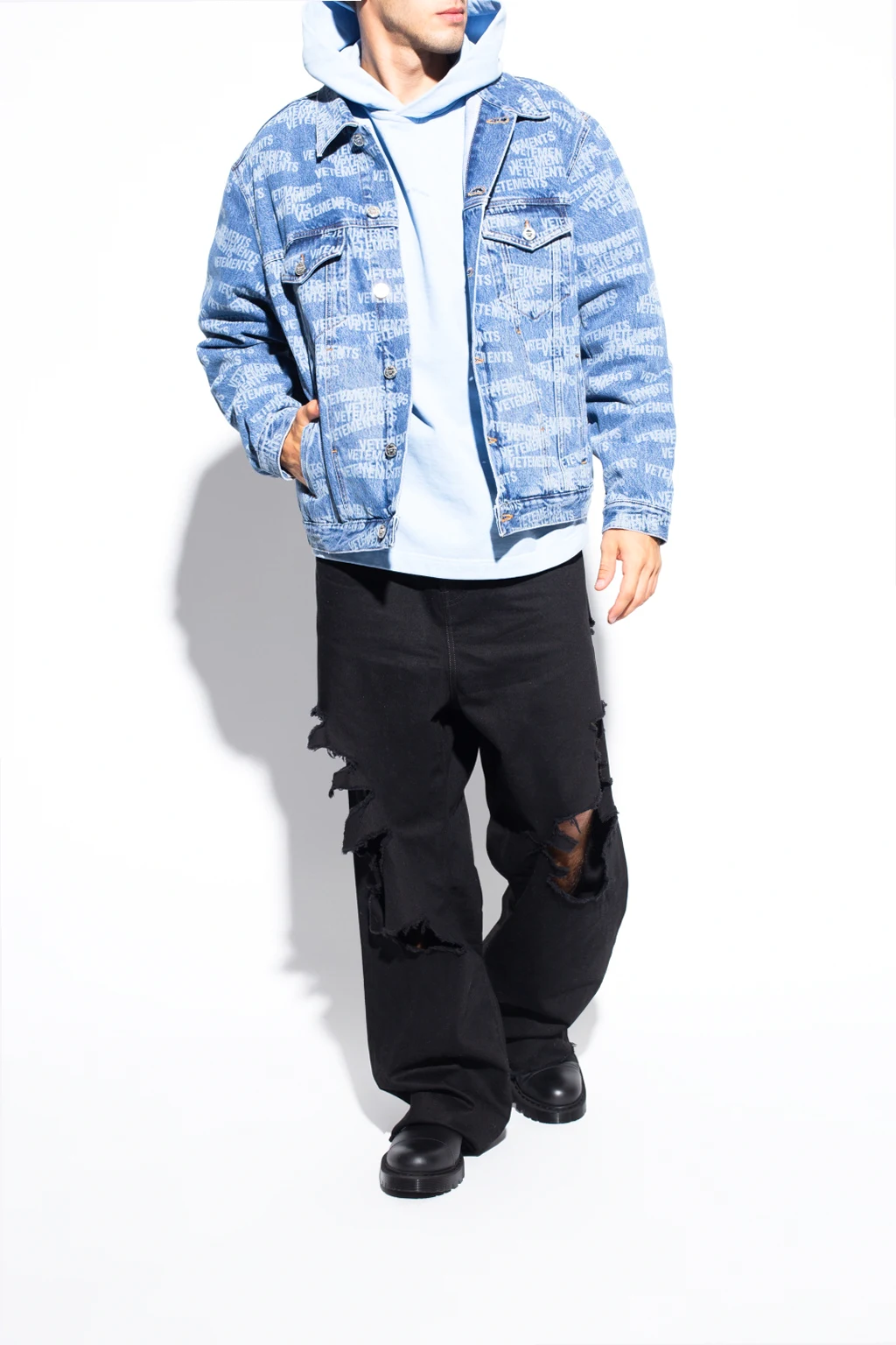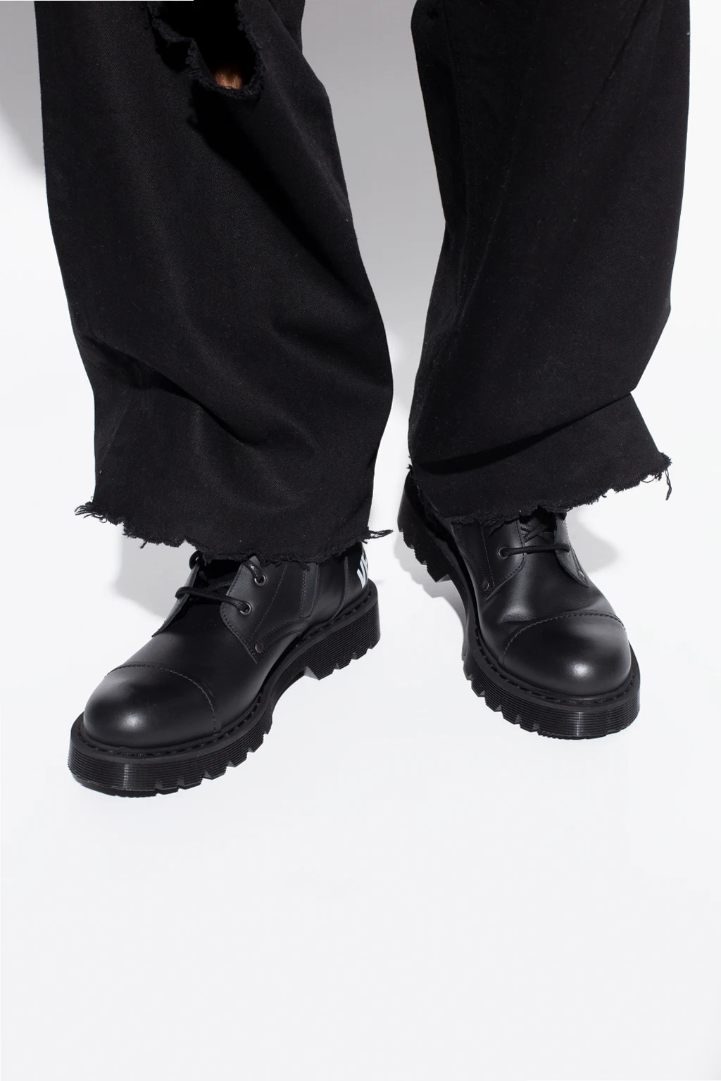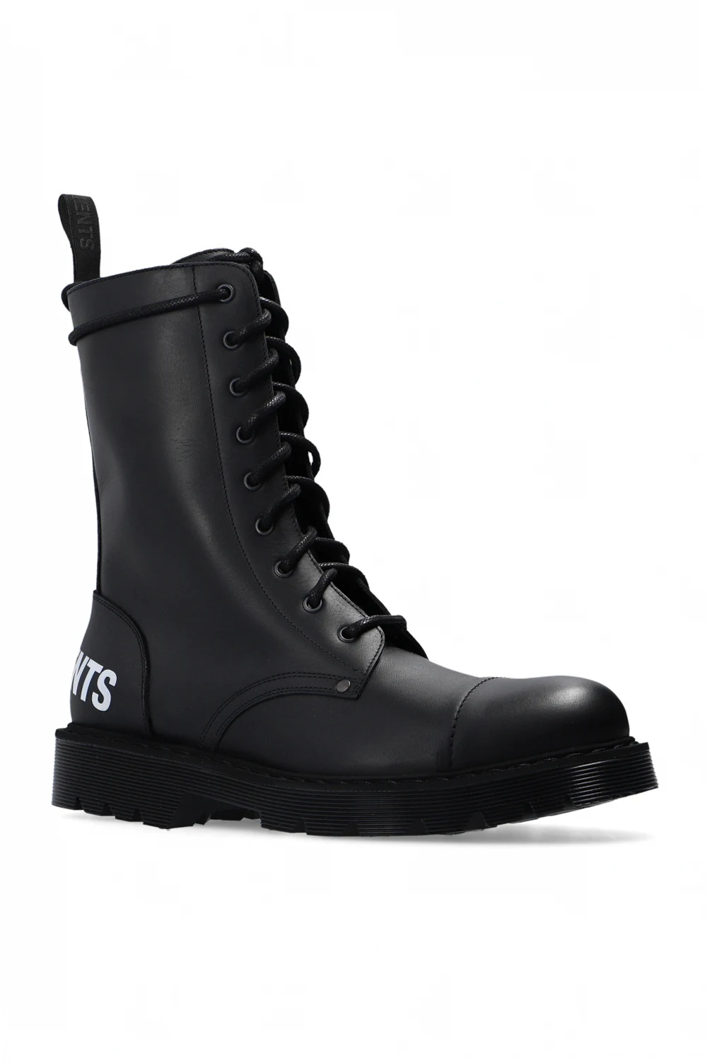 Czarne, sznurowane buty VETEMENTS. Wykonane ze skóry. Z boku zapinane na zamek. Z tyłu nadrukowane logo w kolorze białym. Czarna, gumowa podeszwa.