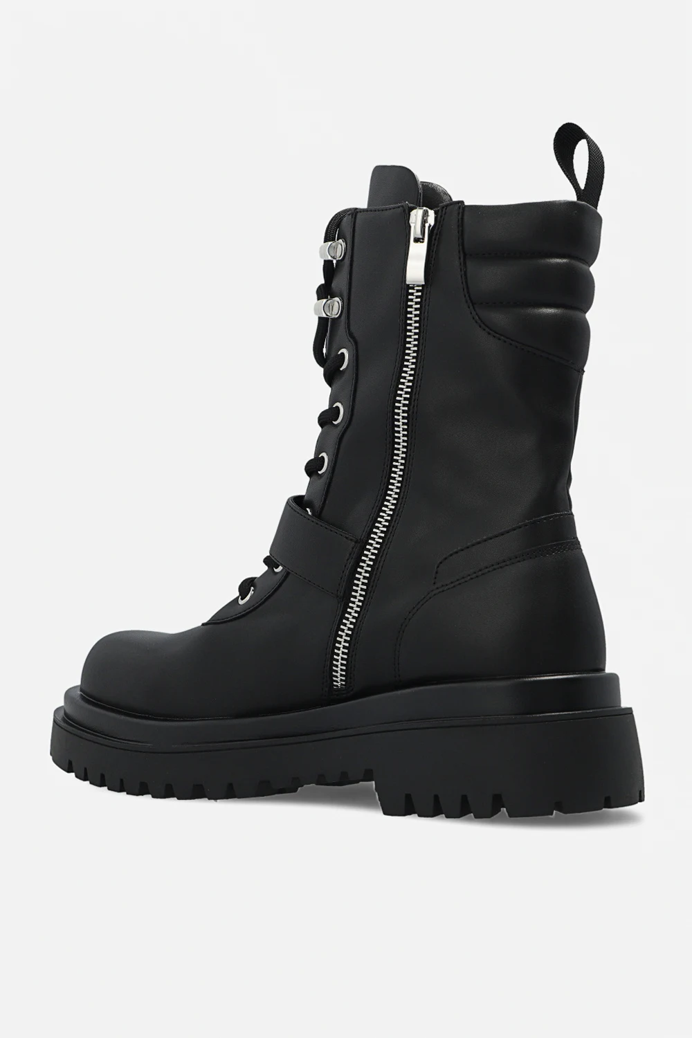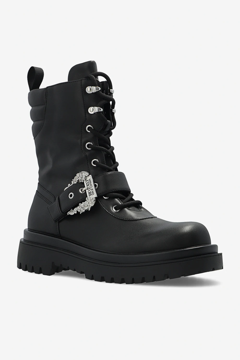 Czarne, sznurowane buty za kostkę typu ‘combat’ Versace Jeans Couture. Wykonane z imitacji skóry. Zapinane z boku na zamek. Z przodu dekoracyjny pasek z zapięciem na charakterystyczną dla marki, barokową klamrę. Z tyłu rypsowy pasek. Metalowe wykończenie w kolorze srebrnym. Czarna, gumowa podeszwa.