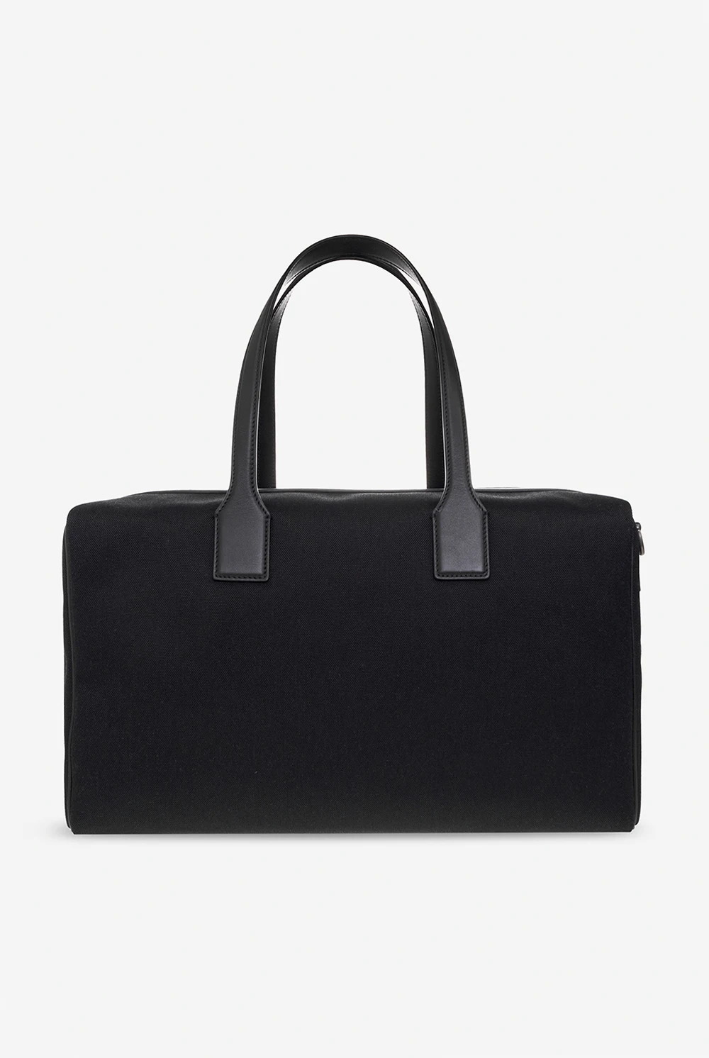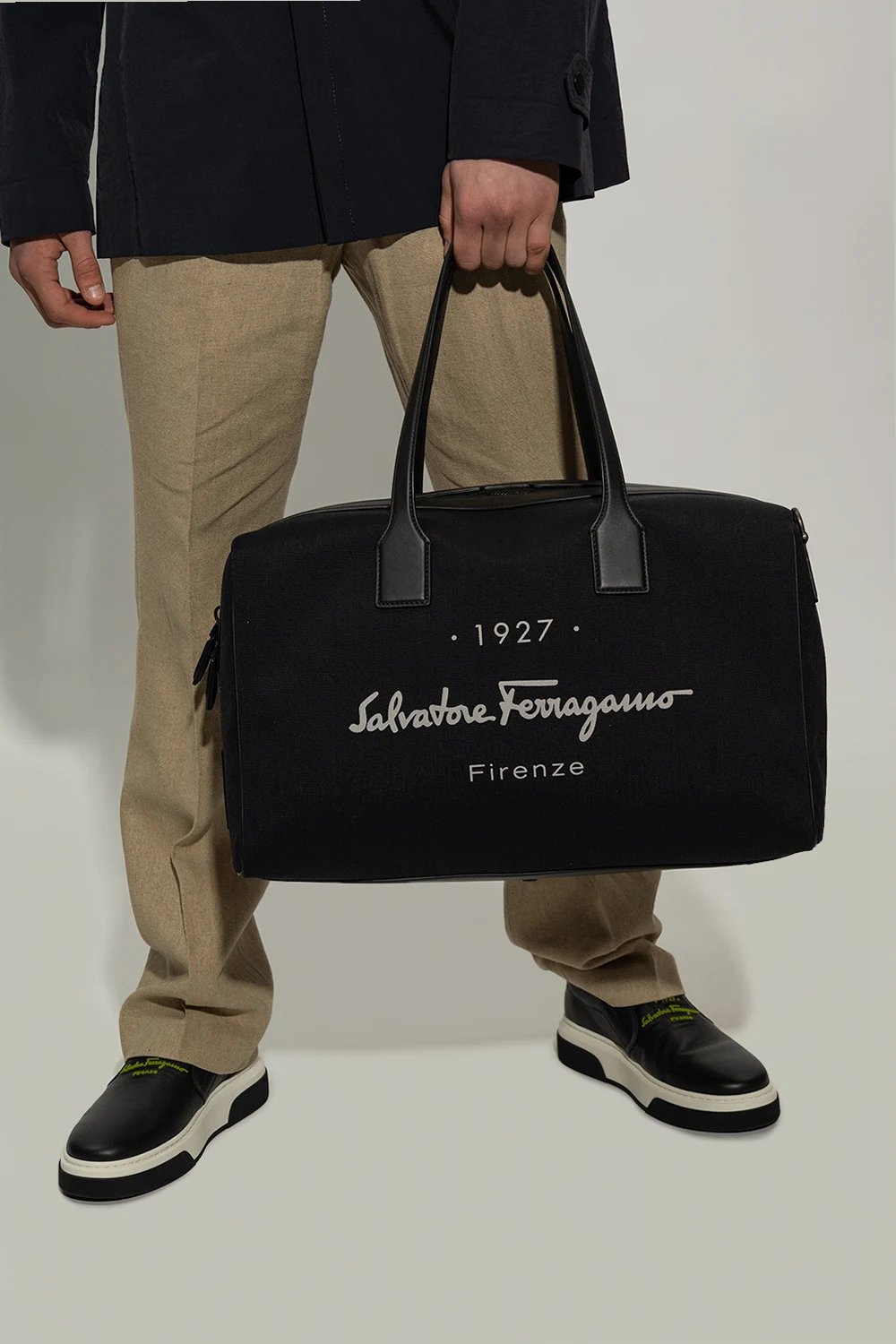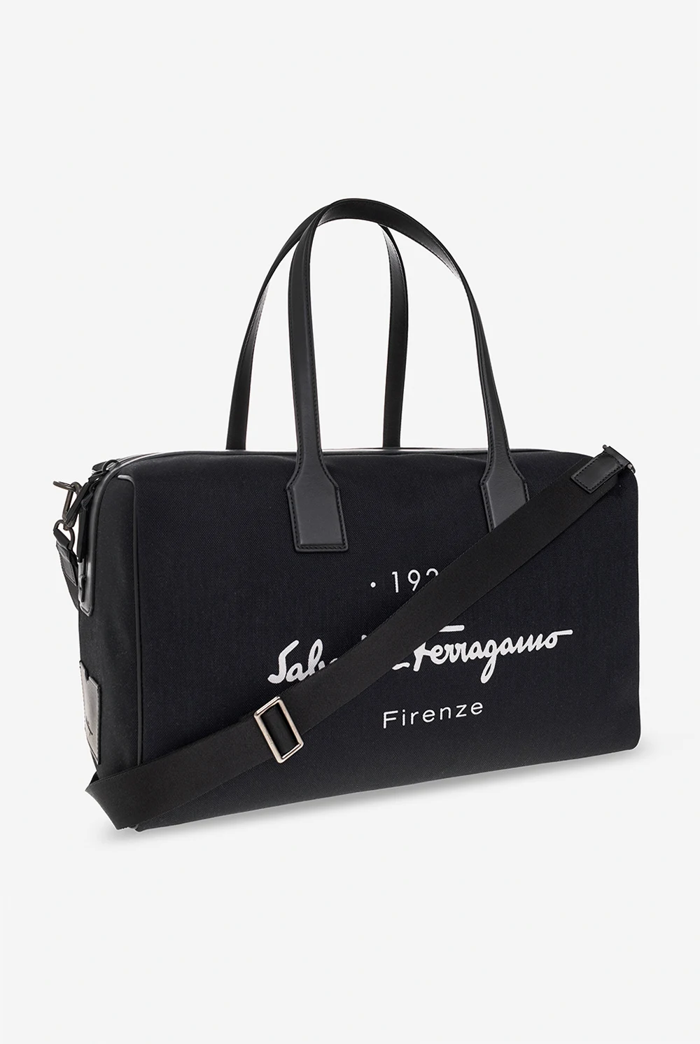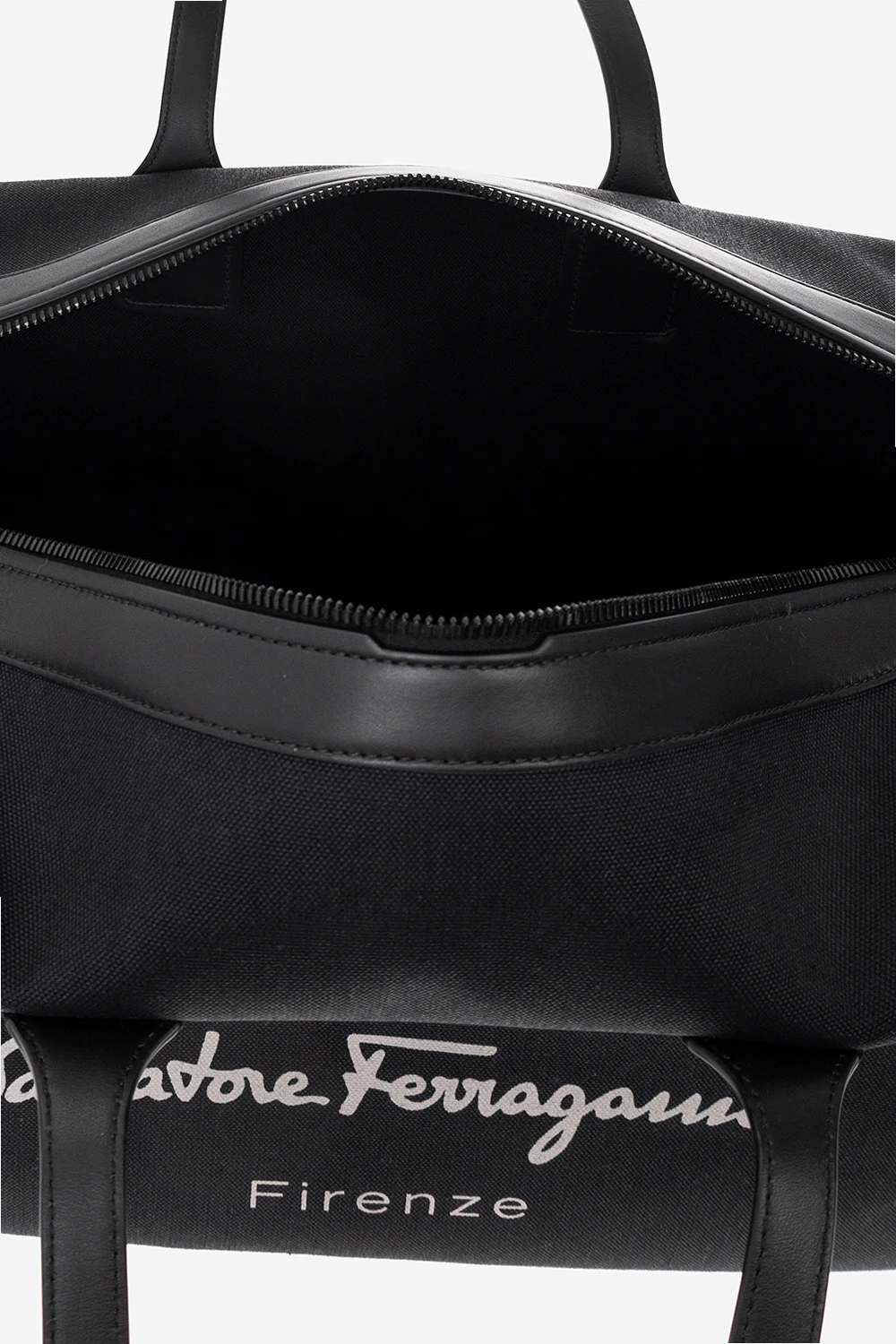 Czarna torba podręczna FERRAGAMO. Wykonana z materiału i skóry. Zamykana na zamek. Dwie półokrągłe rączki. Pas na ramię. Ozdobiona nadrukiem z logo. Wewnątrz komora. Metalowe wykończenie w kolorze czarnym.