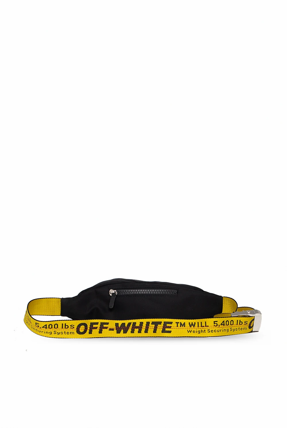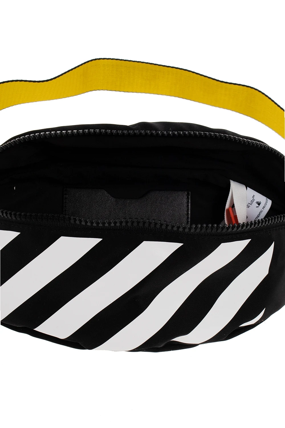 Czarna torba na pas, model ‘Binder’ Off-White. Zamykana na dwubiegunowy zamek. Z przodu ozdobiona nadrukowanym logo ‘Diagonal’ w kolorze białym. Z tyłu kieszeń na zamek. Żółty pas z możliwością regulacji długości z wyszytym logo w kolorze czarnym. Wewnątrz komora z miejscem na kartę.