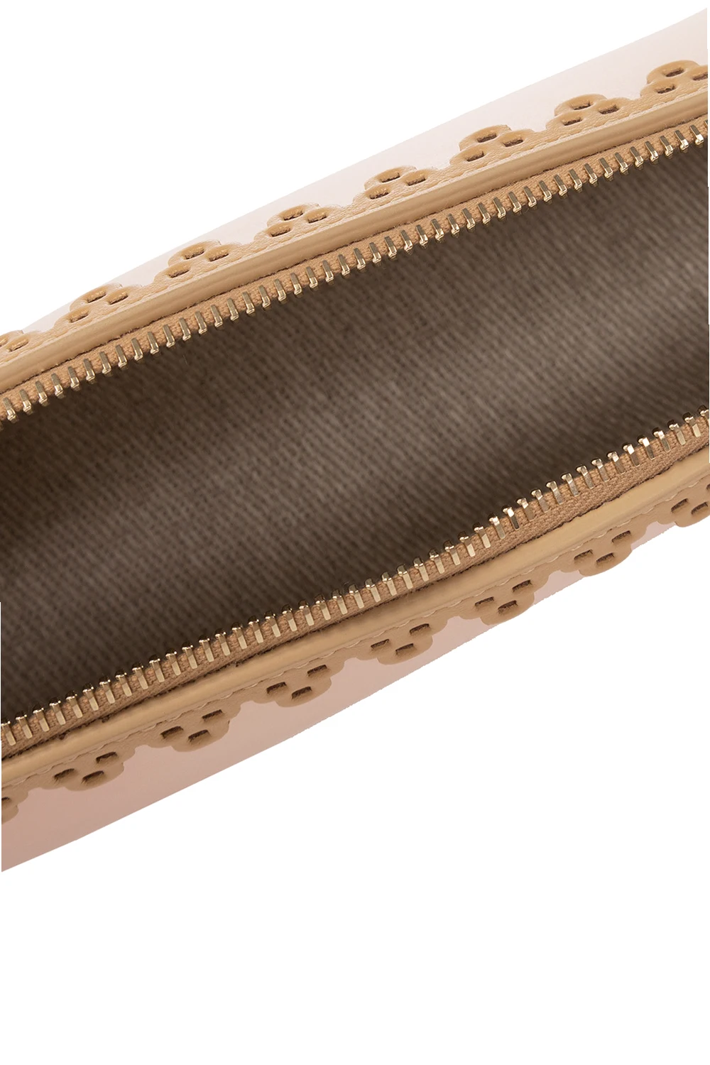 Jasnoróżowa kosmetyczka, model ‘Linda’ Chloé. Wykonana z gładkiej skóry cielęcej pochodzącej ze zrównoważonych źródeł (certyfikat Leather Working Group). Zamykana na zamek. Z przodu ozdobiona wytłoczonym logo. Dekoracyjne wykończenie w kolorze beżowym. Wewnątrz komora. Metalowe wykończenie w kolorze jasnego złota.