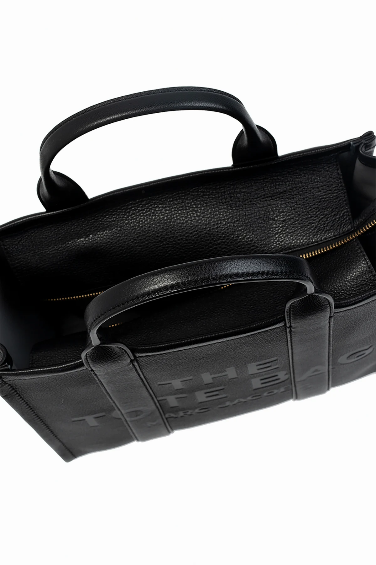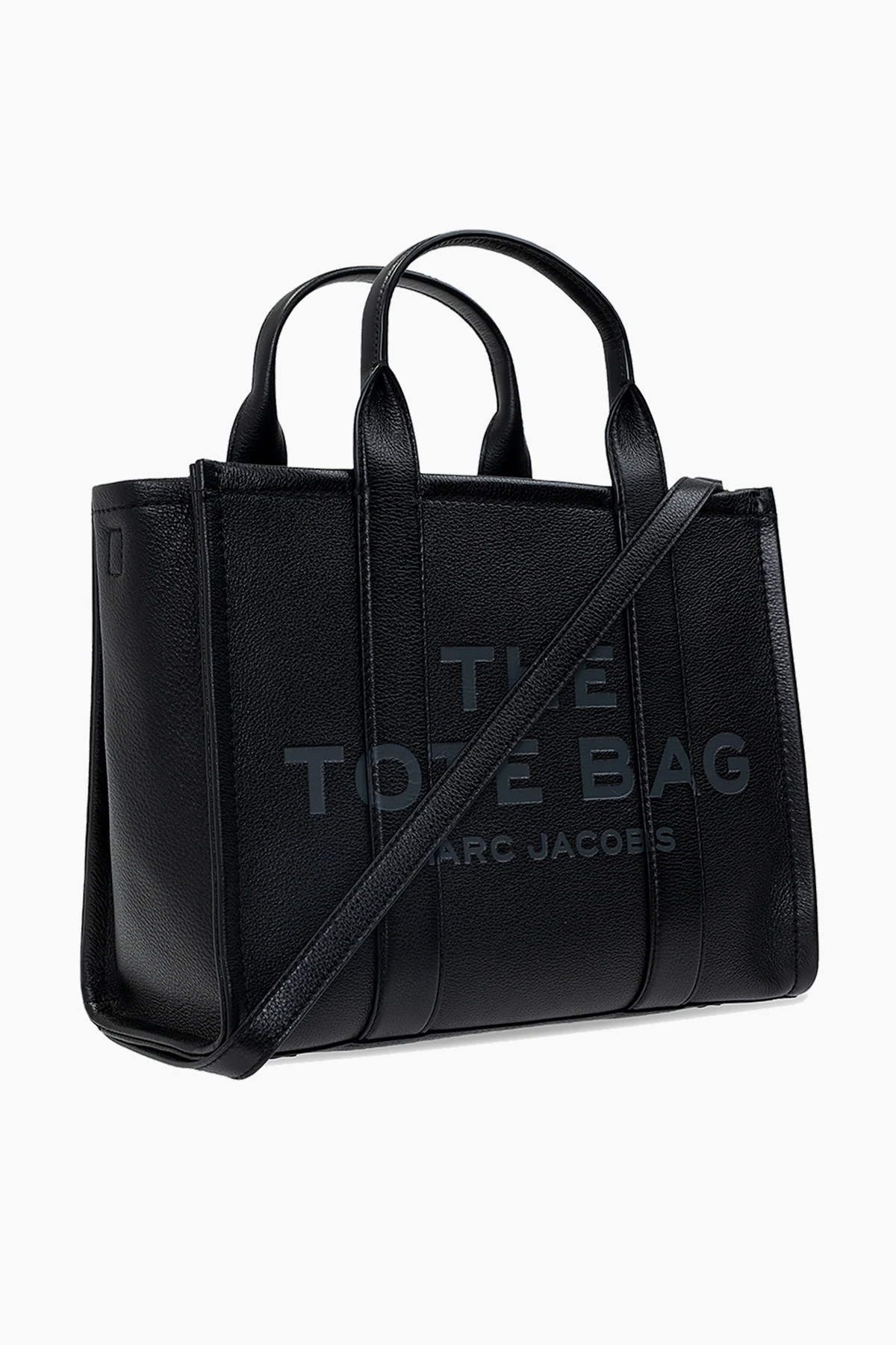 Czarna torba typu 'shopper', model 'The Medium Tote' Marc Jacobs. Wykonana ze skóry. Zamykana na zamek. Ozdobiona wytłoczonym wzorem z logo w kolorze szarym. Dwie półokrągłe rączki. Pas na ramię z możliwością regulacji długości. Wewnątrz komora oraz trzy kieszenie: dwie wsuwane i jedna zapinana na zamek. Metalowe wykończenie w kolorze złotym.