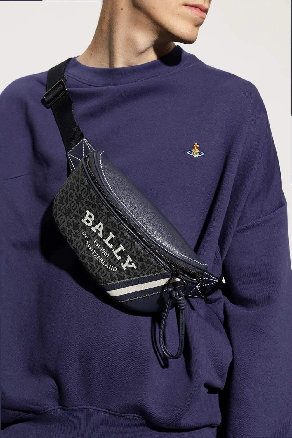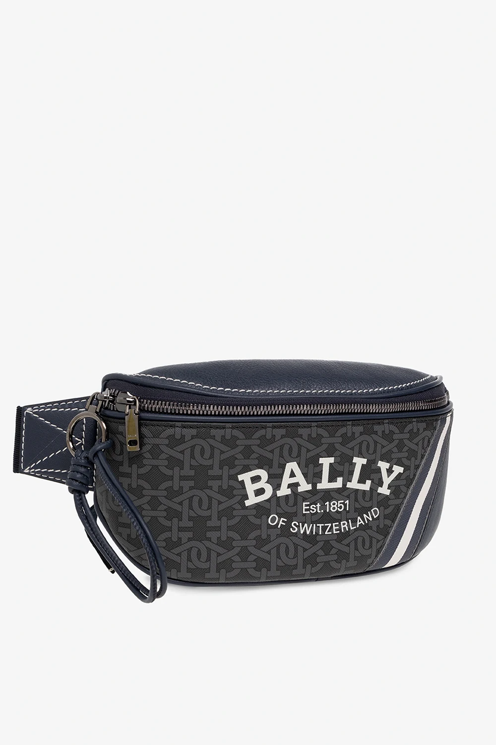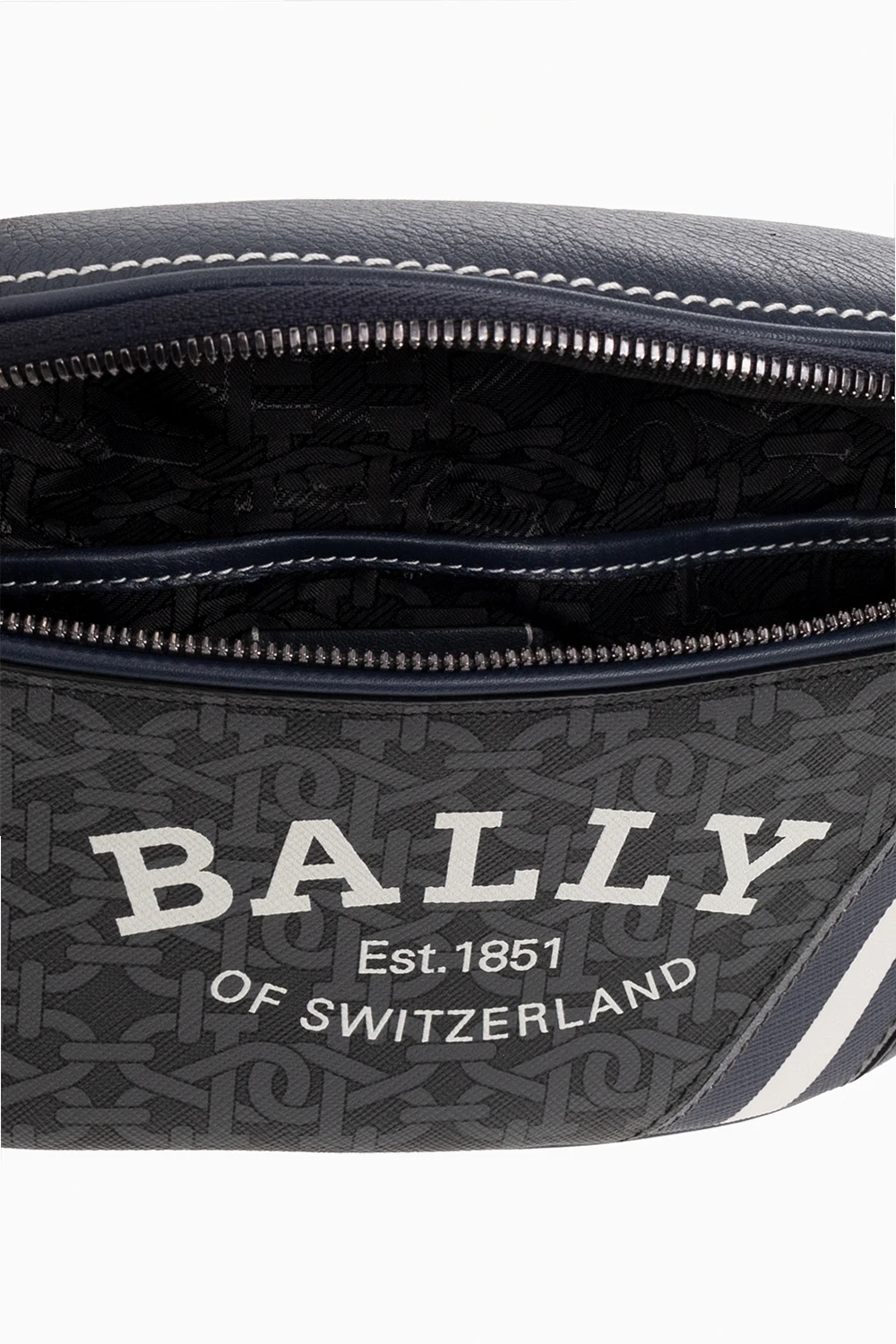 Granatowo-szaro-kremowa torba na pas, model ‘Chatey’ Bally. Zamykana na dwubiegunowy zamek. Ozdobiona nadrukowanym logo w kolorze białym i wzorem z monogramem. Z tyłu kieszeń zamykana na zamek. Pas na pas z możliwością regulacji długości. Wewnątrz komora i wsuwana kieszeń. Metalowe elementy w kolorze ciemnego srebra.
