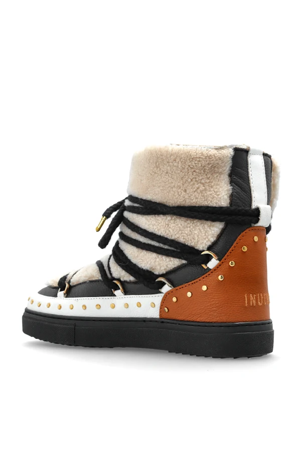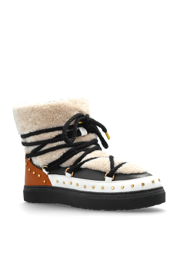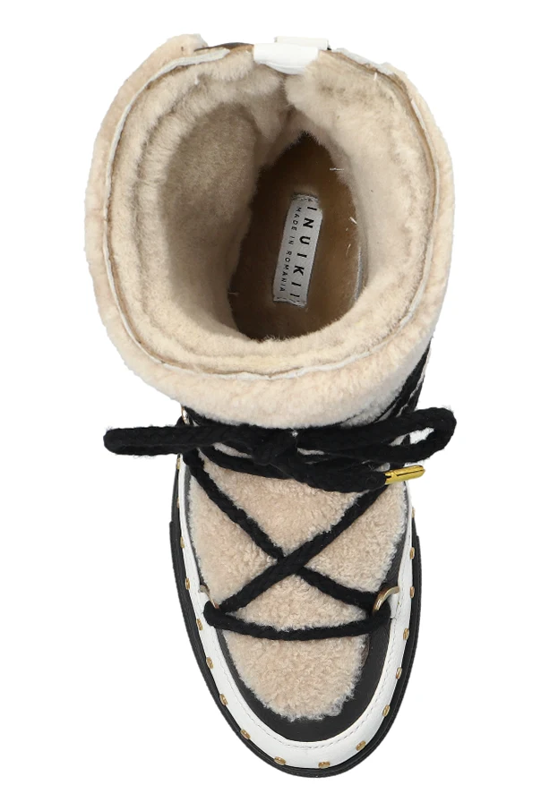 Ozdobne, czarne sznurowadła krzyżujące się wokół buta, skontrastowane z paskami skóry w odcieniach bieli i karmelu oraz solidnym skórzanym panelem z tyłu, nadają całości wyrazistego, artystycznego charakteru. Płaska, czarna podeszwa z wysokogatunkowej gumy zapewnia stabilność, idealnie dopełniając klasyczną, za kostkę sylwetkę śniegowców.