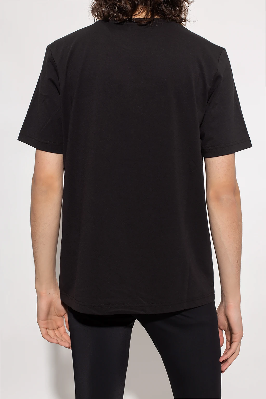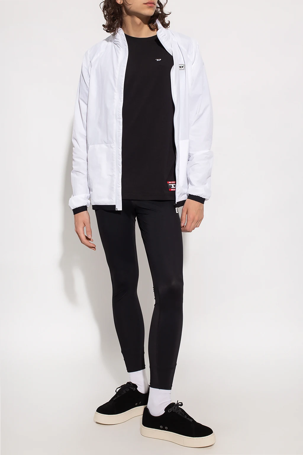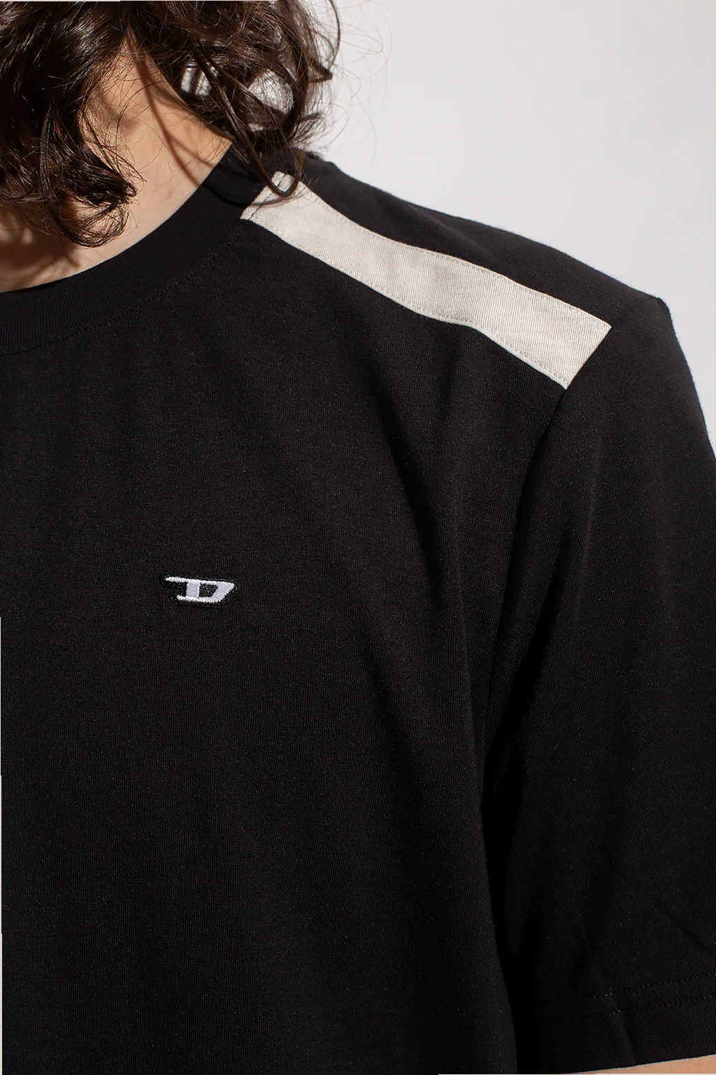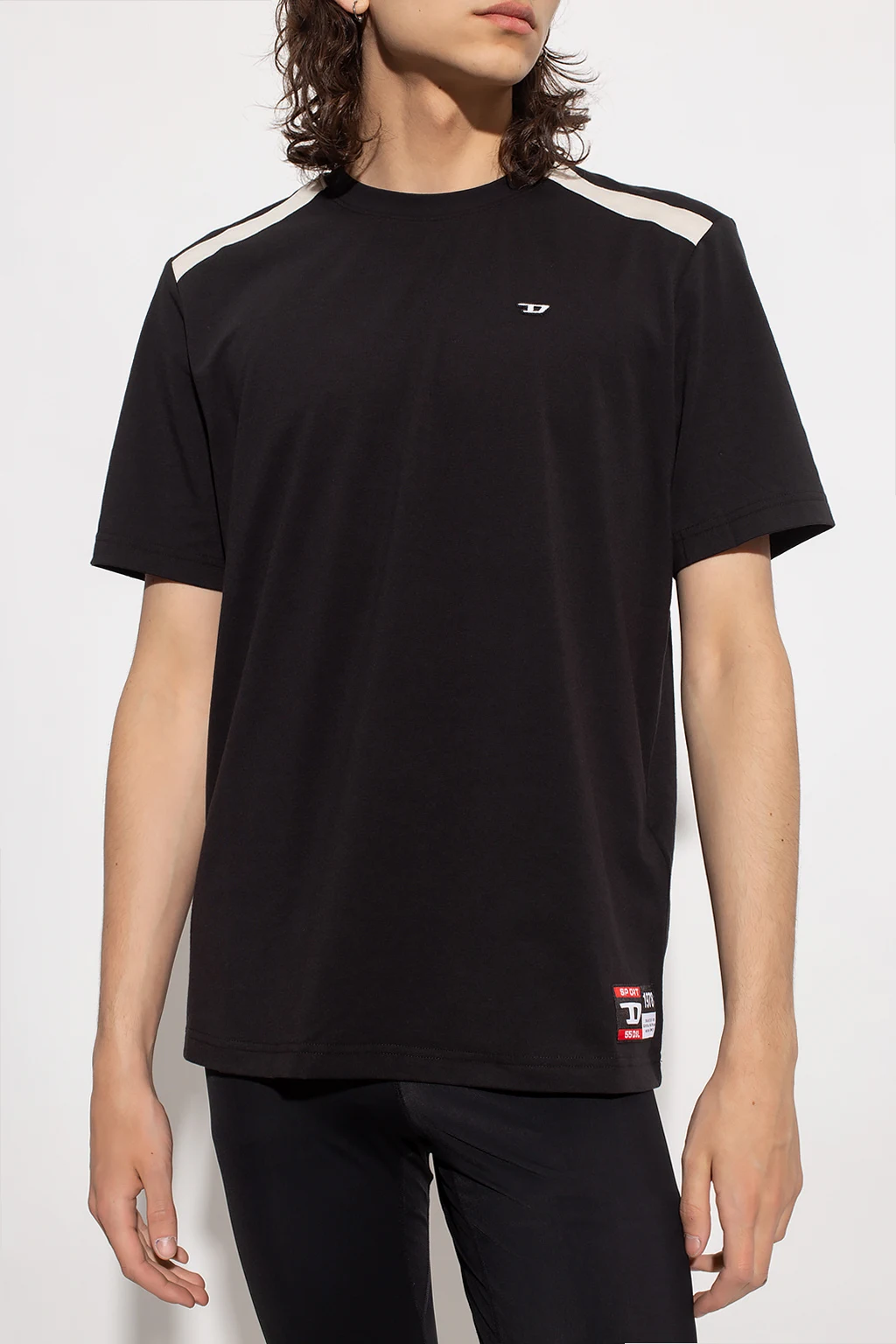 Czarny, bawełniany t-shirt, model 'AMTEE-FREASTY-HT04' Diesel, kolekcja ‘Sport 55DSL’. Z przodu ozdobiony naszywką z logo, na dole metka w kolorze biało-czerwono-czarnym. Okrągły dekolt wykończony ściągaczem, krótkie rękawy ozdobione wstawkami w kolorze białym.