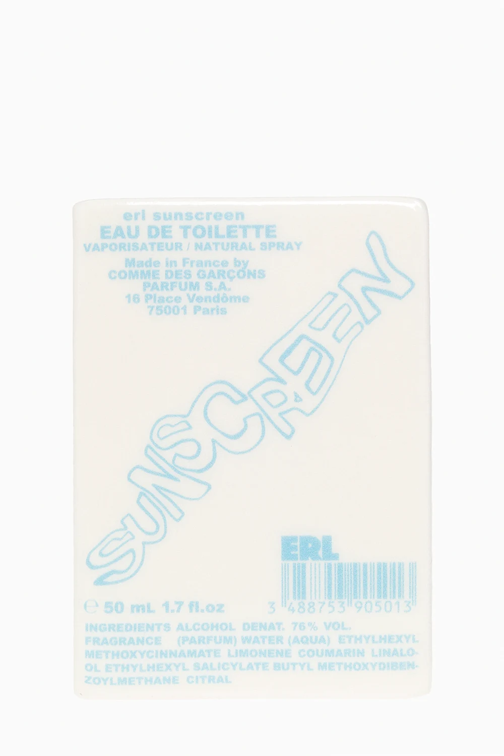 Woda toaletowa ‘ERL Sunscreen’ Comme des Garcons. Zapach skomponowany przez Nelly Hachem-Ruiz. Skład: bergamotka, brzoskwinia, heliotrop, konwalia, kokos, piżmo i cedr.