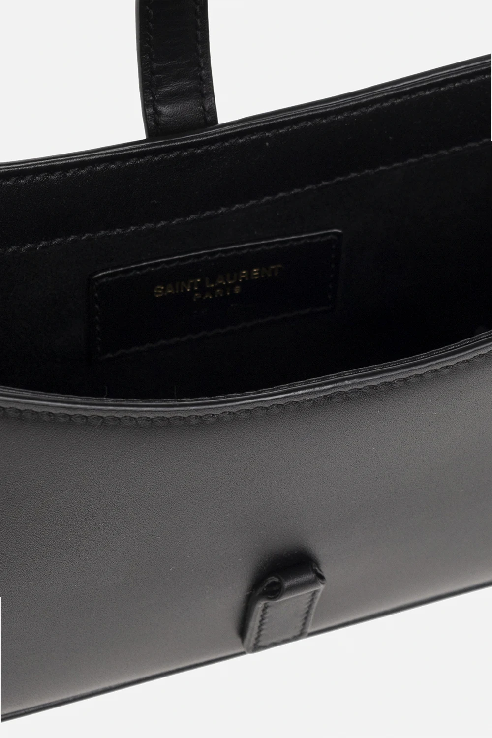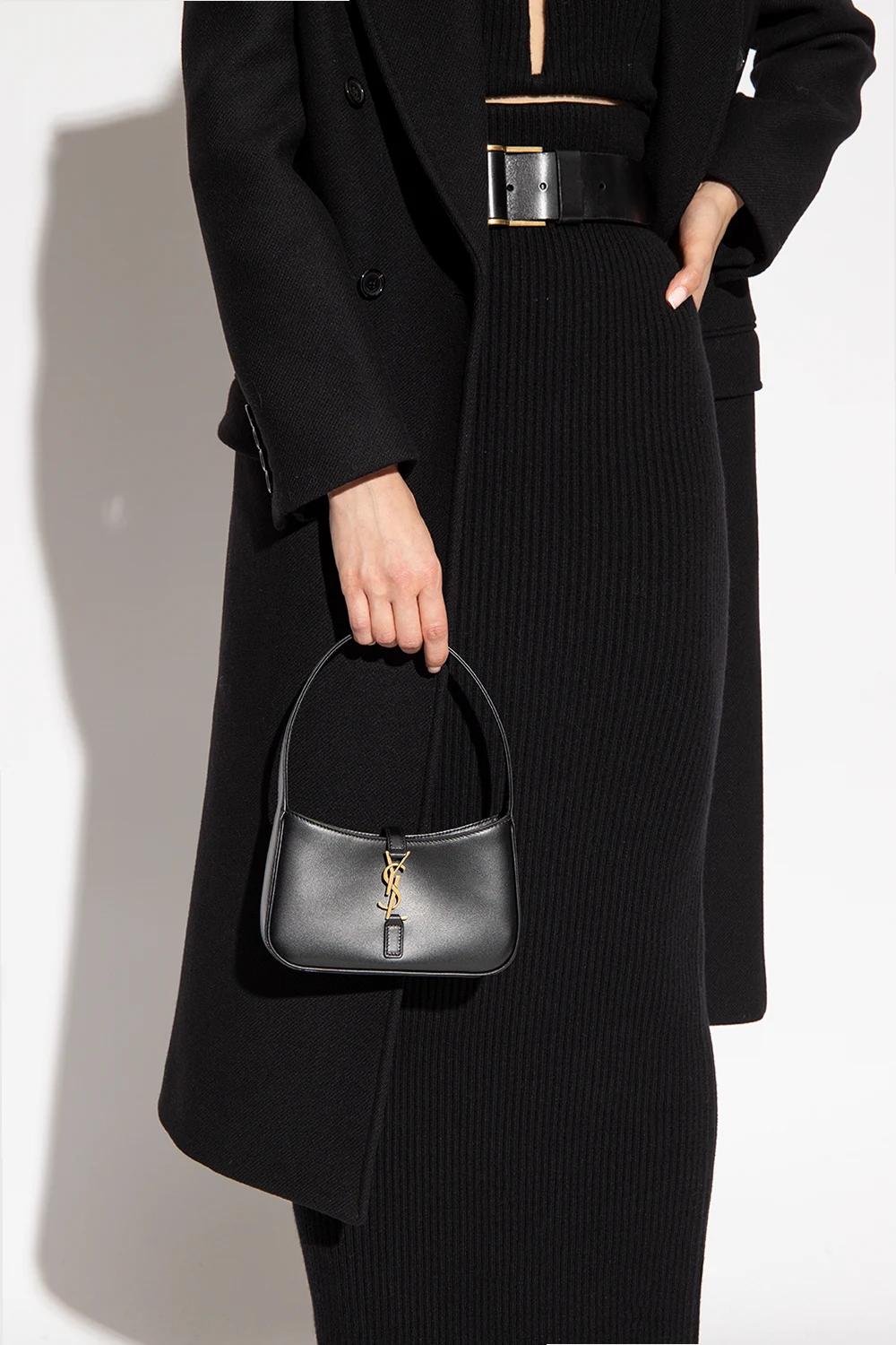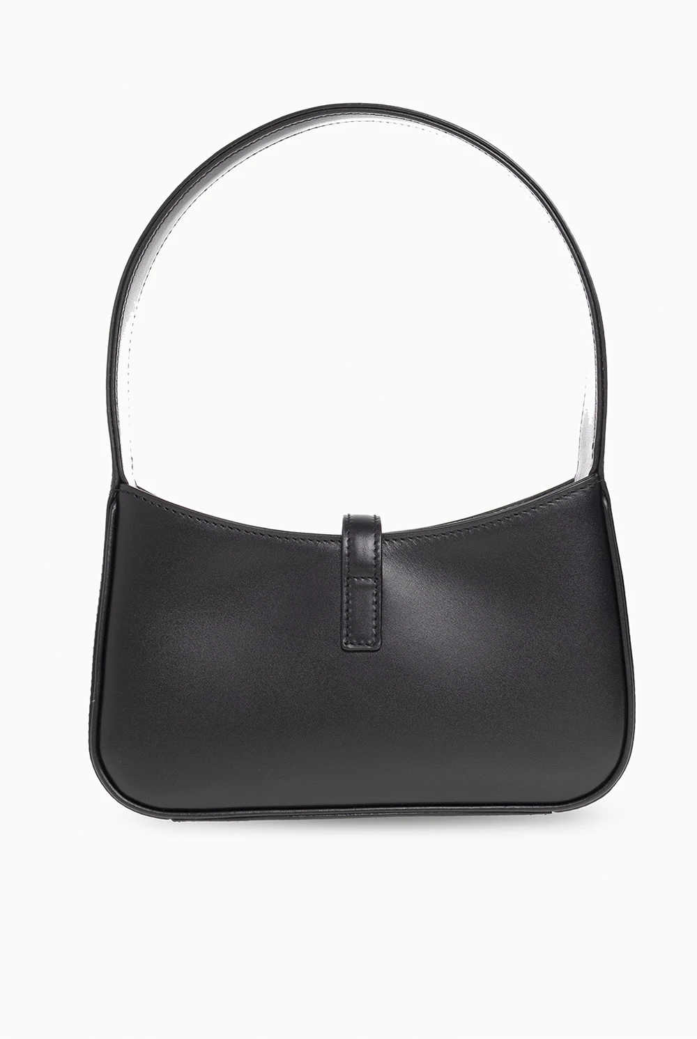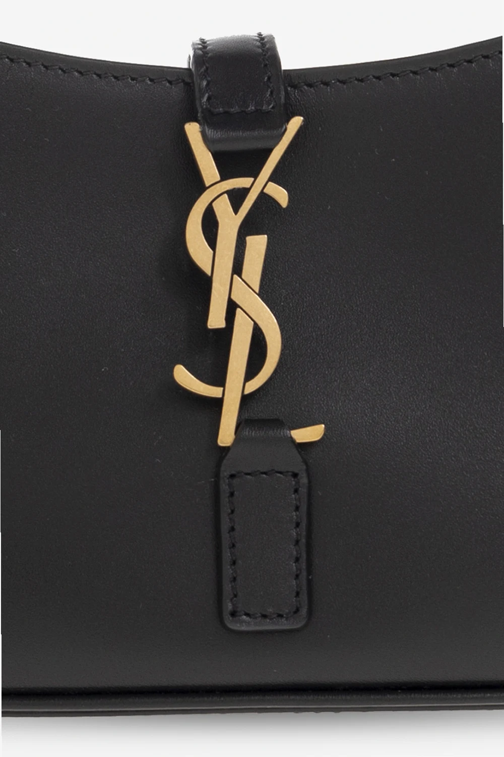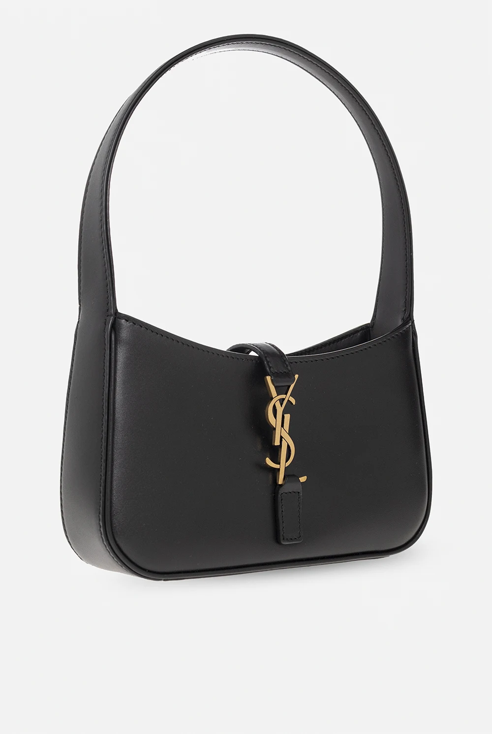 Czarna torba do ręki typu ‘hobo’, model ‘Le 5 A 7 Mini’ Saint Laurent. Wykonana z cielęcej skóry. Dekoracyjne zamknięcie na zaczep z metalową aplikacją w kształcie logo. Półokrągła rączka. Wewnątrz komora i miejsce na kartę. Metalowe elementy w kolorze postarzanego złota.