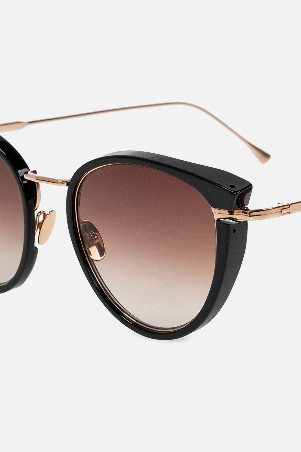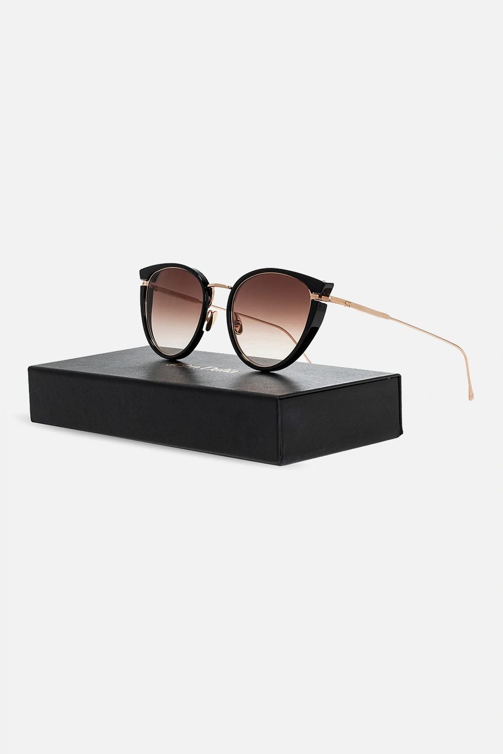 Okulary przeciwsłoneczne w kolorze złoto-czarnym, model 'Diana' John Dalia. Inspirowane modą lat 80. Pokryte 22-karatowym złotem. Wewnątrz nauszników nadrukowane logo oraz nazwa modelu. Brązowe, certyfikowane soczewki UVA/UVB. Dołączone etui.