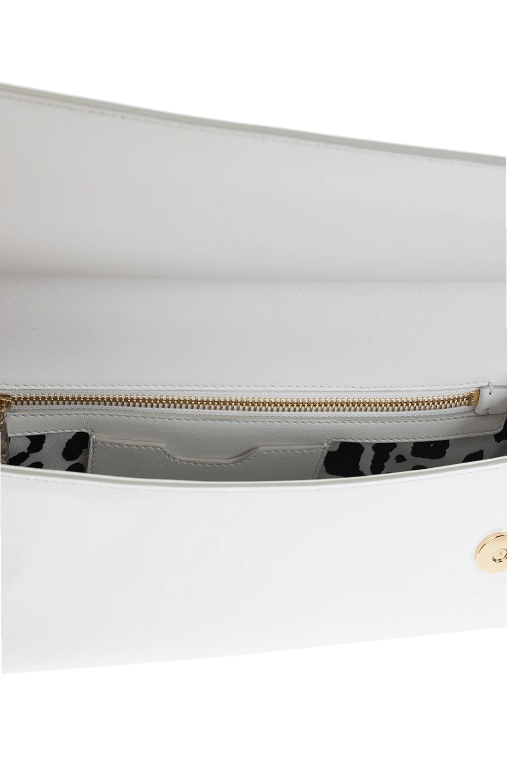 Biała torba na ramię, model 'Sicily' Dolce & Gabbana. Wykonana ze skóry cielęcej. Zamykana na zatrzask. Ozdobiona aplikacją z logo w kolorze złoto-srebrnym. Półokrągła rączka. Odpinany pas na ramię z możliwością regulowania długości. Wewnątrz komora oraz kieszeń zamykana na zamek i wsuwana.
