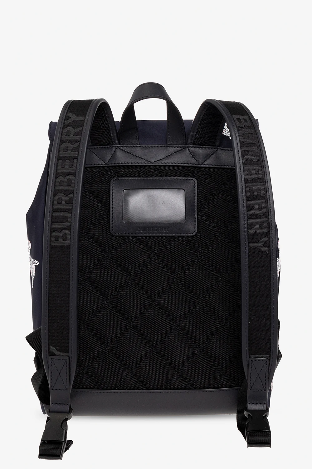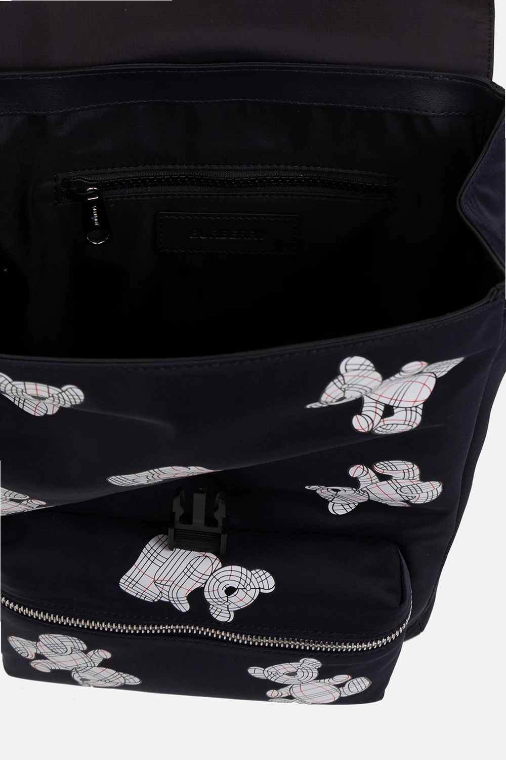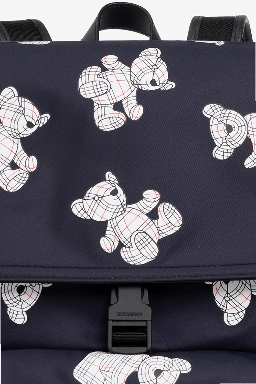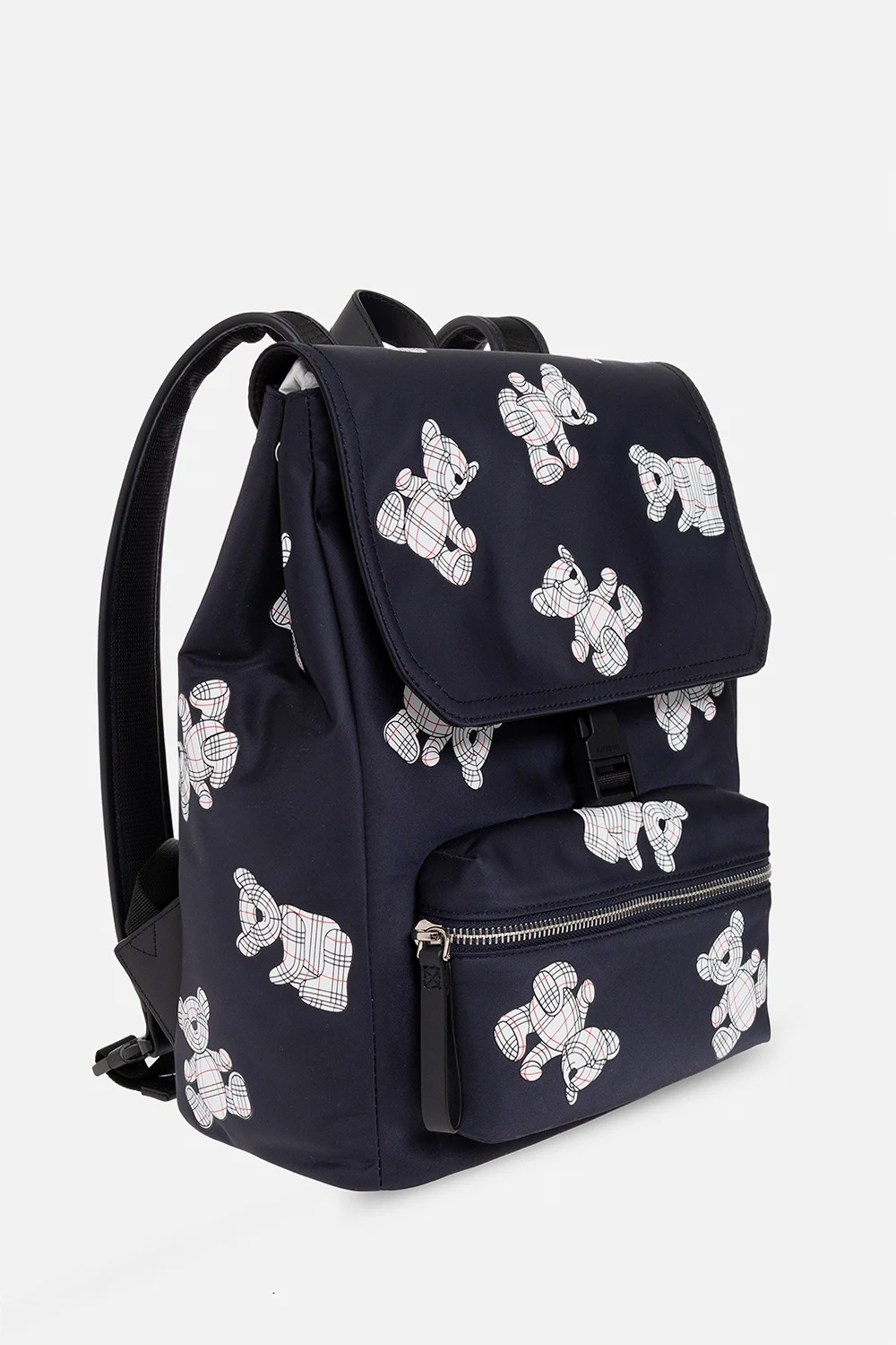 Granatowy plecak Burberry Kids. Zapinany na zatrzask. Ozdobiony dekoracyjnym wzorem z motywem misia w kolorze biało-czerwono-czarnym. Z przodu kieszeń zamykana na zamek. Półokrągła rączka. Szelki z możliwością regulacji długości. Wewnątrz komora oraz trzy kieszenie: dwie wsuwane oraz zamykana na zamek. Metalowe wykończenie w kolorze srebrnym.