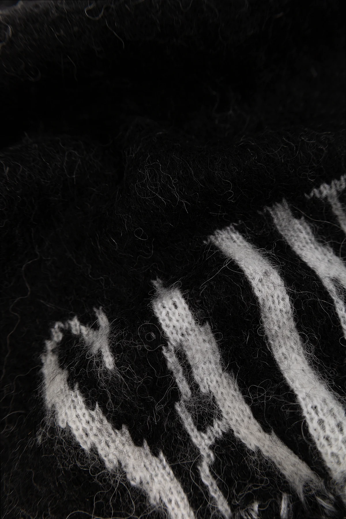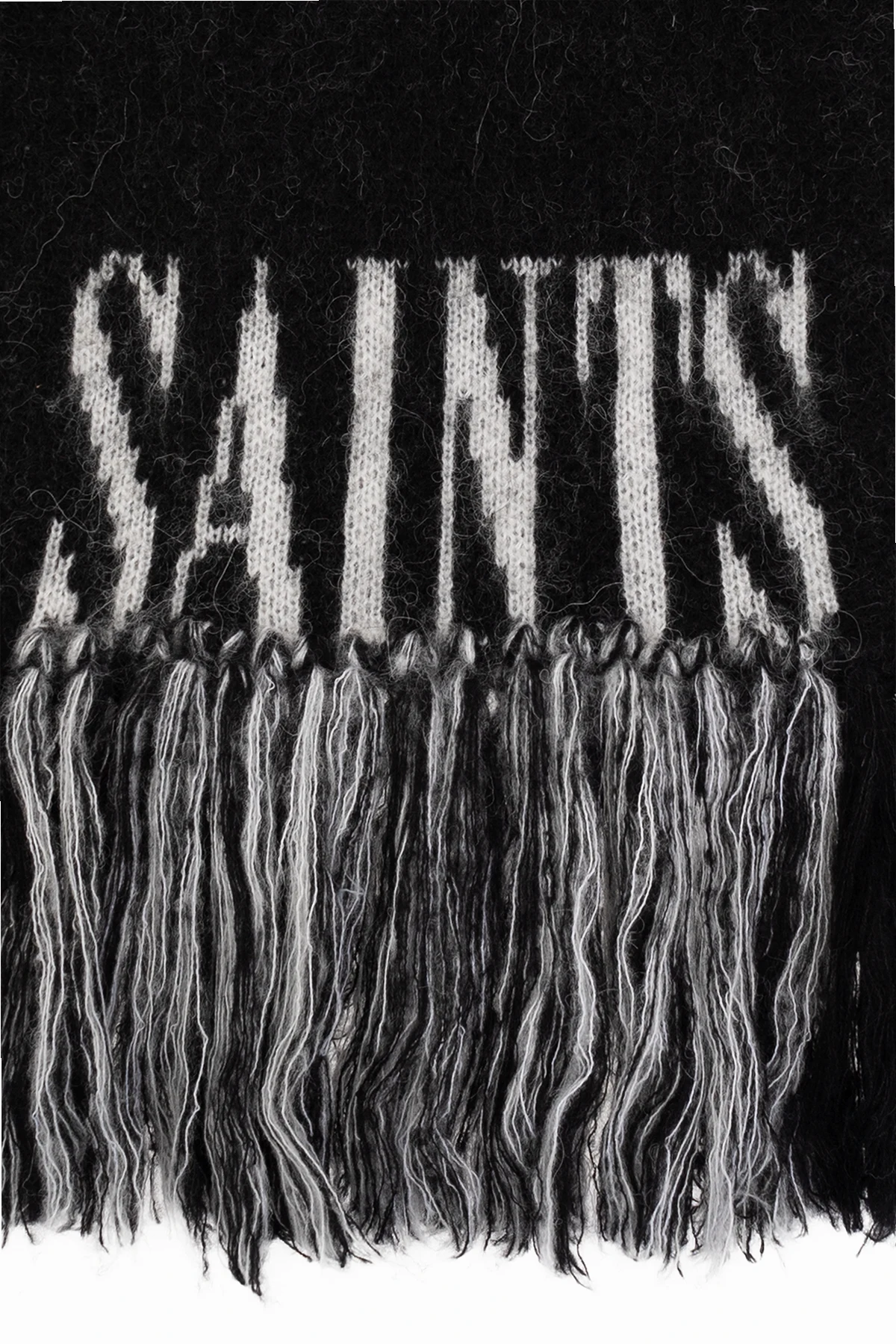 Czarno-biały szal AllSaints. Wykonany z mieszanki wełny i alpaki. Ozdobiony wzorem z logo. Wykończony frędzlami.