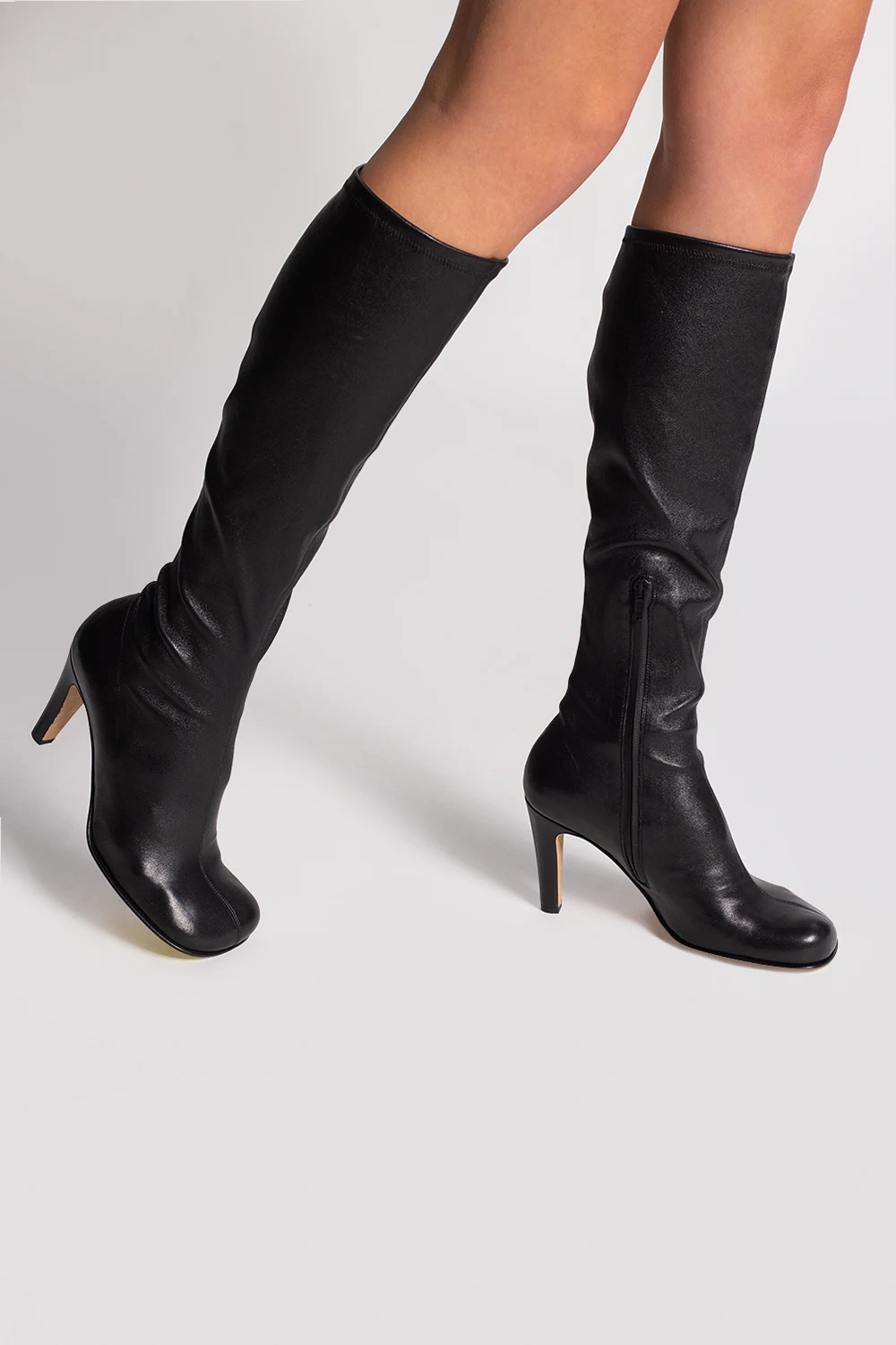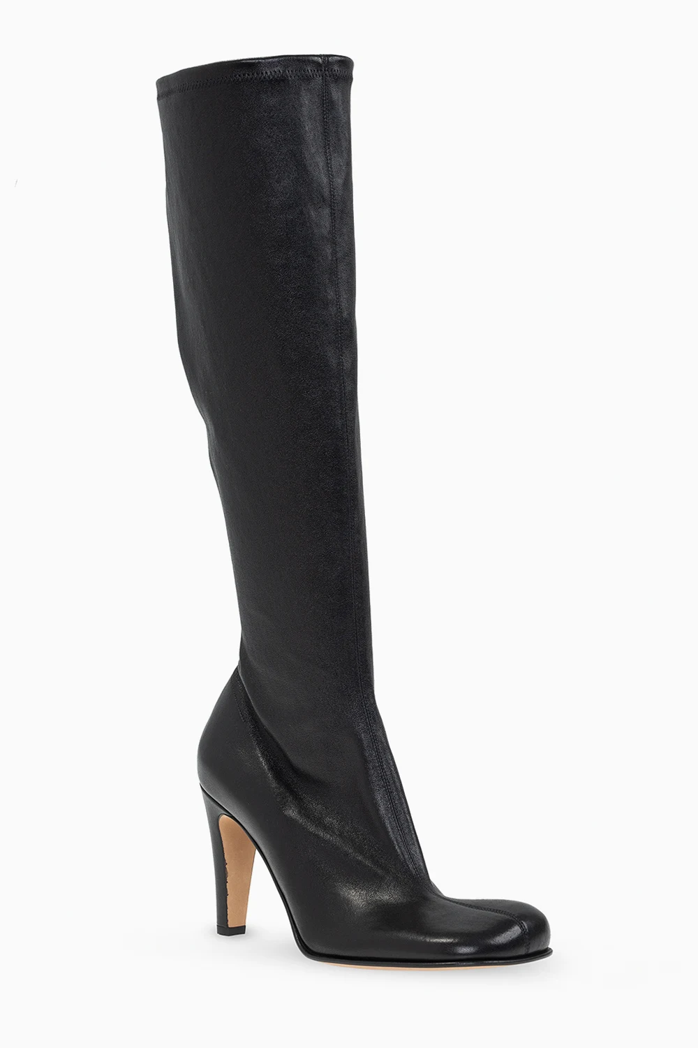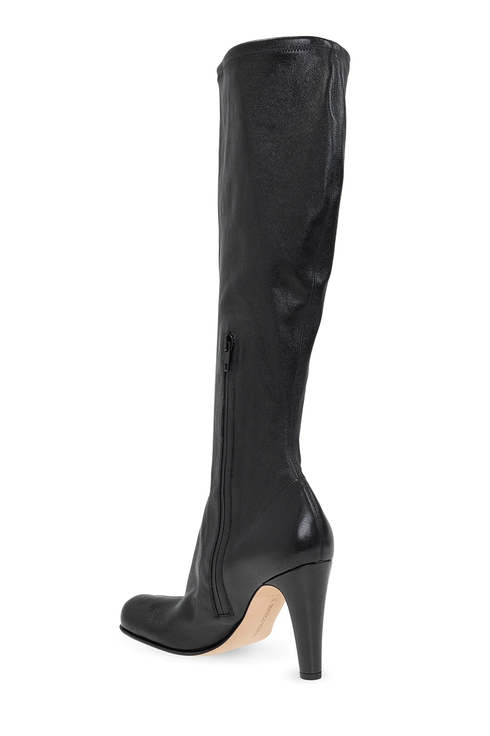 Czarne kozaki na obcasie, model ‘Bloc’ Bottega Veneta. Wykonane z jagnięcej skóry. Zapinane z boku na zamek. Beżowa, skórzana podeszwa.
