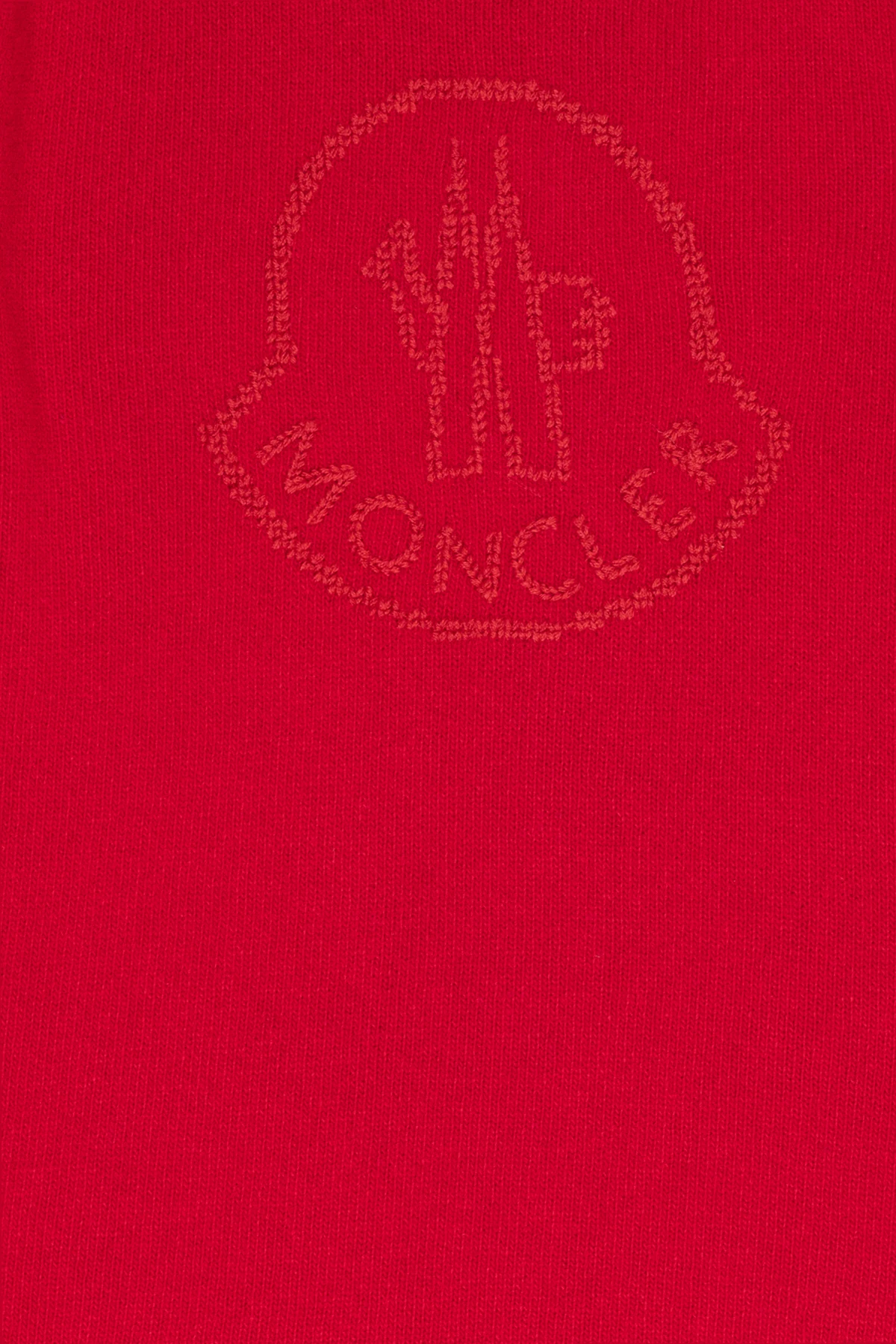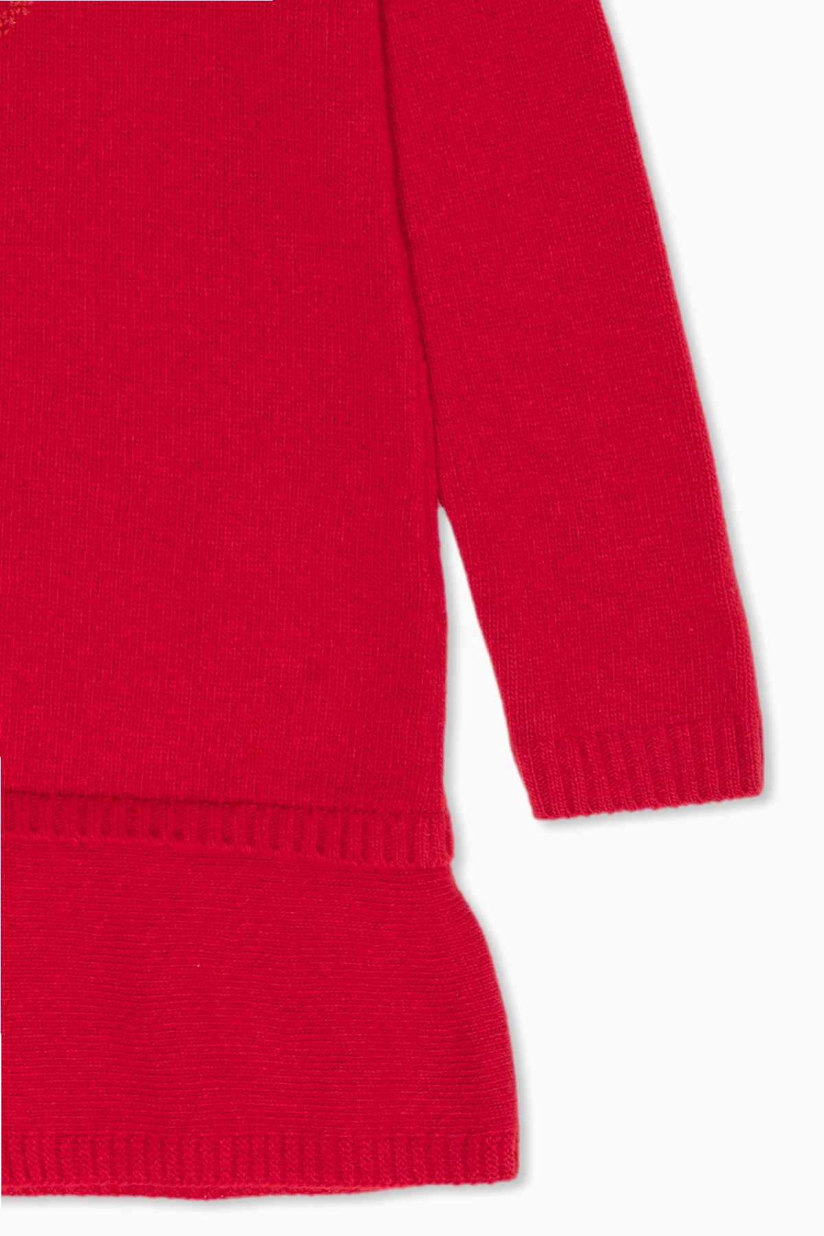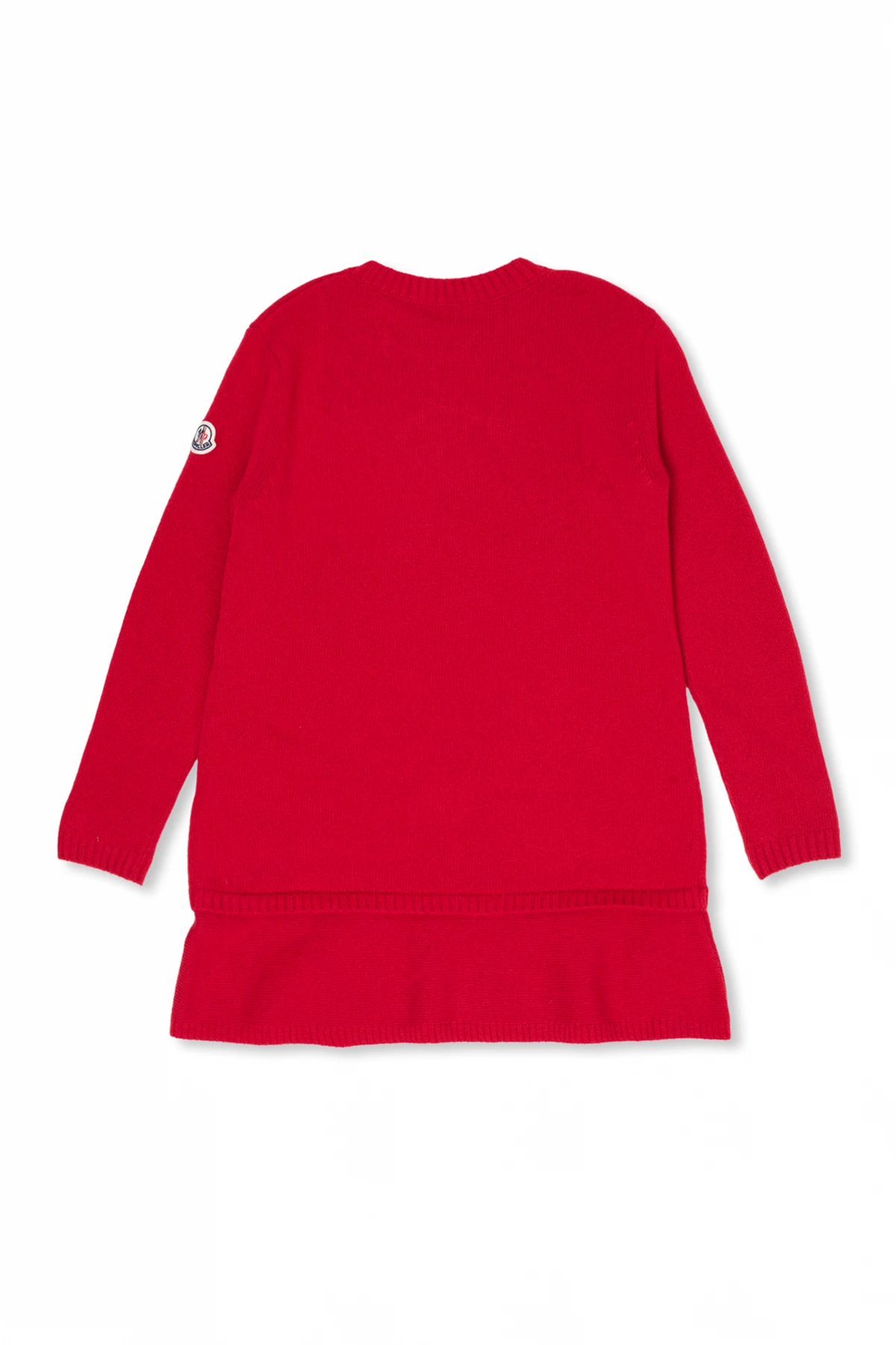 Czerwona sukienka Moncler Enfant. Wykonana z wełny dziewiczej. Ozdobiona haftem z logo. Okrągły dekolt oraz długie rękawy zakończony ściągaczem.