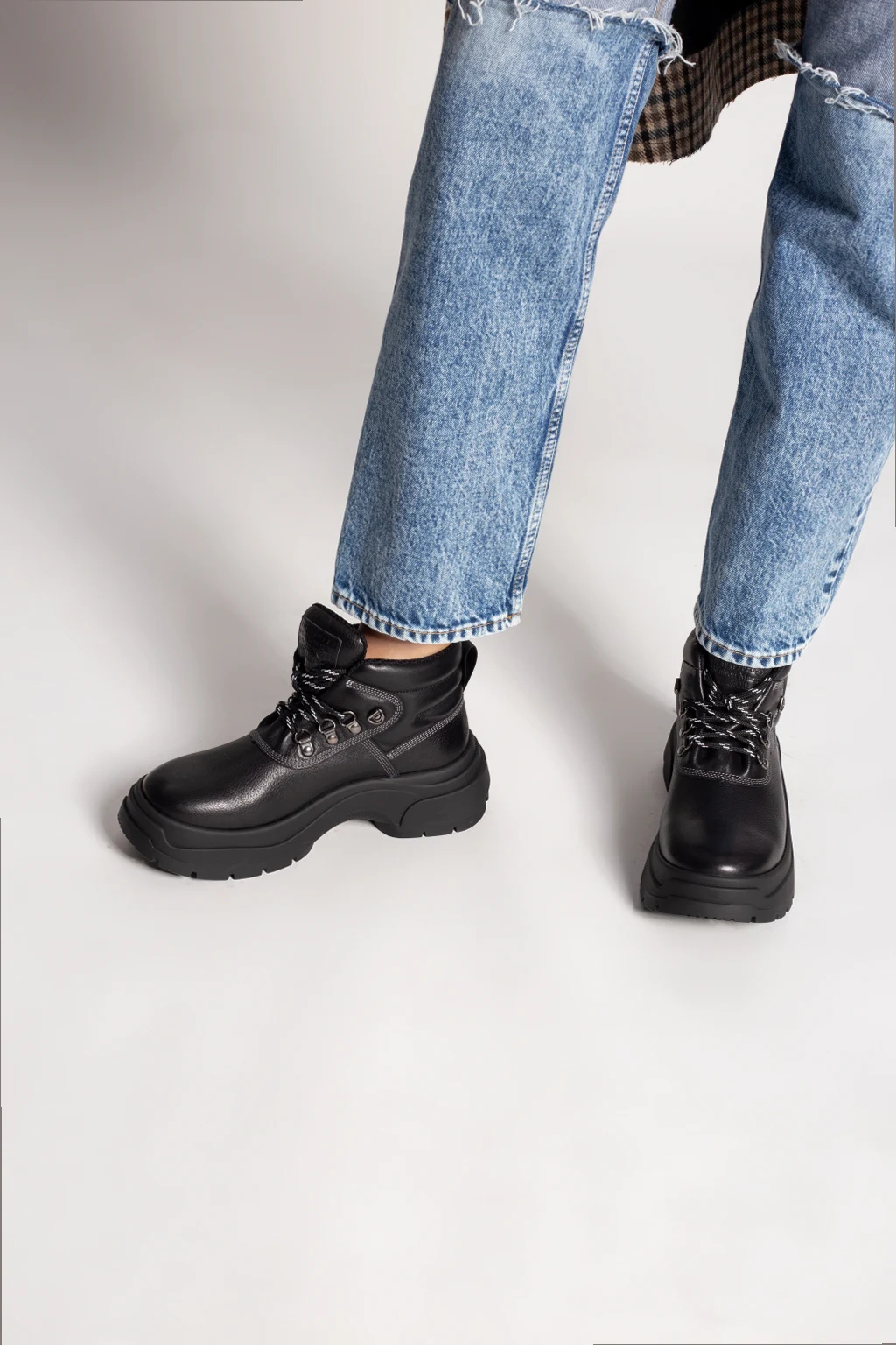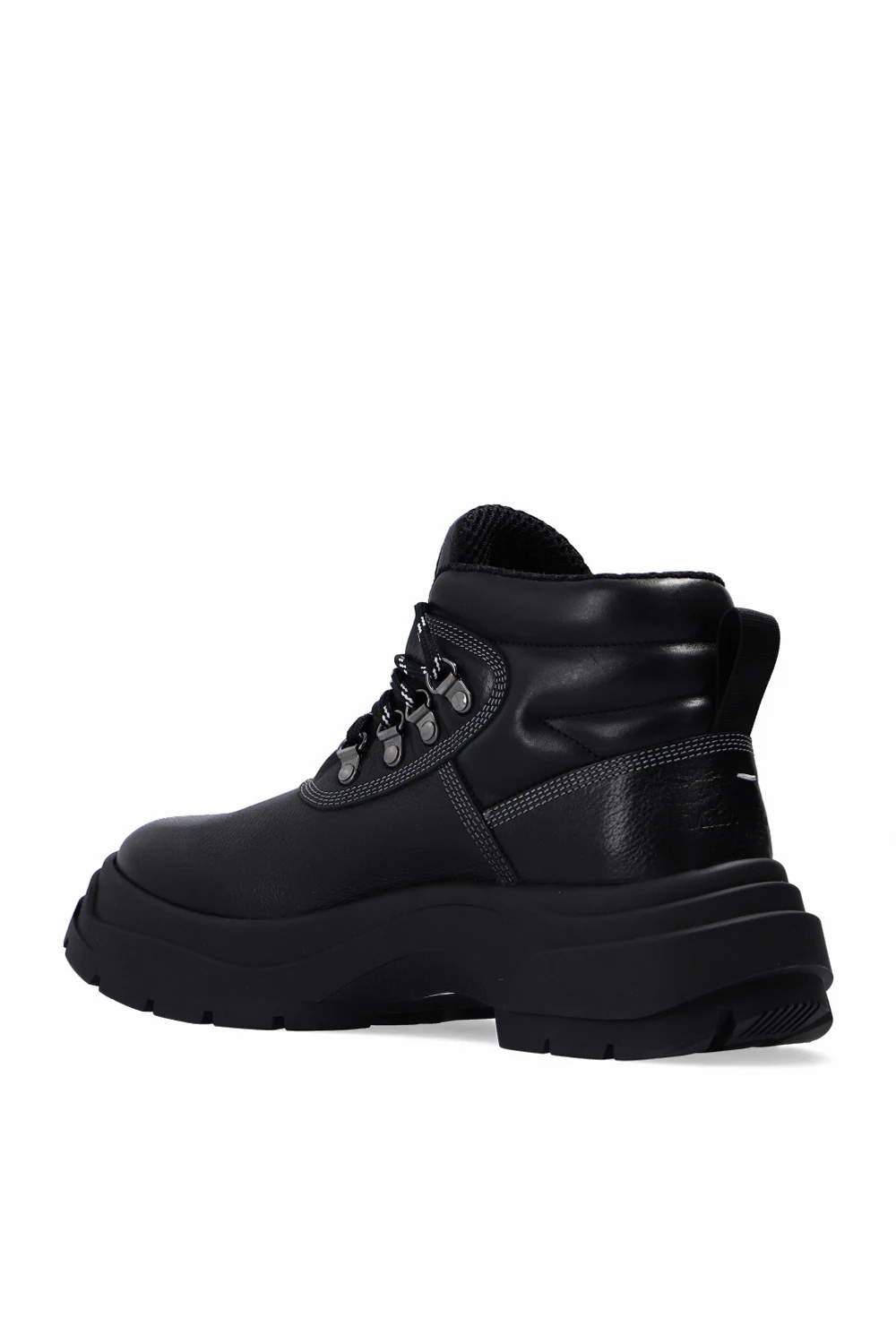 Czarne, sznurowane trapery Maison Margiela. Wykonane ze skóry. Z tyłu wytłoczone logo. Czarna, gumowa podeszwa.