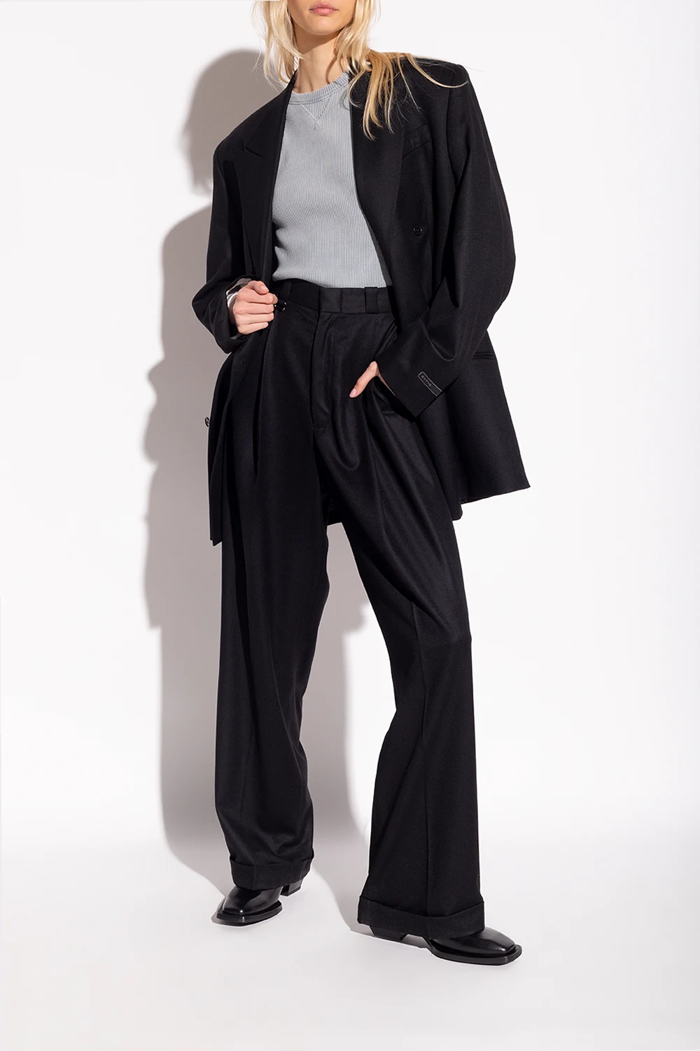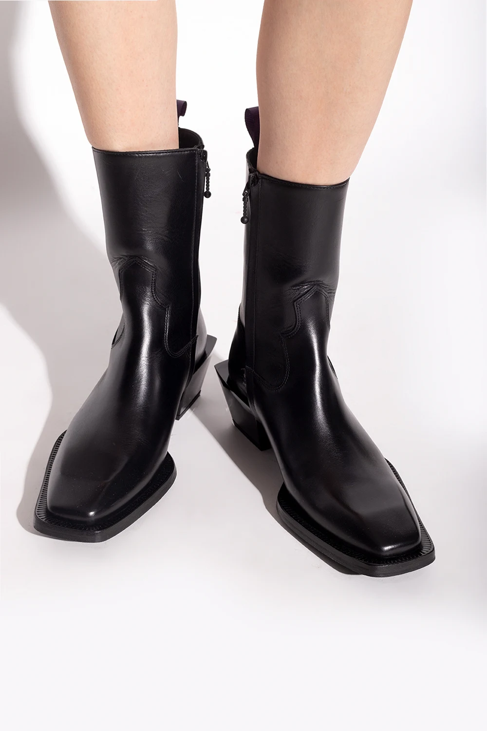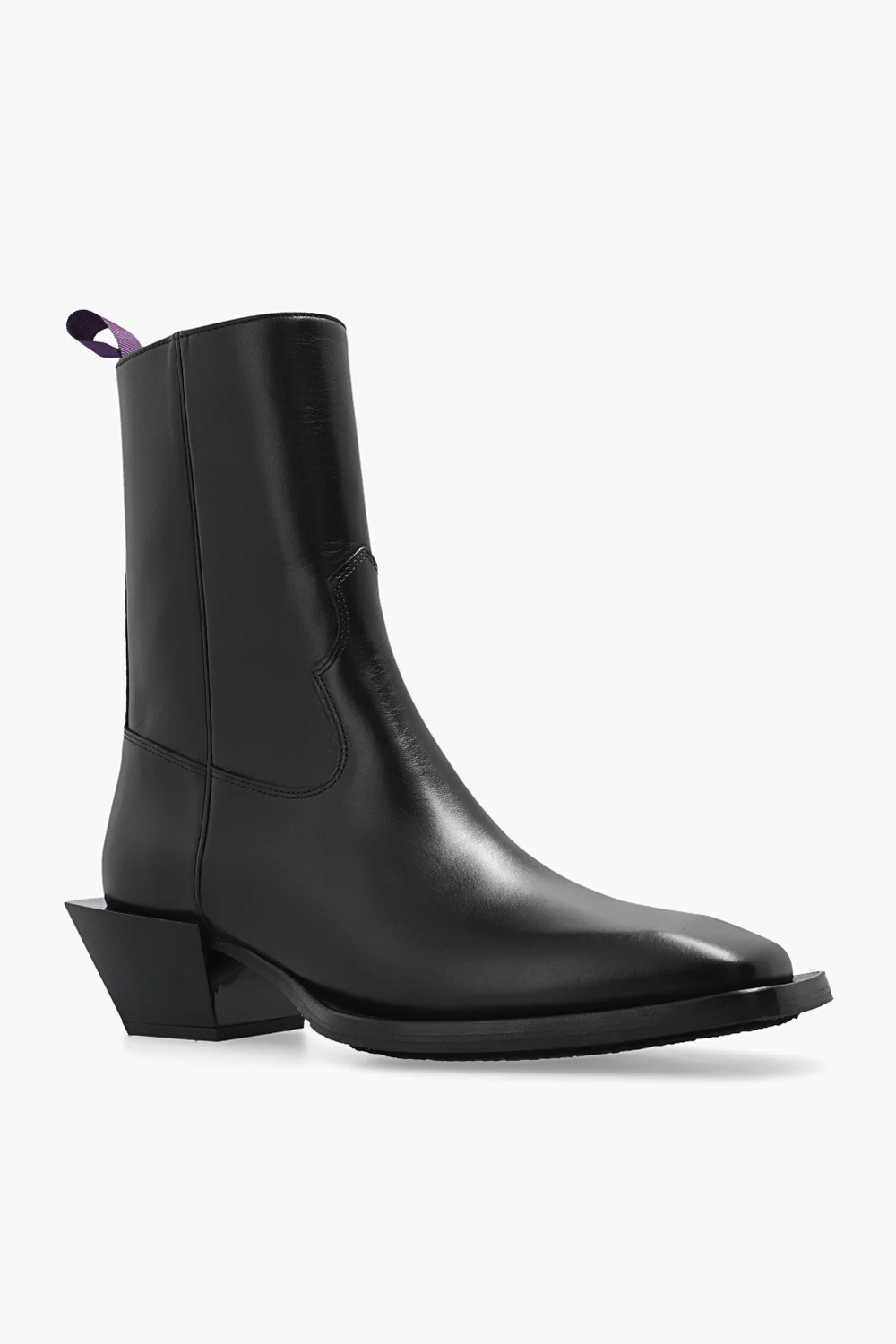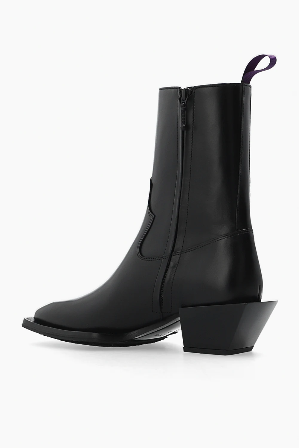 Czarne botki na dekoracyjnym obcasie, model ‘Luciano’ Eytys. Wykonane ze skóry. Z boku zapinane na zamek. Kwadratowy nosek. Z tyłu fioletowy rypsowy pasek. Czarna, gumowa podeszwa.