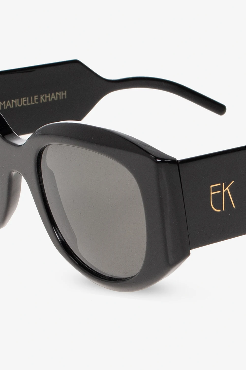 Czarne okulary przeciwsłoneczne Emmanuelle Khanh. Szerokie zauszniki ozdobione logo w kolorze złotym. Szare szkła ze 100% ochroną przed promieniowaniem UV. Wykonane ręcznie we Francji. Dołączone etui.