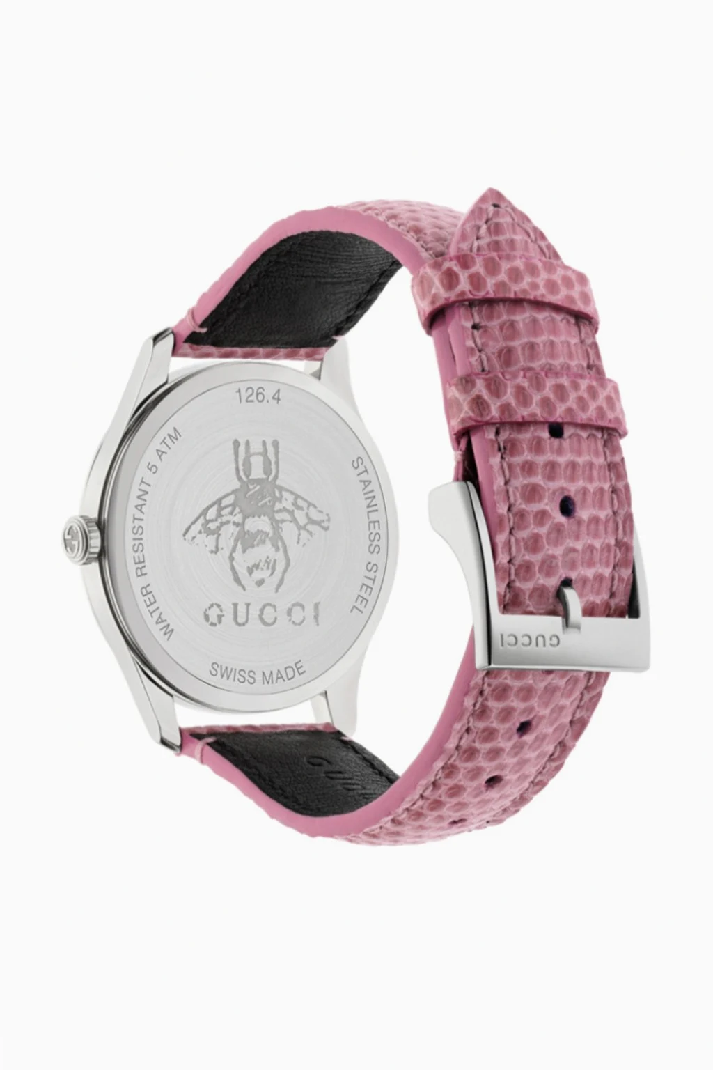Zegarek w kolorze srebrnym Gucci, kolekcja ‘G-Timeless’. Wykonany ze stali. Czarno-różowa tarcza ozdobiona wzorem z motywem gwiazdy, planety i logo w kolorze srebrnym. Różowy pasek wykonany ze skóry jaszczurki. Mechanizm kwarcowy. Wodoodporny do 50 metrów.