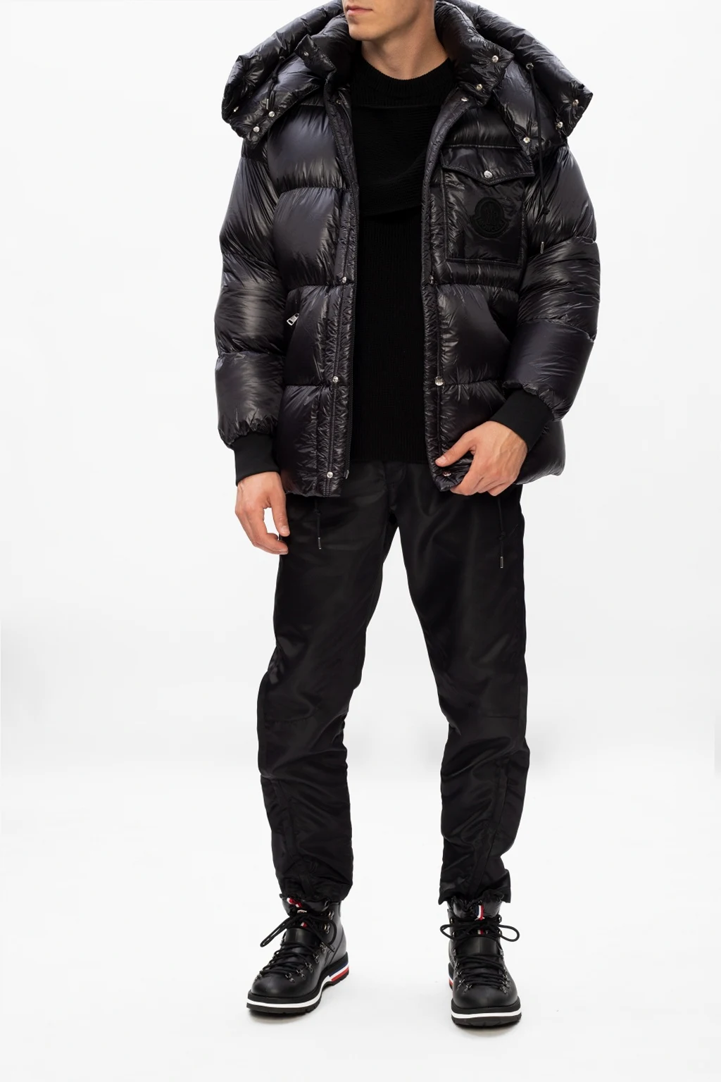 Czarne, sznurowane trapery, model ‘Henoc’ Moncler. Ozdobione granatowo-biało-czerwonymi wstawkami oraz naszywką z logo Wykończone puchową skarpetą.