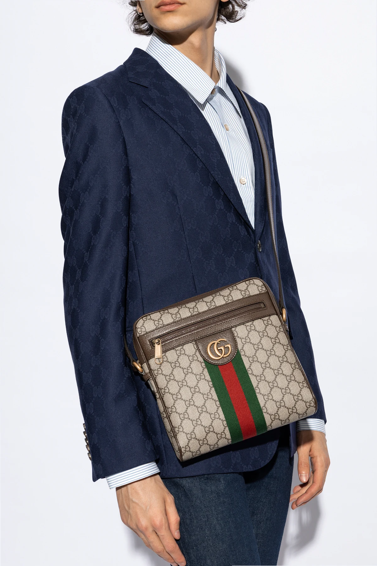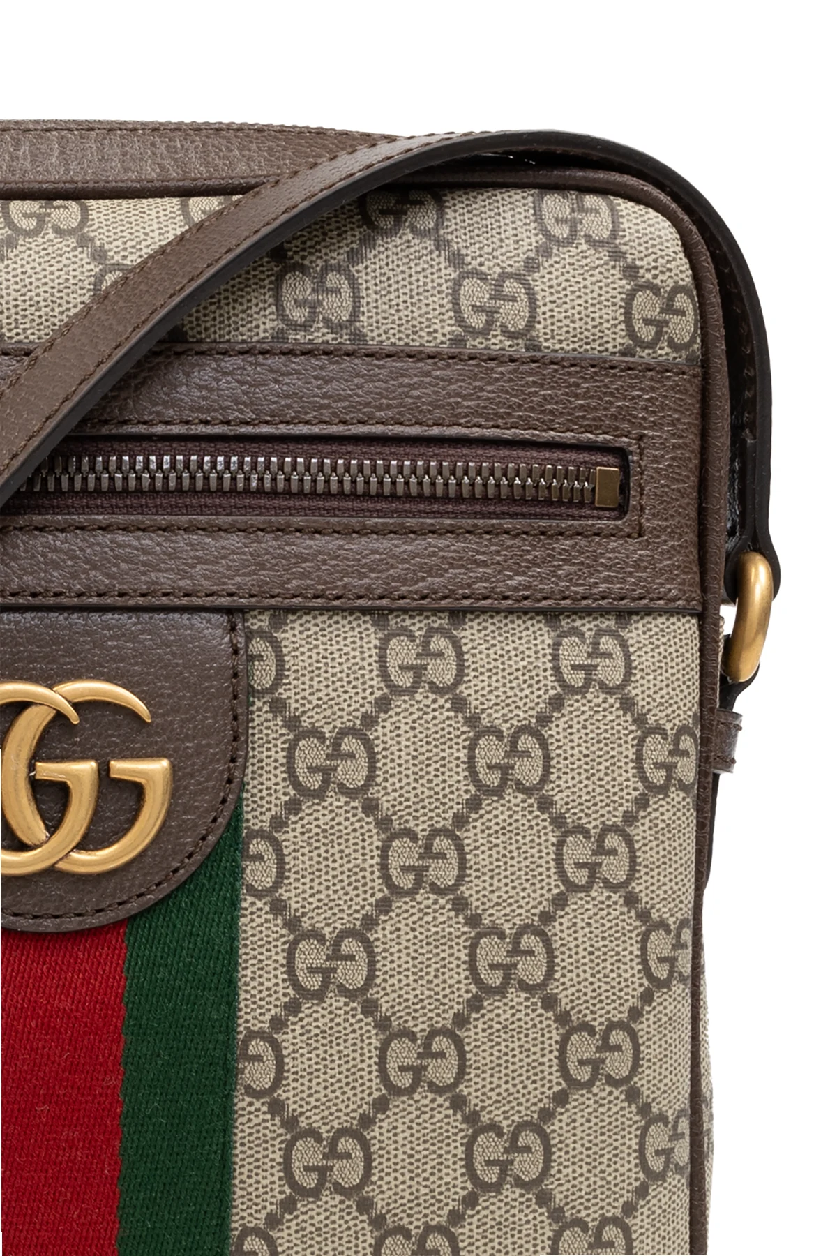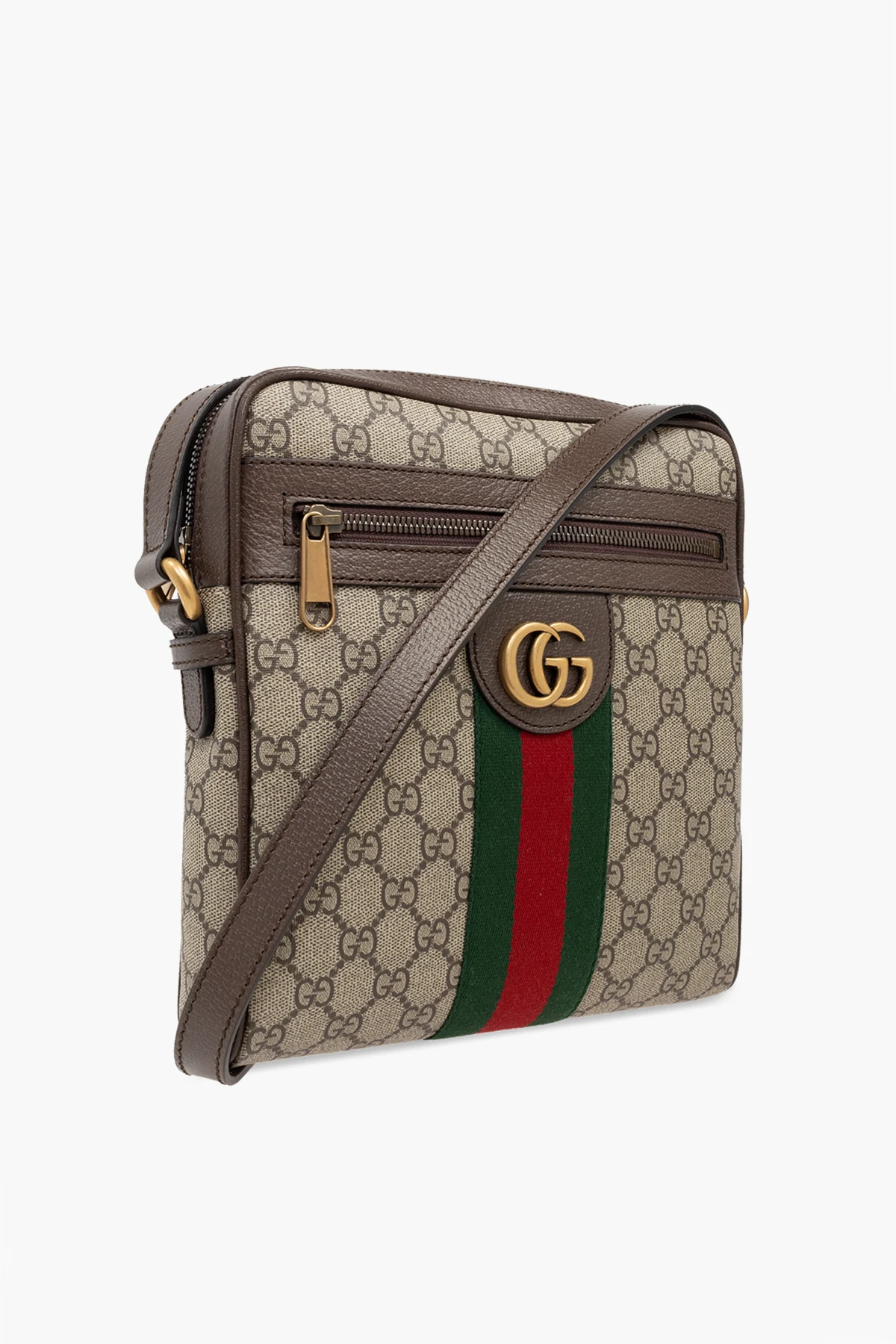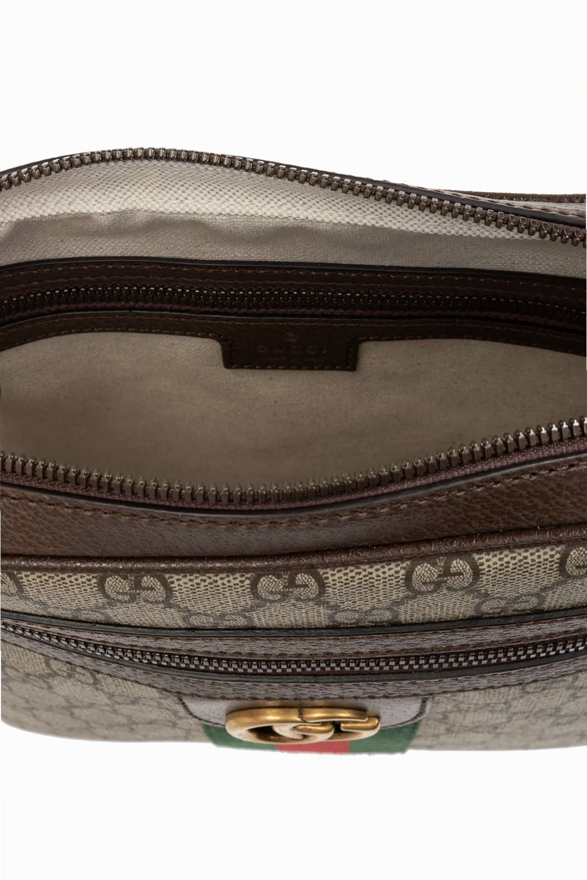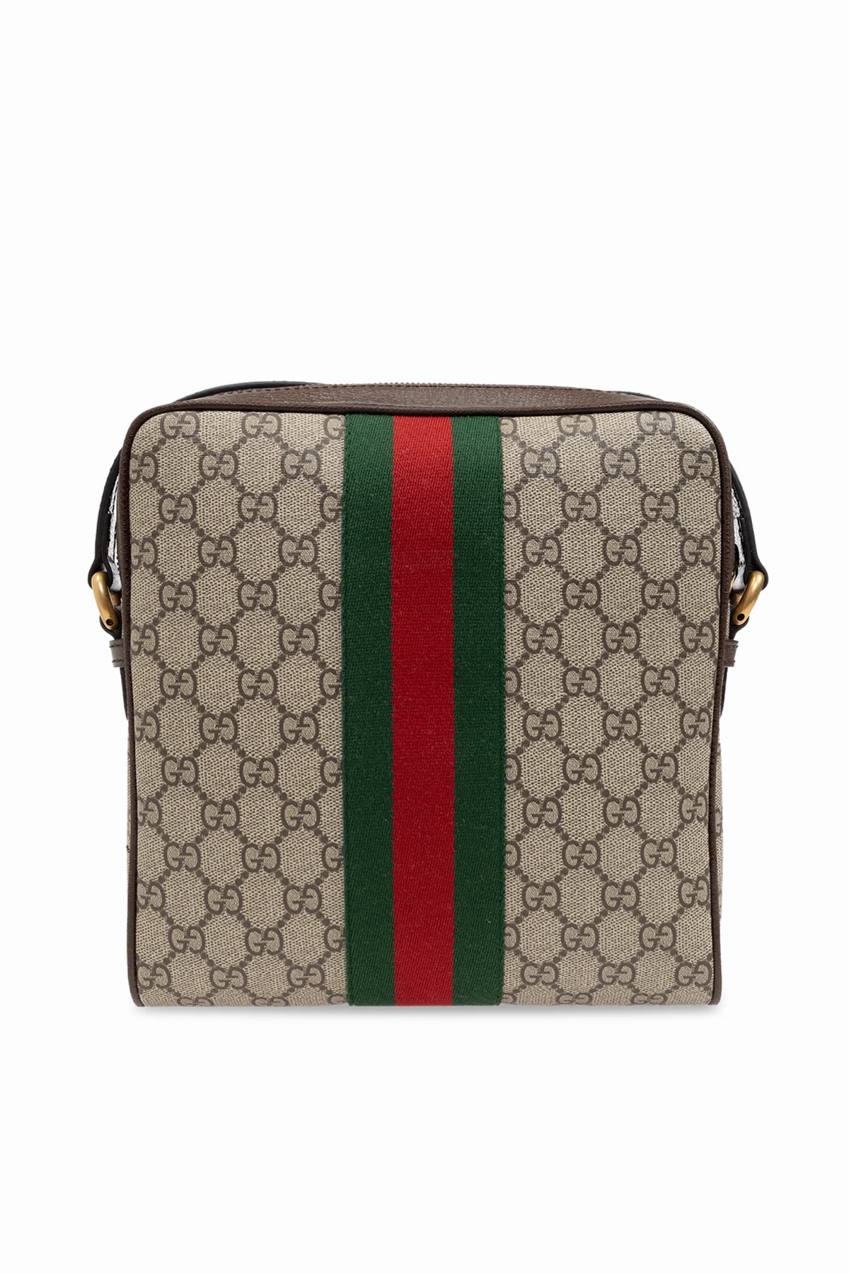 Beżowo-brązowa torba na ramię, model 'Ophidia' Gucci. Wykonana z płótna 'GG Supreme'. Zamykana na zamek. Ozdobiona nadrukowanym, brązowym logo oraz charakterystycznym dla marki paskiem 'Web' w kolorze zielono-czerwono-zielonym. Z przodu kieszeń zamykana na zamek oraz metalowe logo. Regulowany pasek na ramię. Warstwa wewnętrzna w kolorze beżowym. Wewnątrz komora, kieszeń wsuwana oraz kieszeń zamykana na zamek. Metalowe wykończenie w kolorze postarzanego złota.