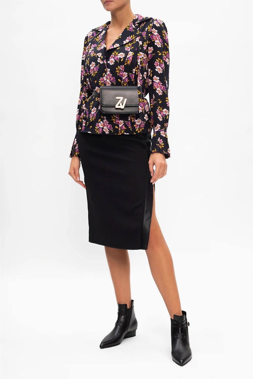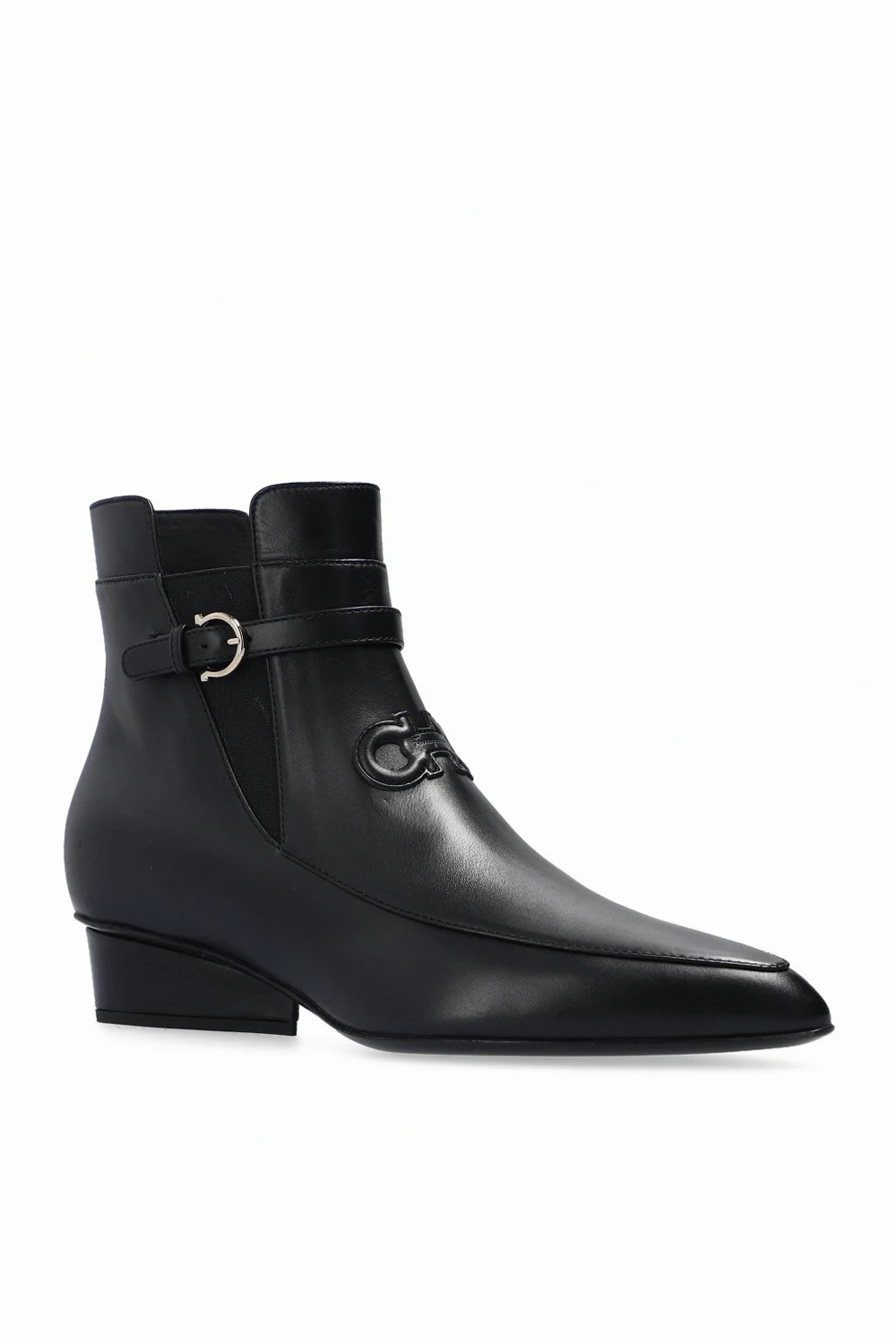 Czarne, wsuwane botki na obcasie, model ‘Mineo’ Salvatore Ferragamo. Po bokach wszyta guma oraz pasek z klamrą. Z przodu naszyta aplikacja z logo. Czarna, skórzana podeszwa.