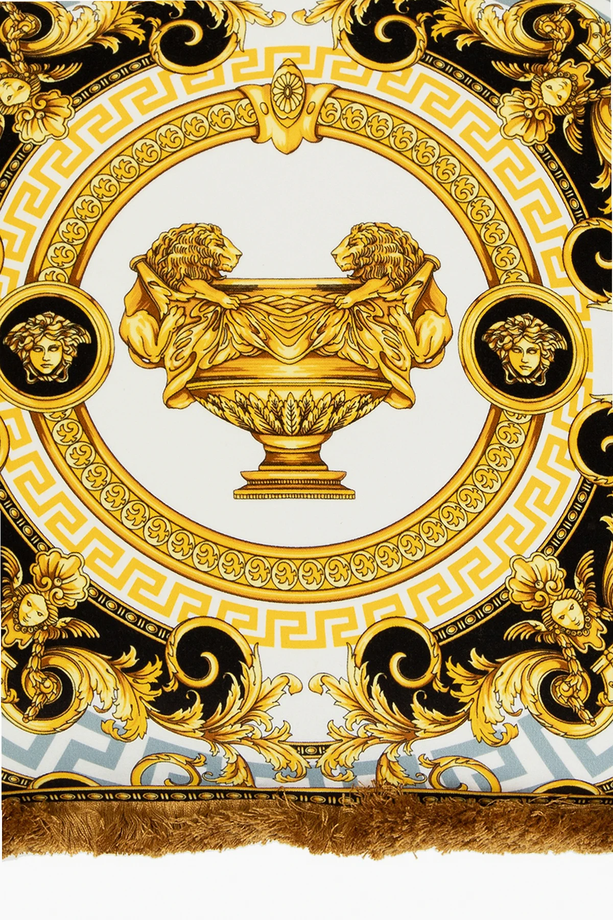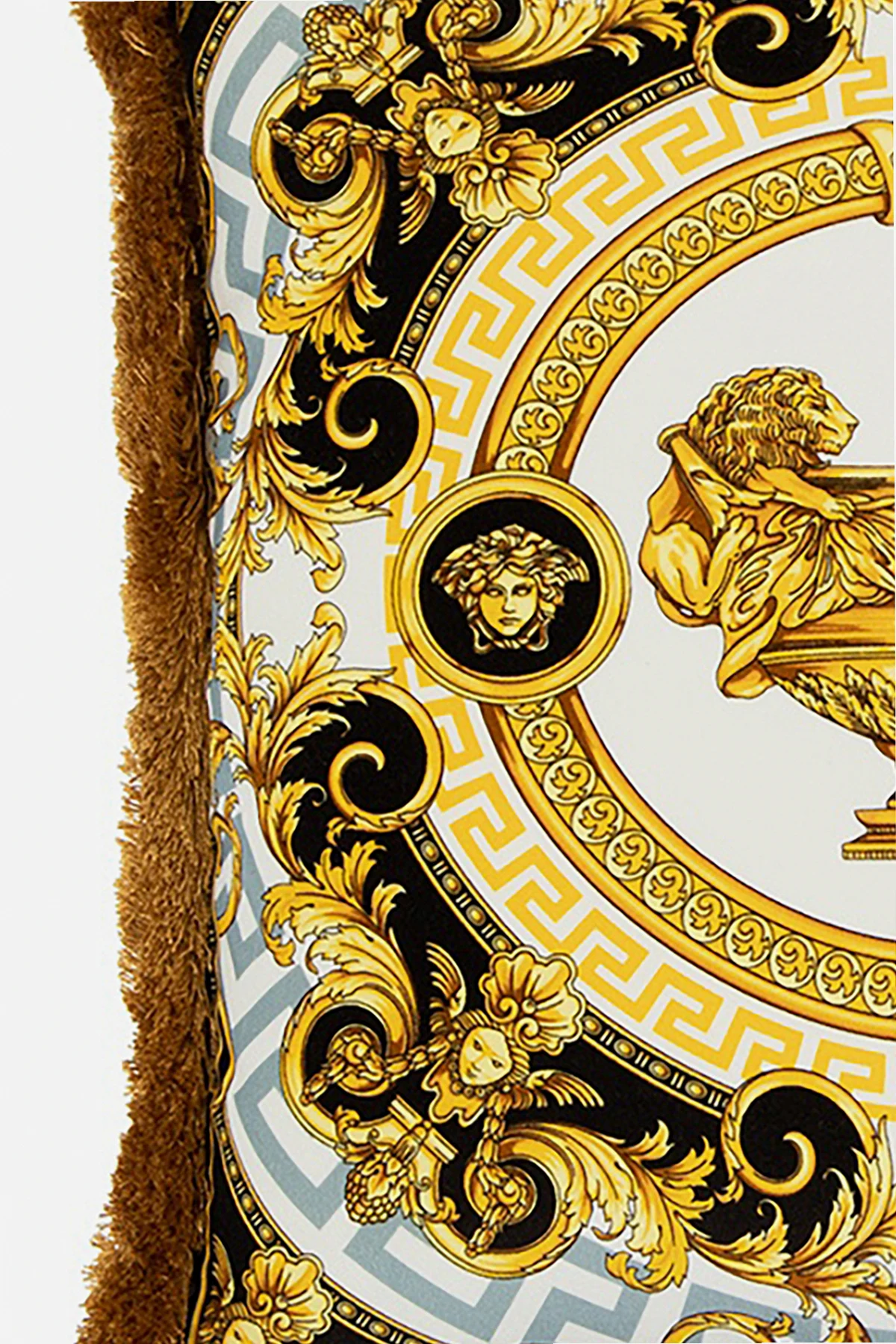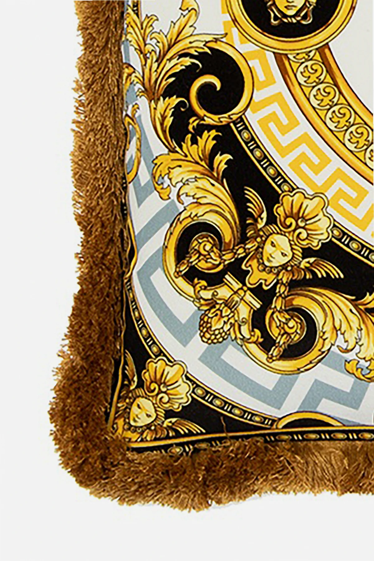 Biała, jedwabna poduszka Versace Home. Ozdobiona charakterystycznym dla marki wzorem barokowym w kolorze żółto-czarno-szarym.
