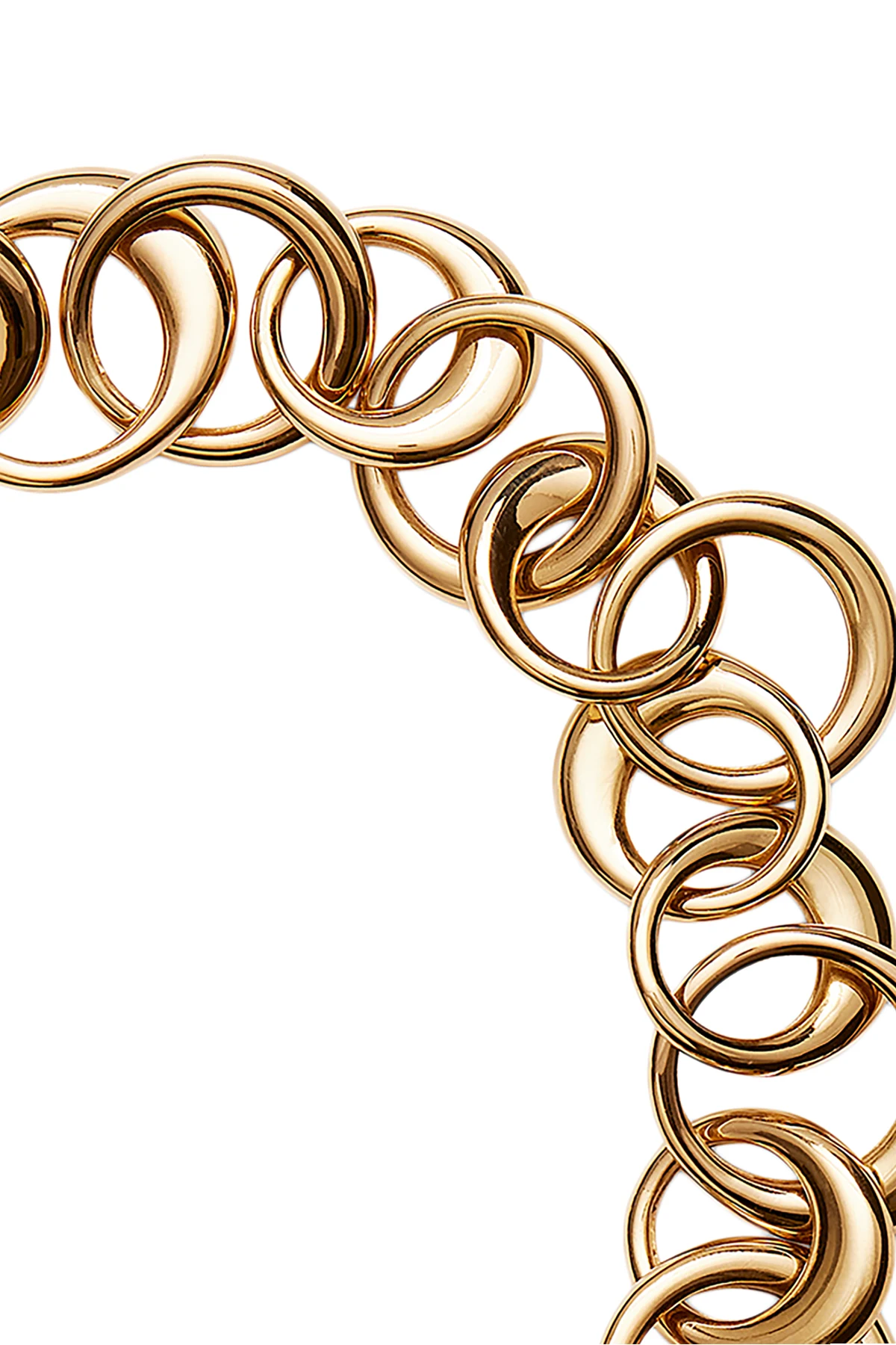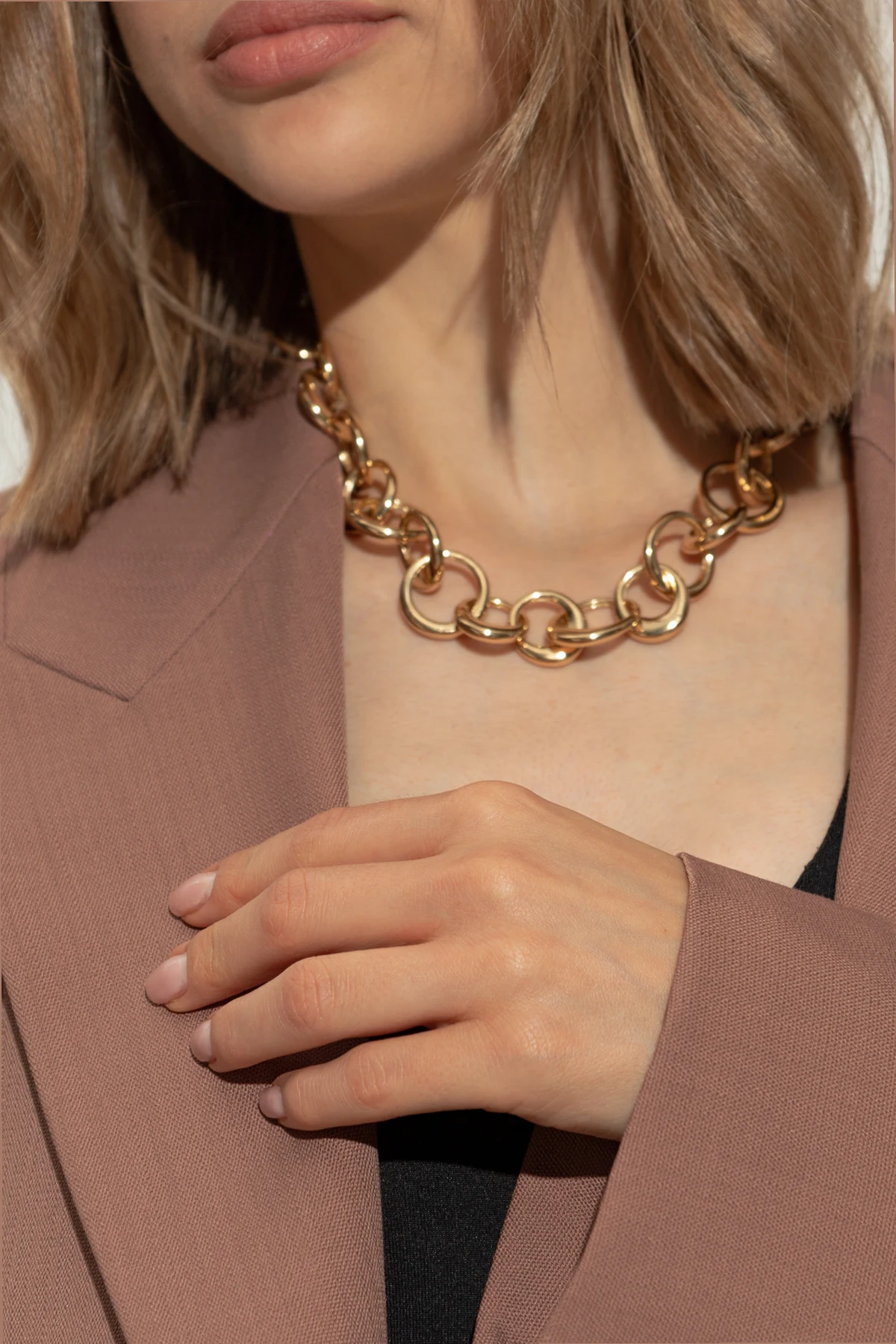Naszyjnik składa się z dużych ogniw w kształcie okręgów, które różnią się wielkością, tworząc dynamiczny i harmonijny wygląd. Ogniwa są gładkie i lśniące, co podkreśla minimalistyczny, ale zarazem elegancki styl. Całość dopełnia funkcjonalne i estetyczne zapięcie typu toggle (przekładane), które zapewnia wygodę użytkowania.