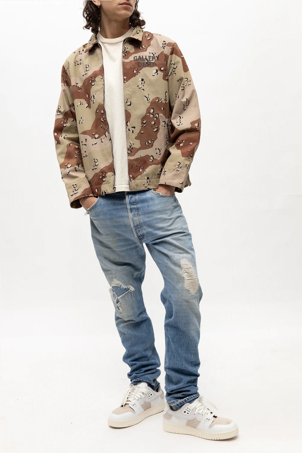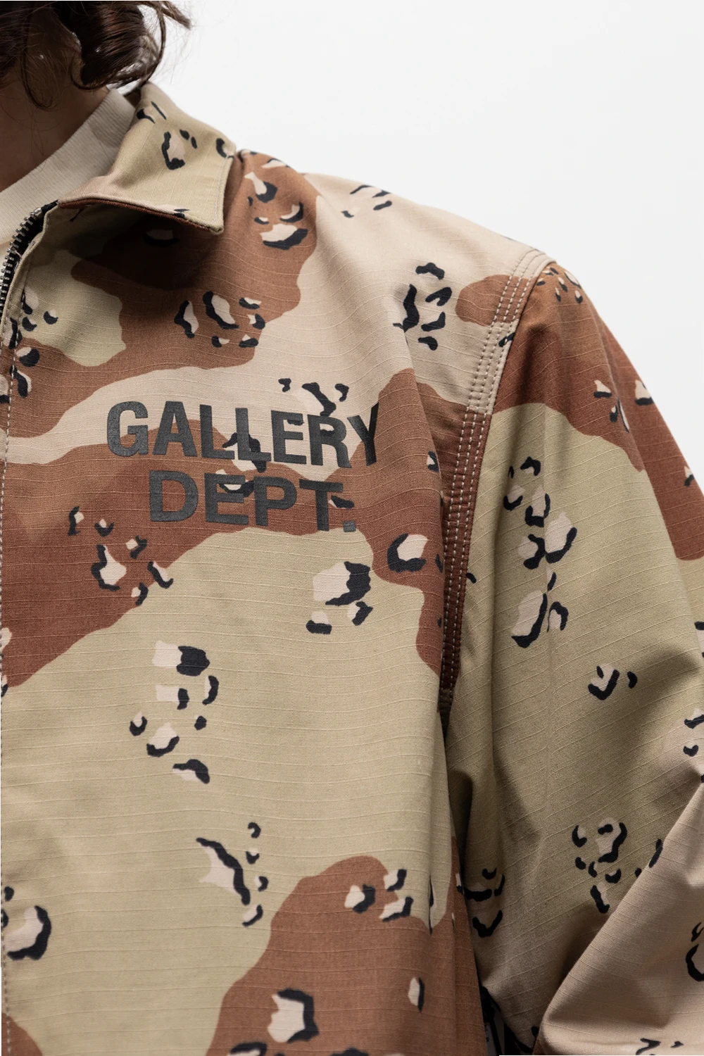 Szaro-zielono-brązowa kurtka GALLERY DEPT. Wykonana z bawełny. Ozdobiona wzorem z motywem ‘moro’. Dwie kieszenie wsuwane. Długie rękawy.