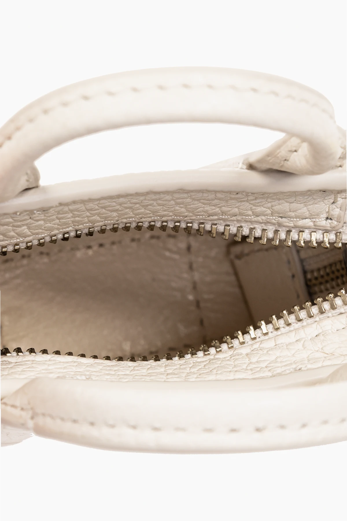 Ekskluzywne detale, takie jak logo projektanta i metalowy łańcuszek.