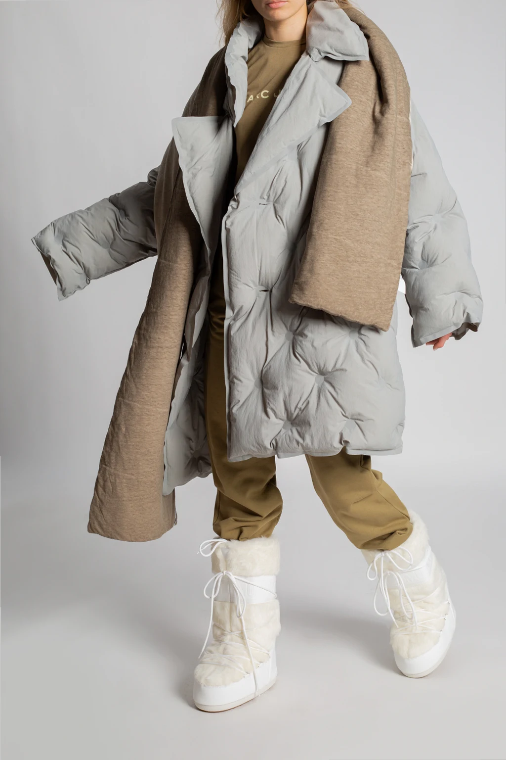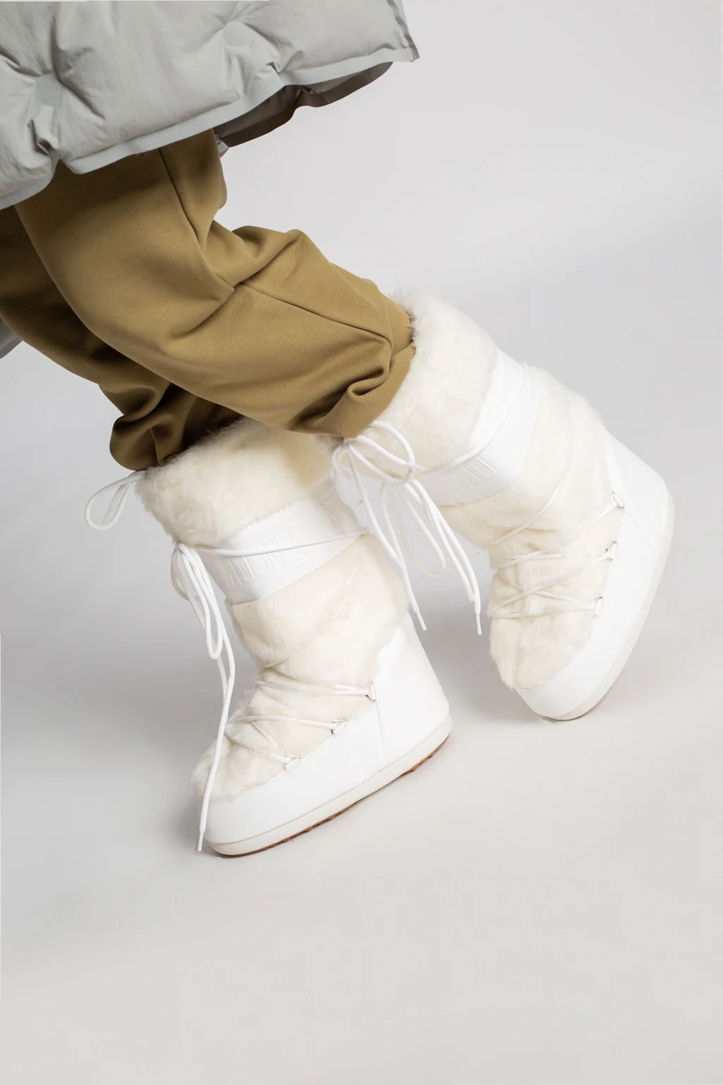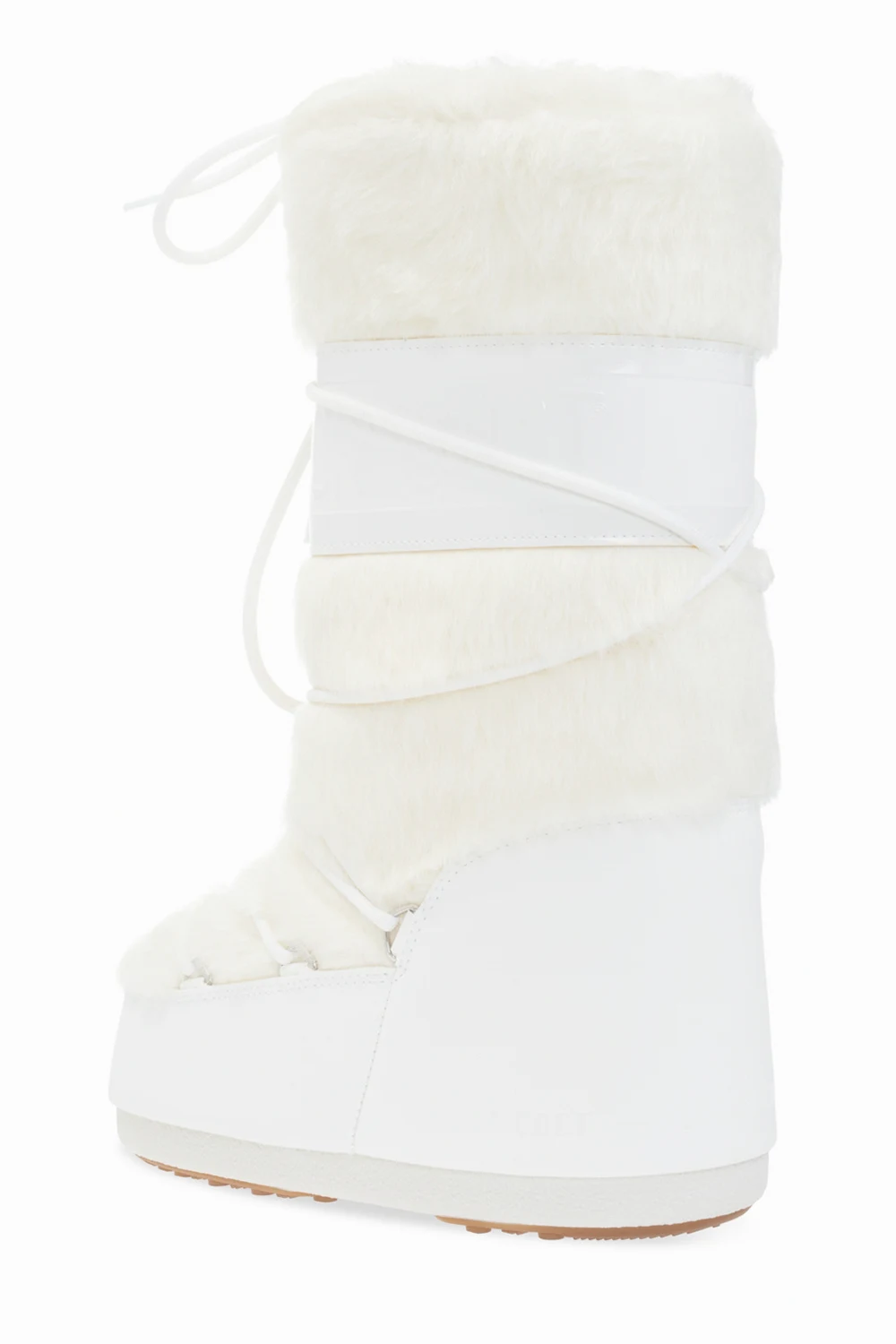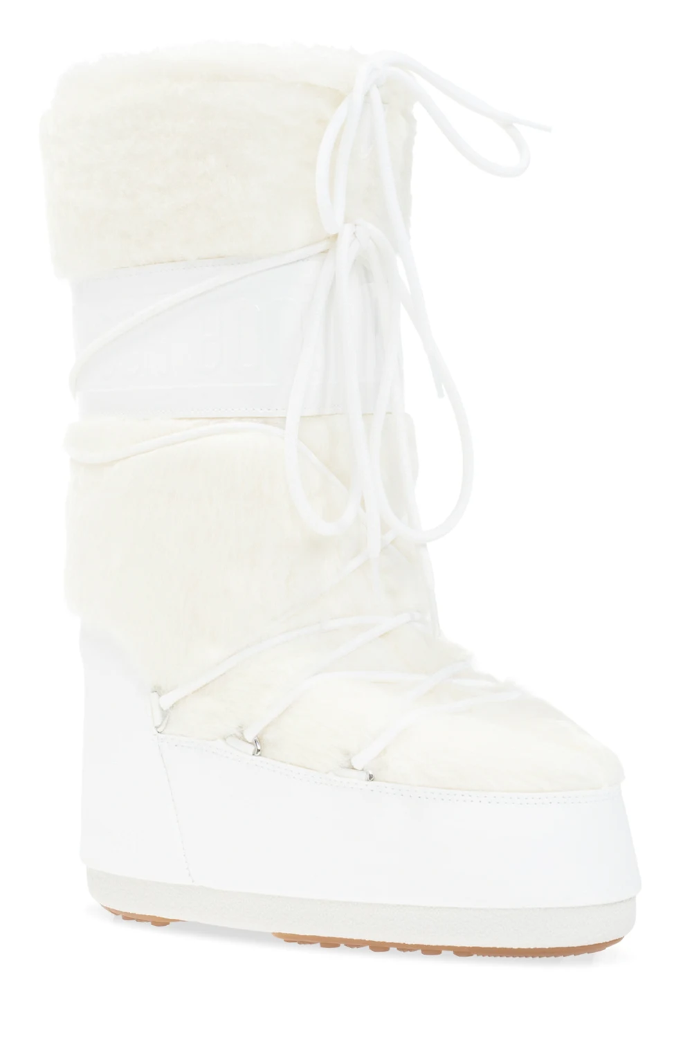 Kremowo-białe śniegowce, model ‘Classic Faux Fur’ Moon Boot. Wykończone syntetycznym futrem. Naszywka z wypukłym logo. Dekoracyjne sznurowanie. Biało-brązowa, gumowa podeszwa. Metalowe elementy w kolorze srebrnym. Śniegowce inspirowane specyficznym kształtem i technologią butów dla astronautów, zaprojektowane w 1969 roku, kiedy pierwszy człowiek stanął na Księżycu.