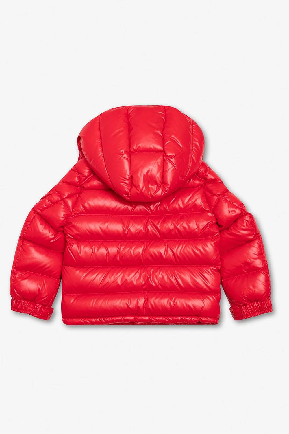 Czerwona, pikowana kurtka puchowa, model ‘New Maya’ Moncler Kids. Zapinana na zamek. Odpinany kaptur z zapięciem na zatrzaski. Na rękawie naszywka z logo. Trzy kieszenie: dwie zapinane na zamek i z patką zapinaną na zatrzask. Długie rękawy zakończone ściągaczem i zapięciem na zatrzask.
