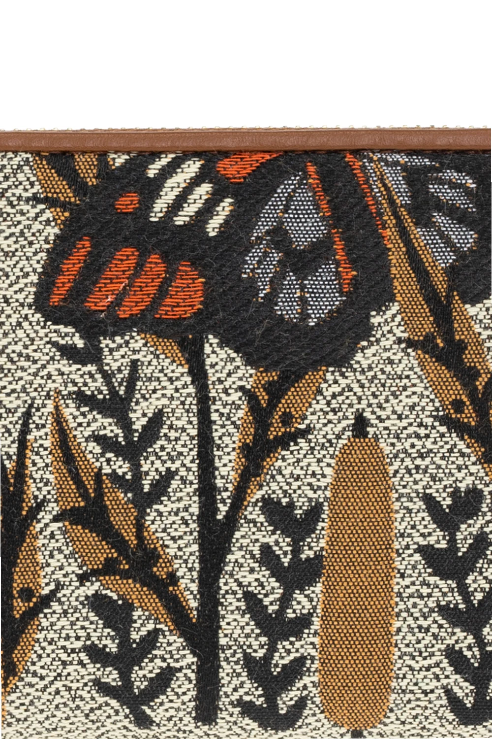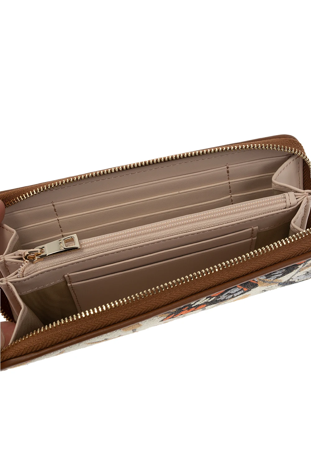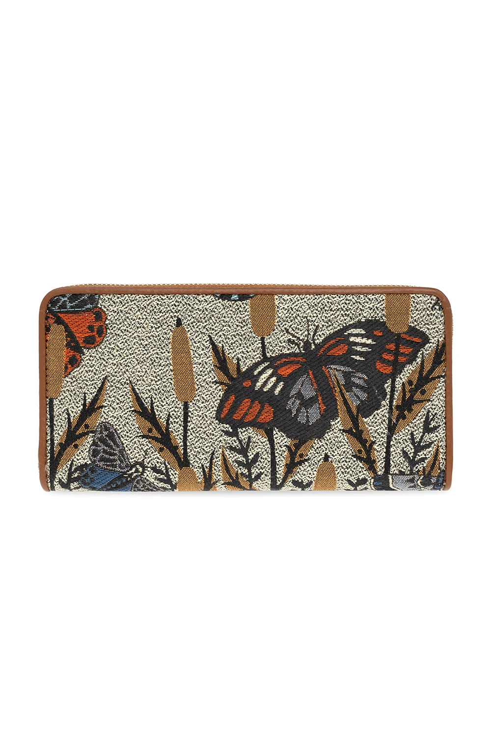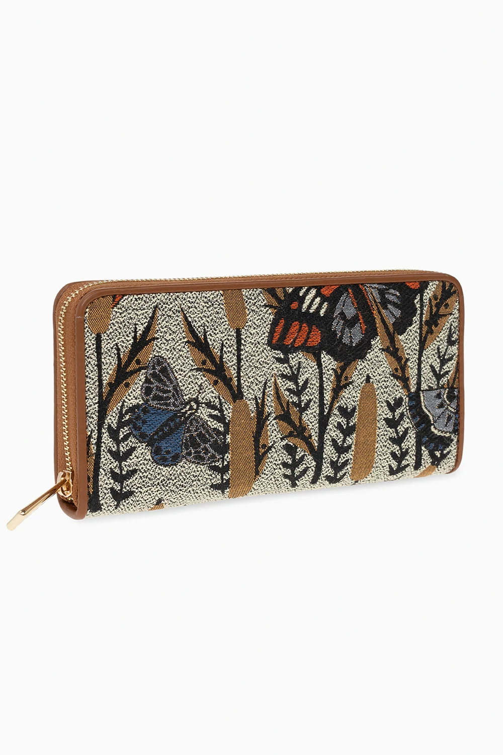 Kolorowy portfel, model ‘Opportunity M’ Furla. Wykończony skórą cielęcą. Zamykany na metalowy zamek w kolorze złotym. Ozdobiony żakardowym wzorem z motywem motyla. Kremowa warstwa wewnętrzna. Wewnątrz dwie przegrody na banknoty, kieszeń na monety zamykana na zamek oraz dziesięć miejsc na karty.