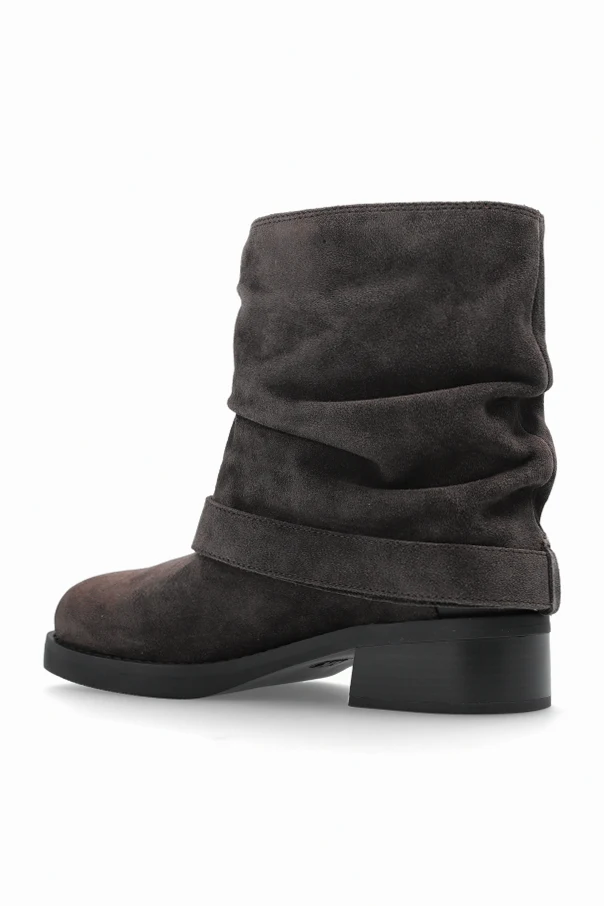 Zamszowe botki „Colby” to kwintesencja ponadczasowej elegancji w nowoczesnym wydaniu. Szlachetny, brązowy zamsz o gładkiej, matowej strukturze został finezyjnie zestawiony z szeroką cholewką o delikatnym marszczeniu, co nadaje obuwiu lekkość i swobodny charakter. Płaska podeszwa oraz niski, szeroki obcas zapewniają niebywały komfort użytkowania, zaś kwadratowy nosek subtelnie wyróżnia model na tle klasycznych botków.