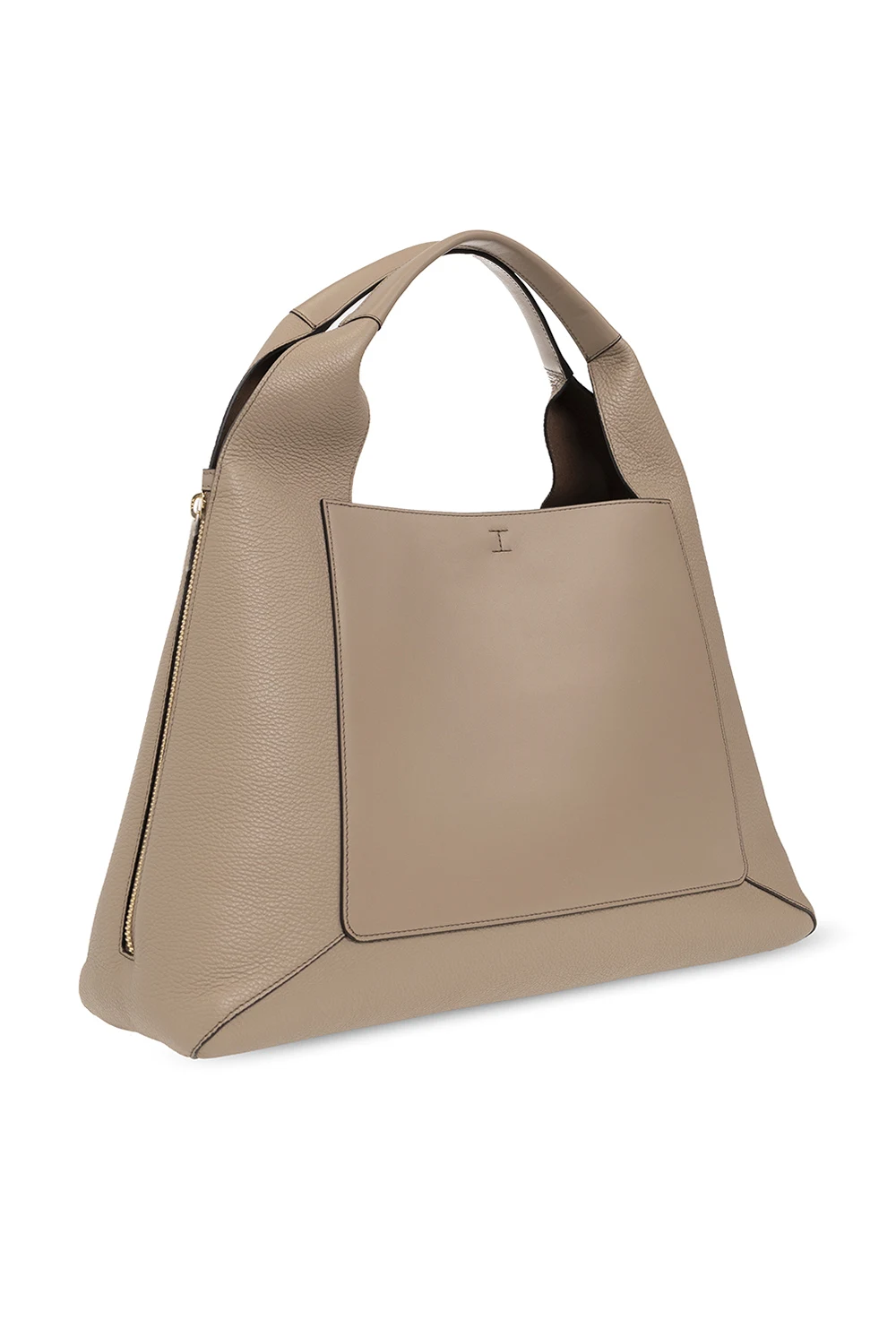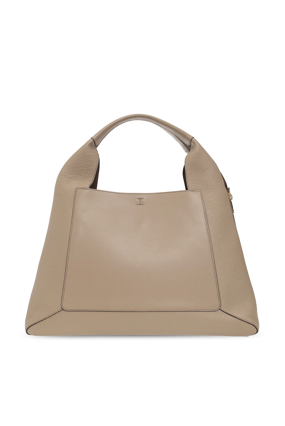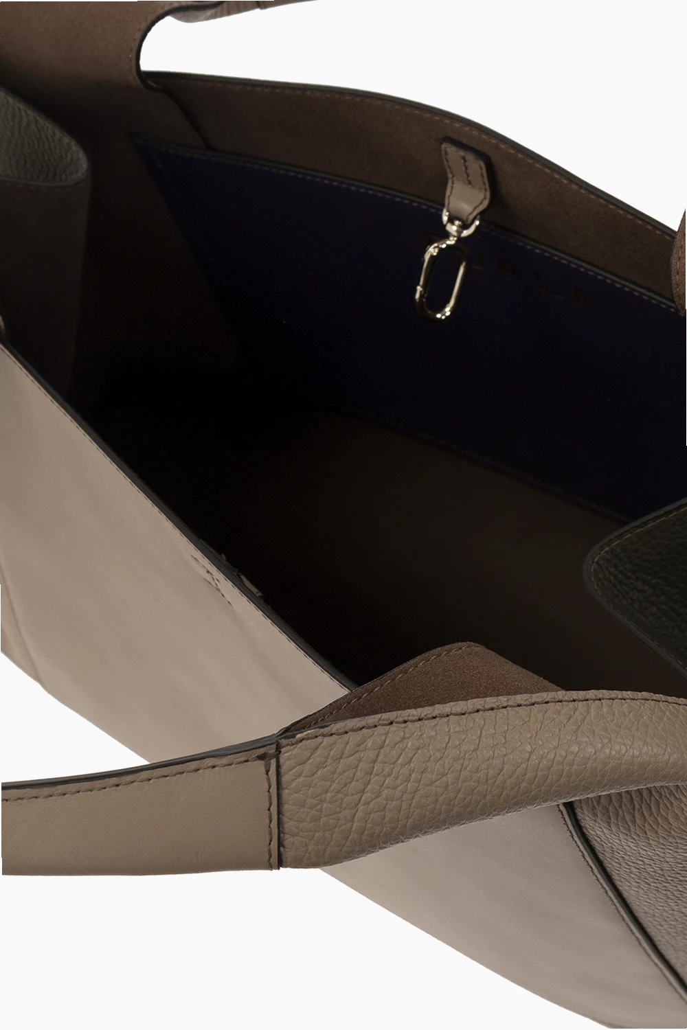 Beżowoszara torba typu ‘shopper’, model ‘Gilda XL’ Furla. Wykonana z owczej skóry o różnych fakturach: ziarnistej i gładkiej. Zamykana na karabińczyk. Rozsuwana po bokach, wstawki w kolorze khaki. Dwie rączki. Wewnątrz komora z dwiema wsuwanymi kieszeniami. Metalowe wykończenie w kolorze złotym.