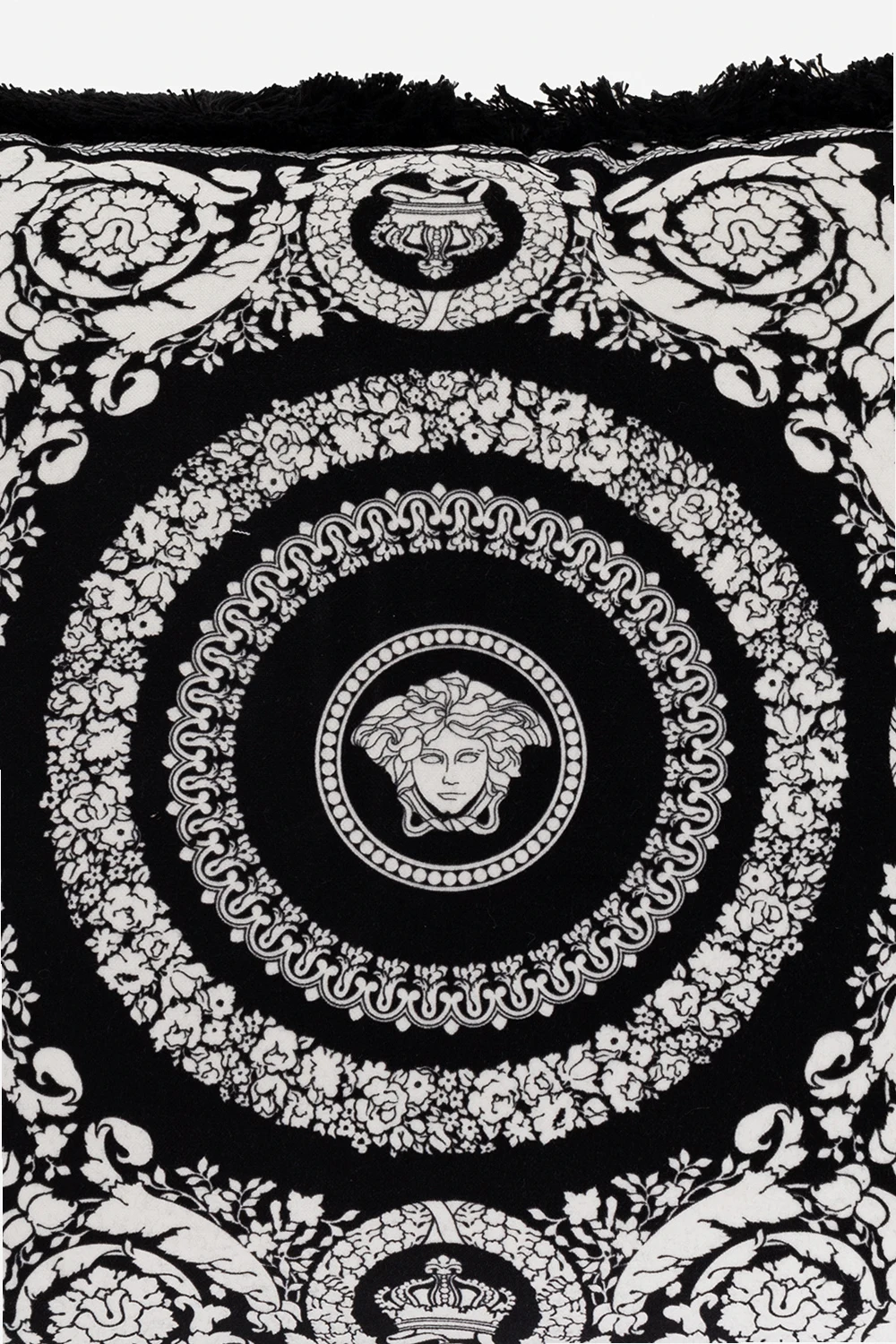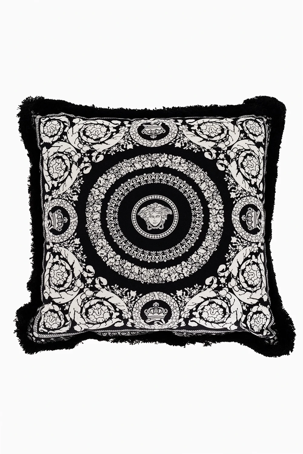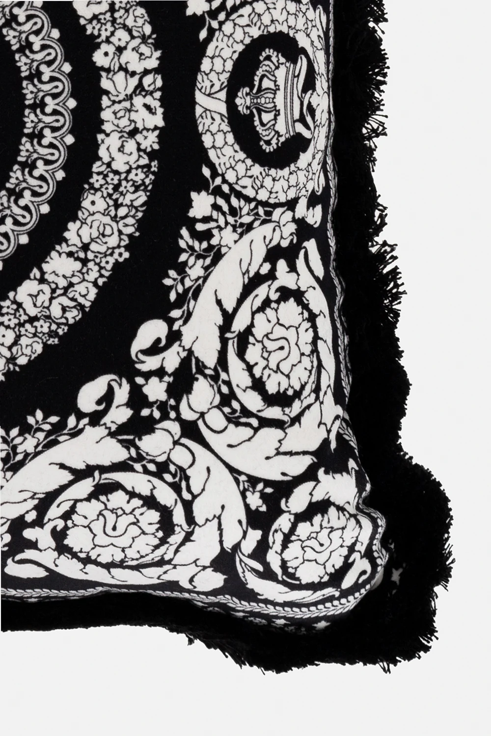 Czarno-biała, welurowa poduszka Versace Home. Ozdobiona charakterystycznym dla marki wzorem ’Barocco Foulard’. Brzegi wykończone frędzlami.